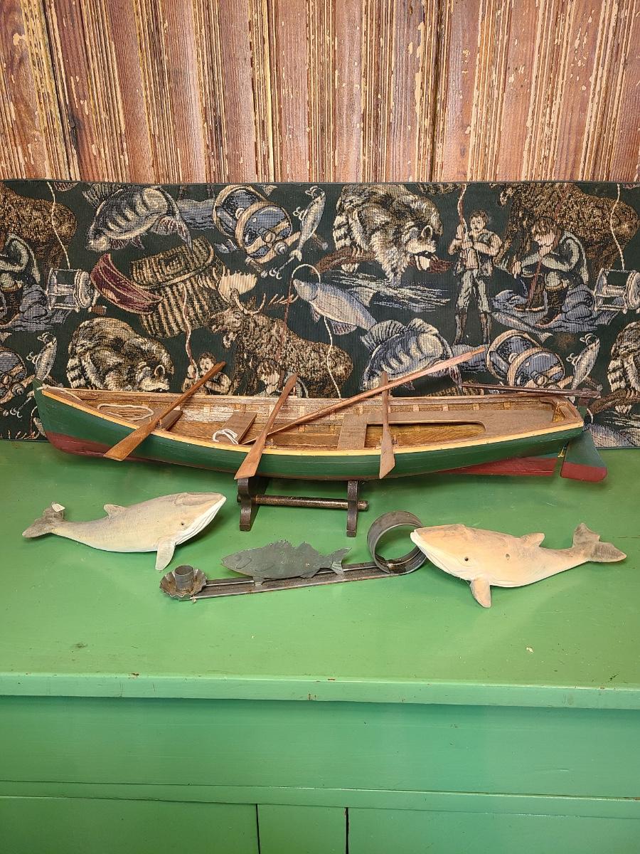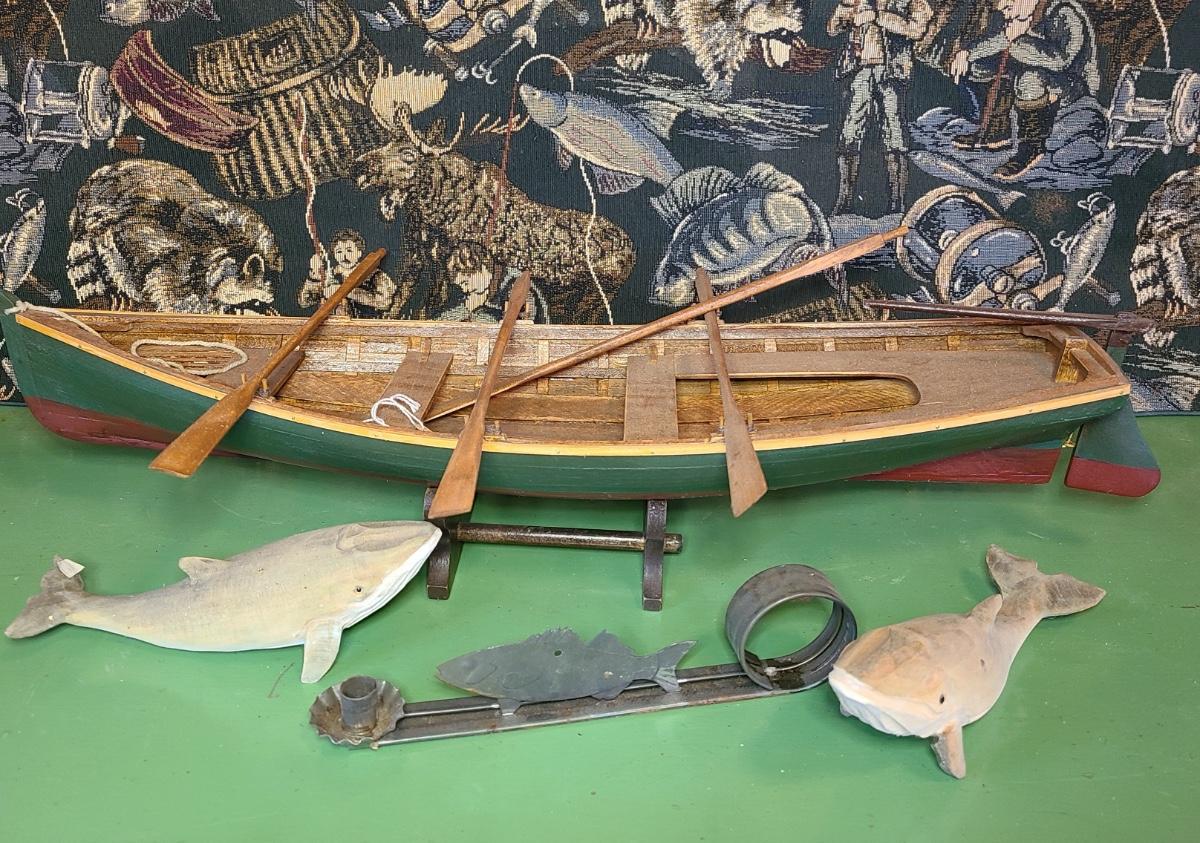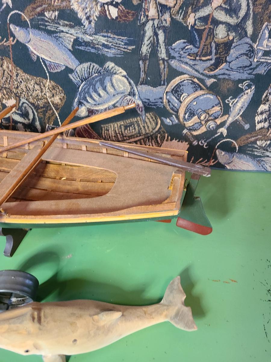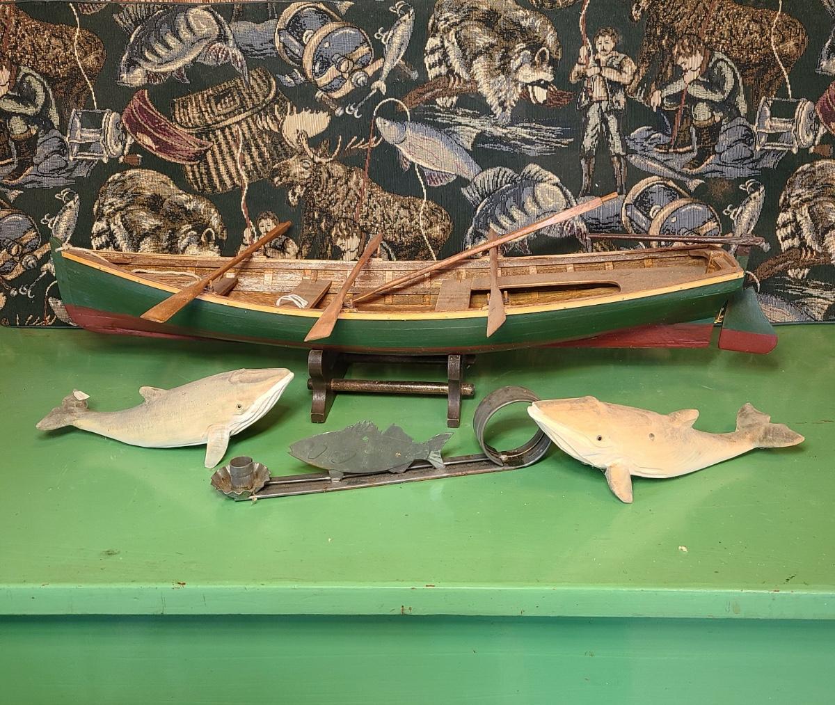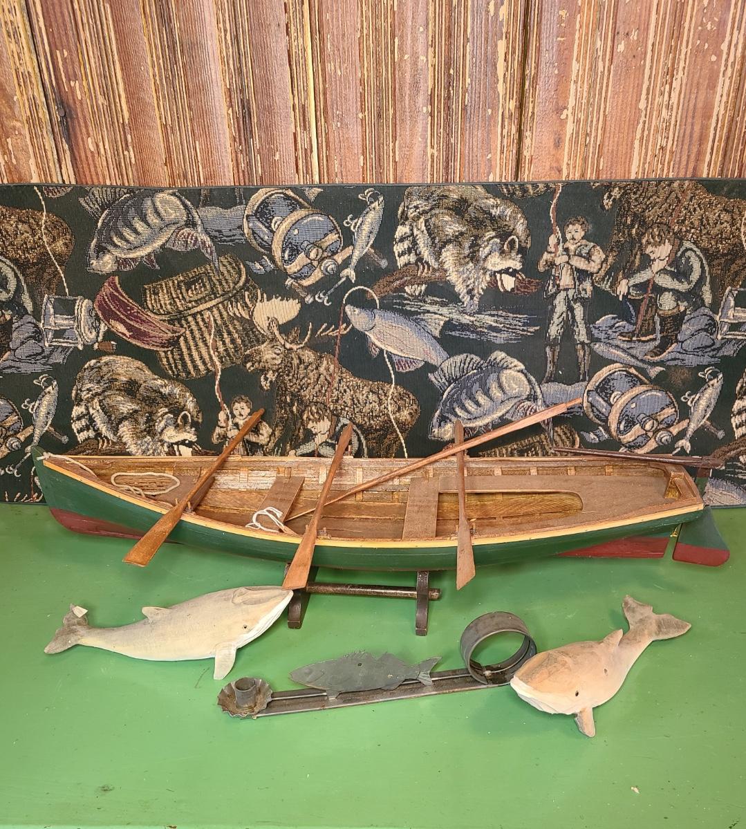 LOT 60: Wood Carved Whales, Wood Carved Boston Tender with Oars, Fishing Tapestry and More