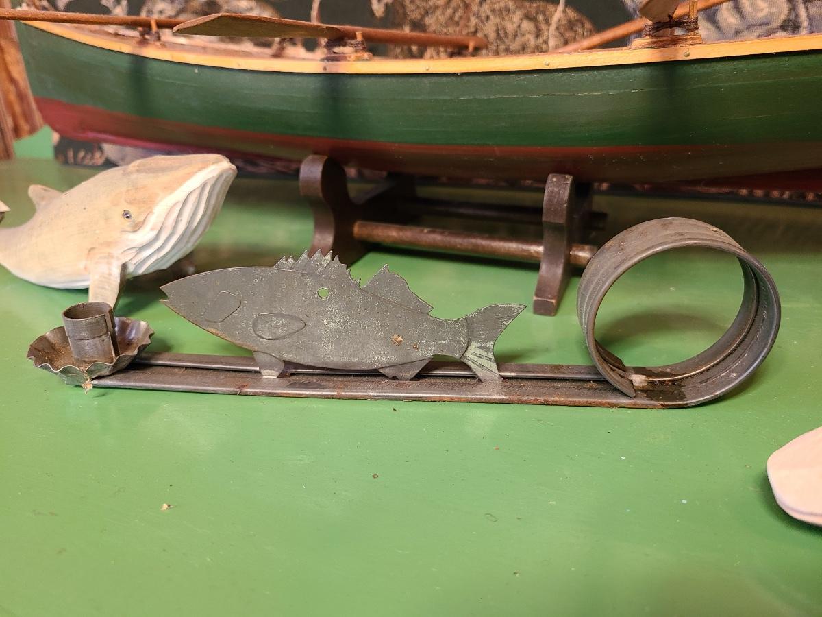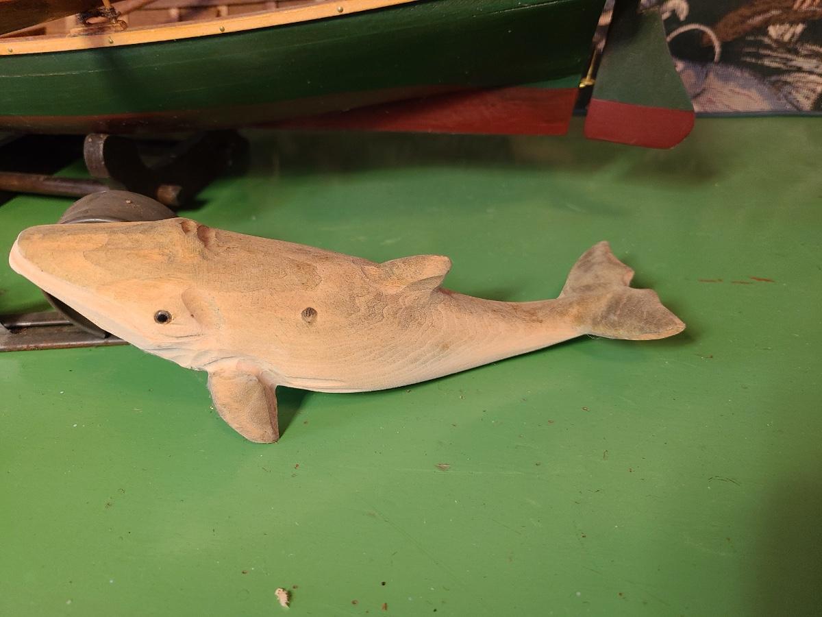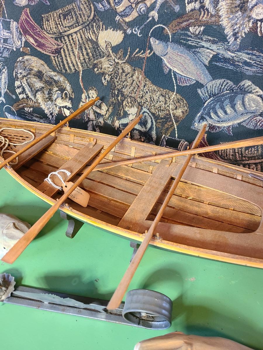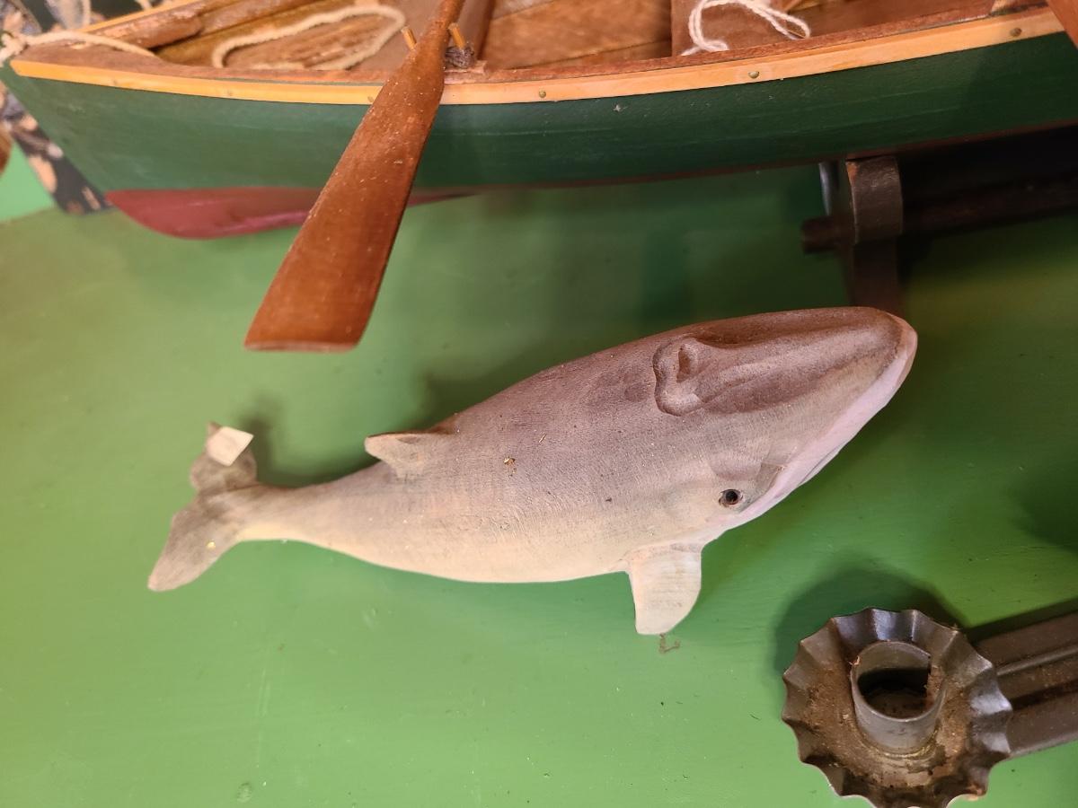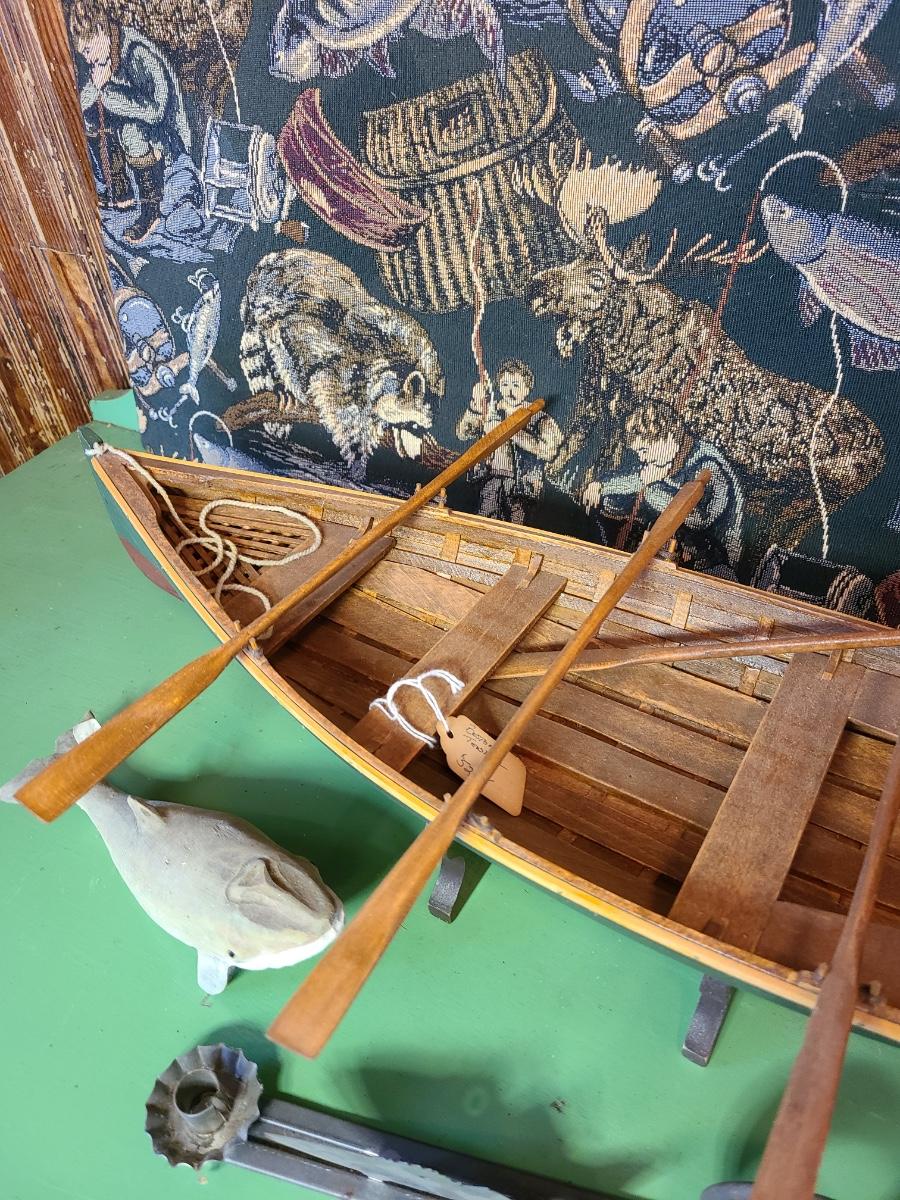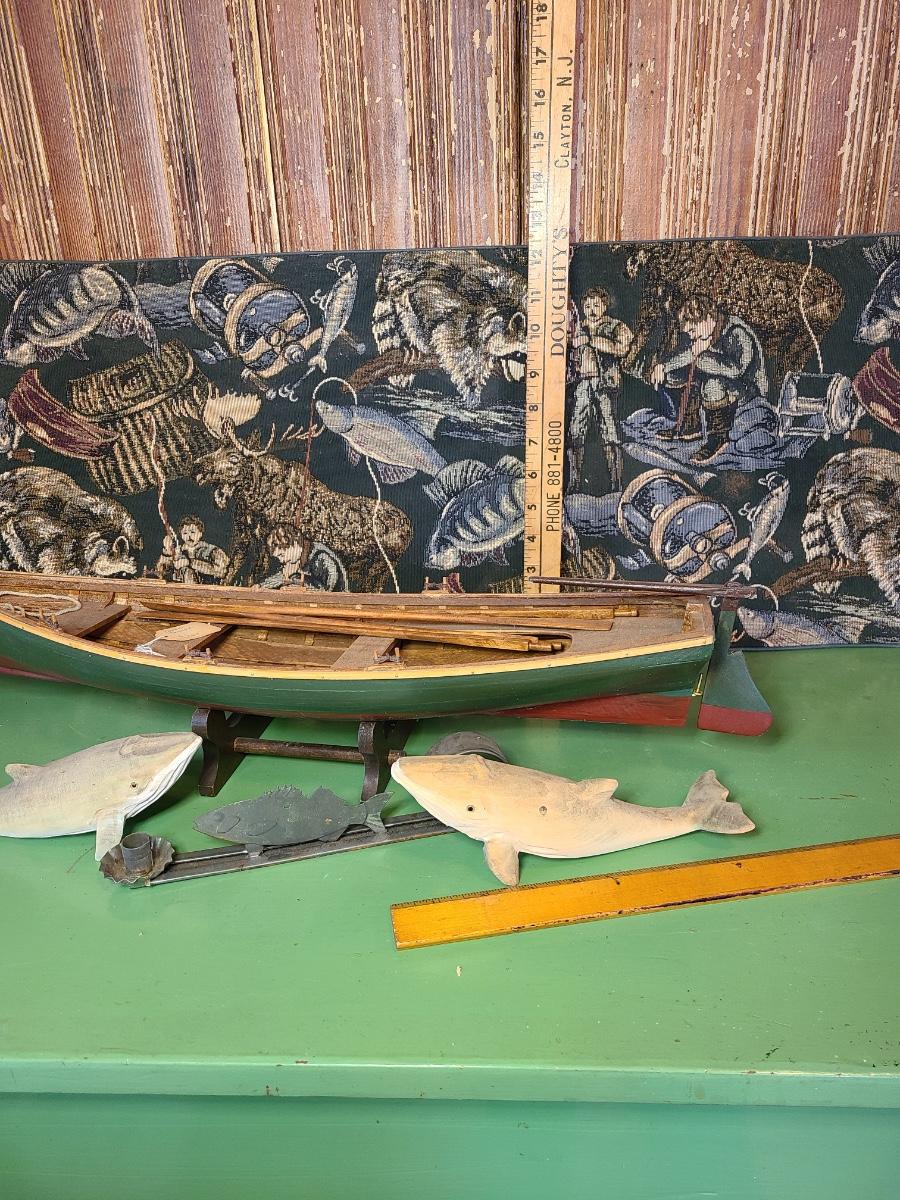 LOT 60: Wood Carved Whales, Wood Carved Boston Tender with Oars, Fishing Tapestry and More