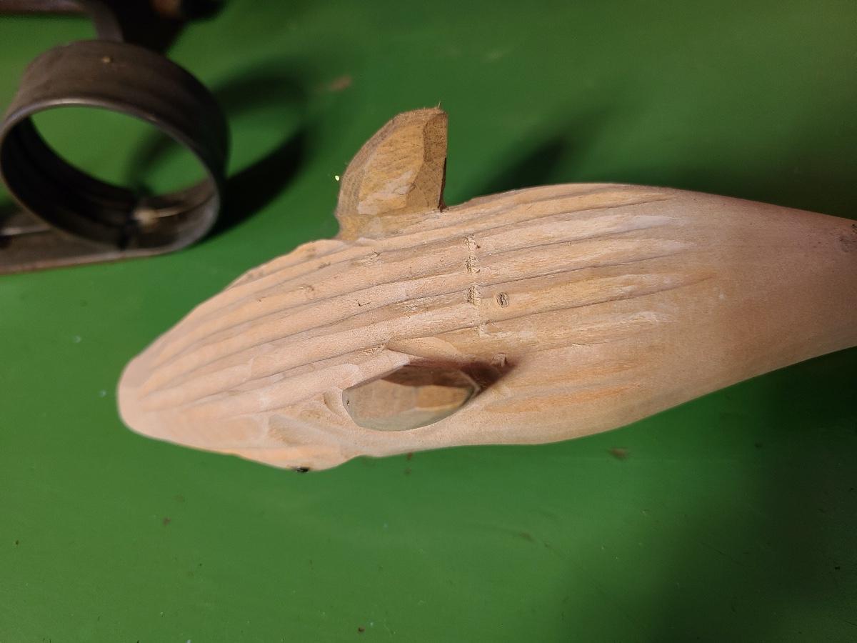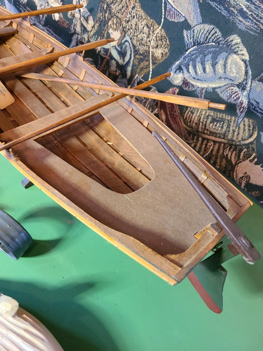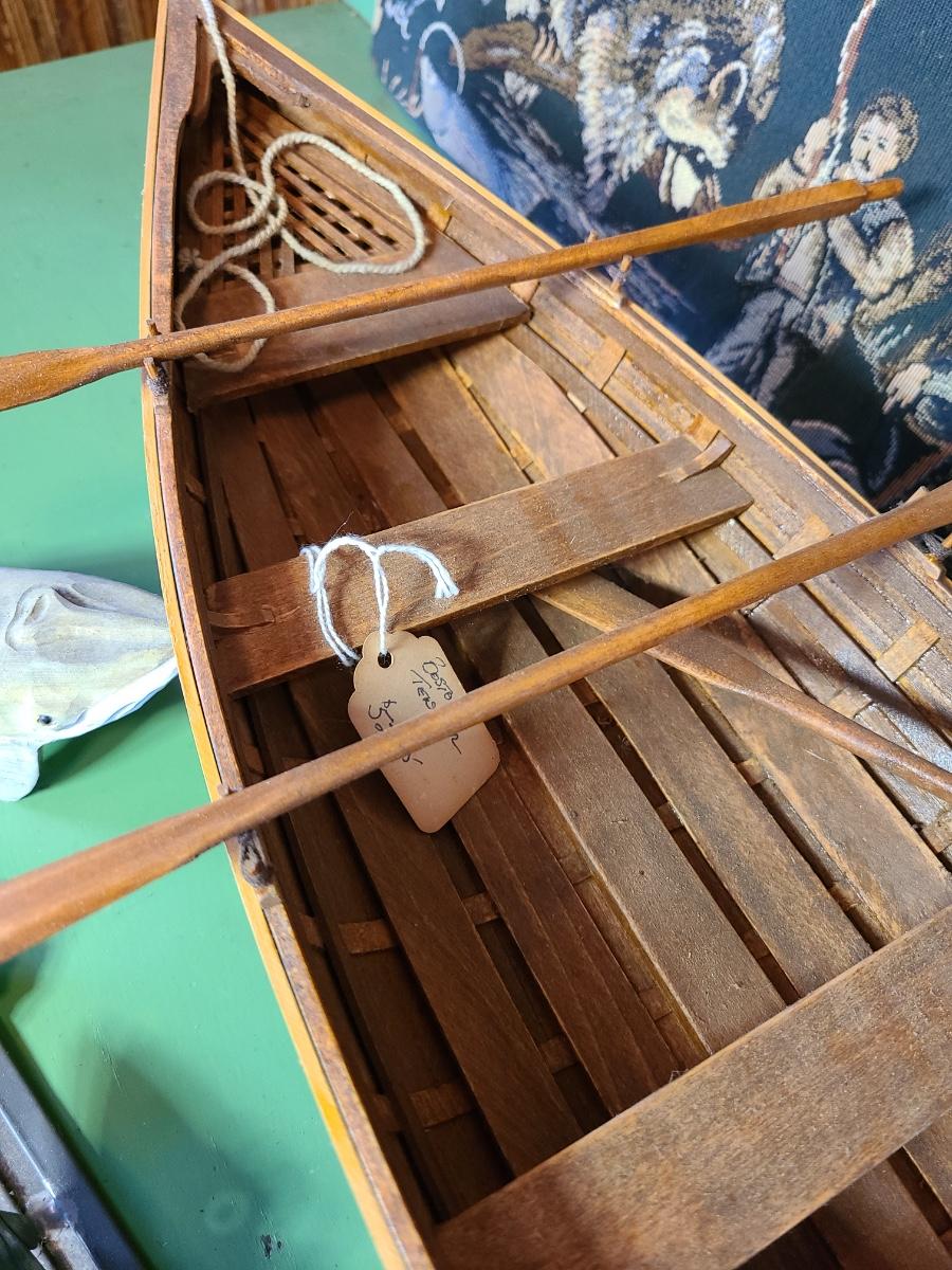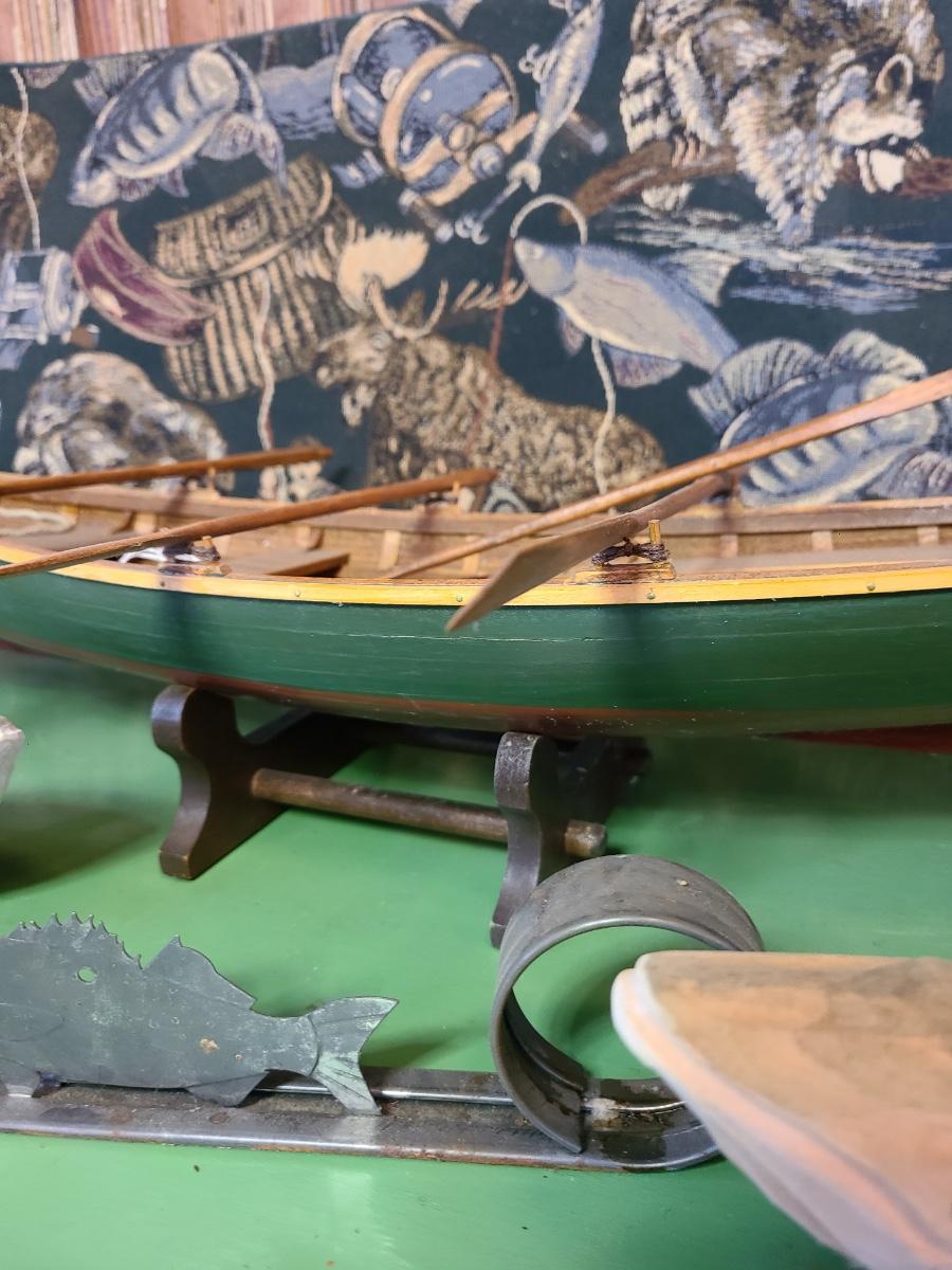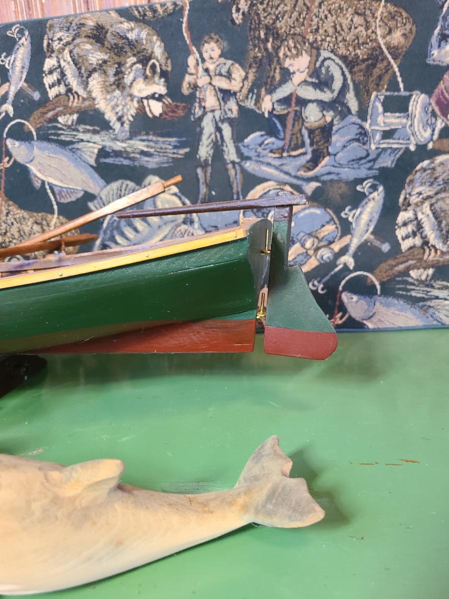 LOT 60: Wood Carved Whales, Wood Carved Boston Tender with Oars, Fishing Tapestry and More