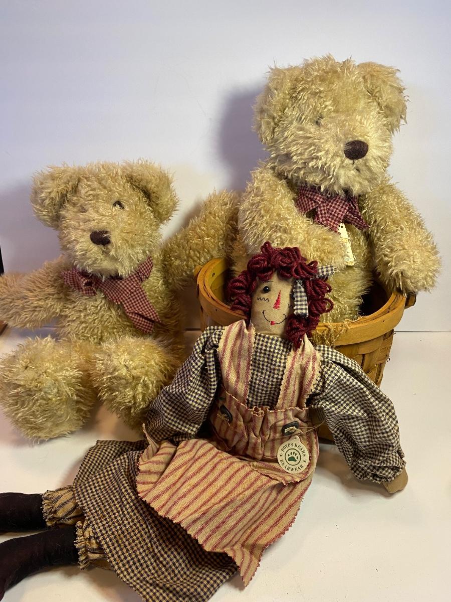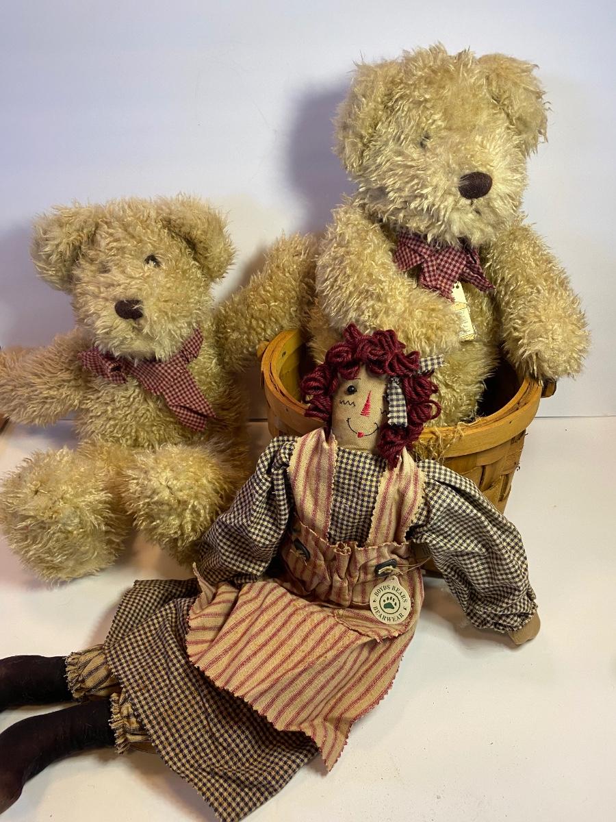 LOT 80G: Basket of Plush Bears and Boyd's Primitive Doll
