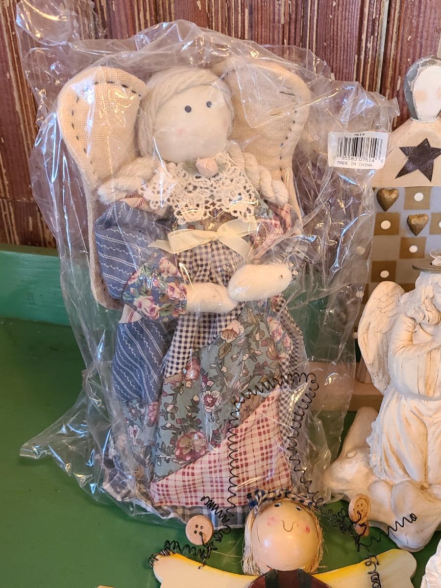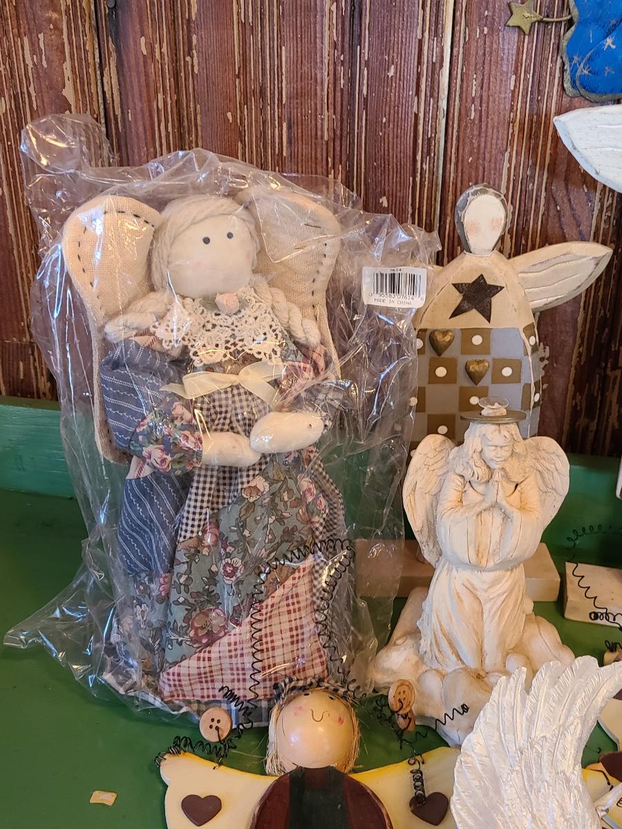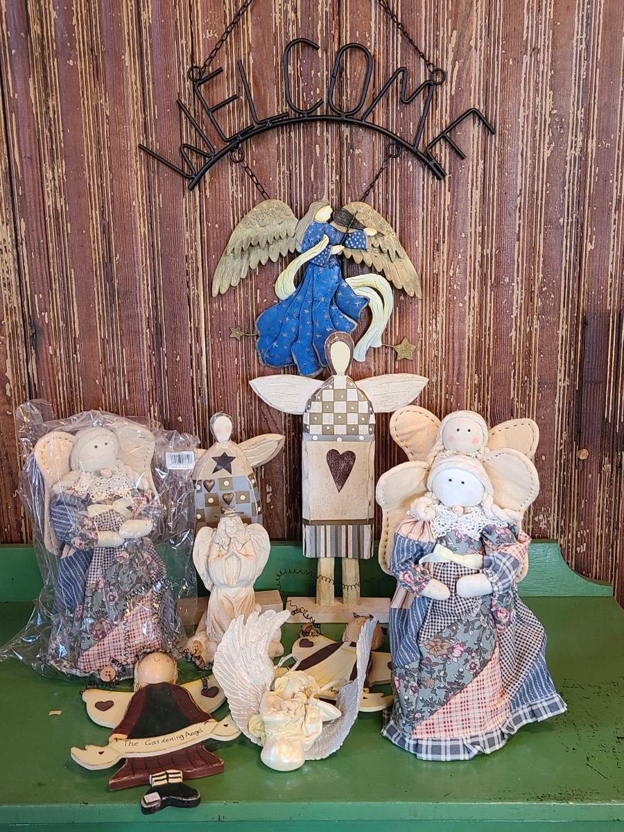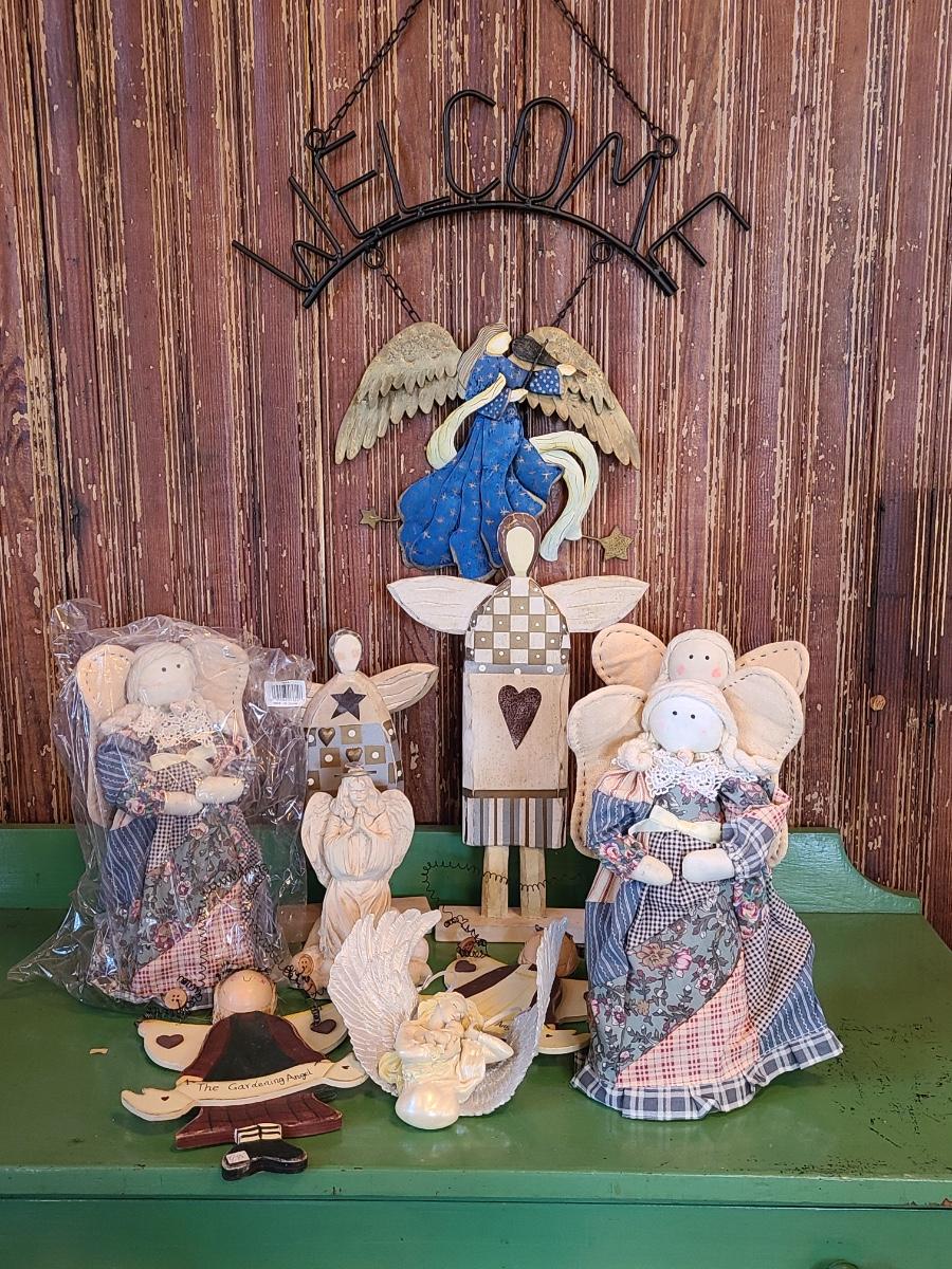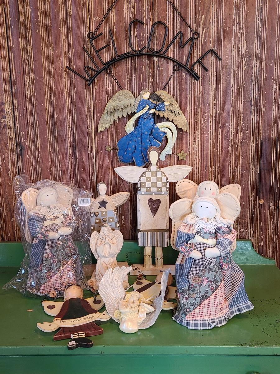 LOT 100: Wood Angels, Primitive Cloth Angels, Metal Wall Hanging and More