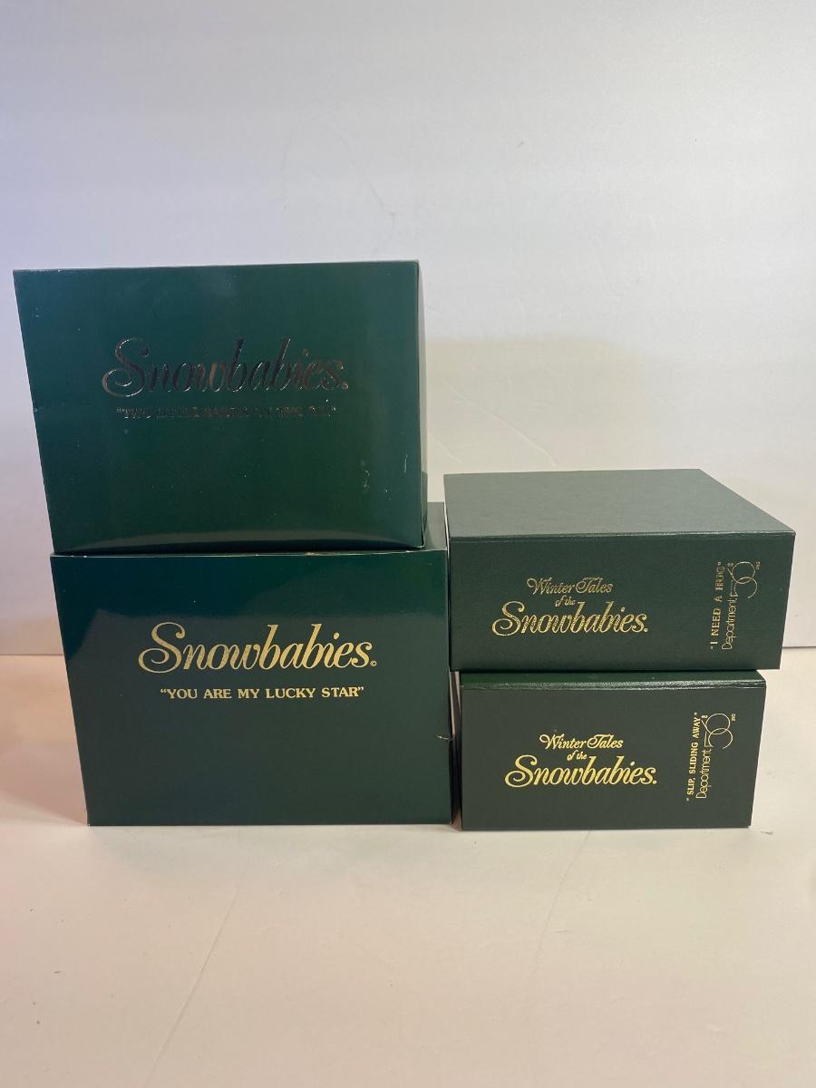 Collection of four Snowbabies. New old stock. Boxes may show wear due to storage. Please see all pictures as they are the best representation of the items. The pictures show condition, measurements if taken, and what is included in the lot. Due to the large amount that we photograph and the time frame, we are not always able to take measurements. All items unless noted, are pre-owned and have been used. If you purchased furniture, you must bring help. We do not allow one person to carry large furniture out on their own. Bring help, tools and a truck for the safety of our client’s homes, and your personal safety. Any damages that result to the property including walls, and floors due to moving of the furniture will be charged to the buyer. Company policy. Thank you.