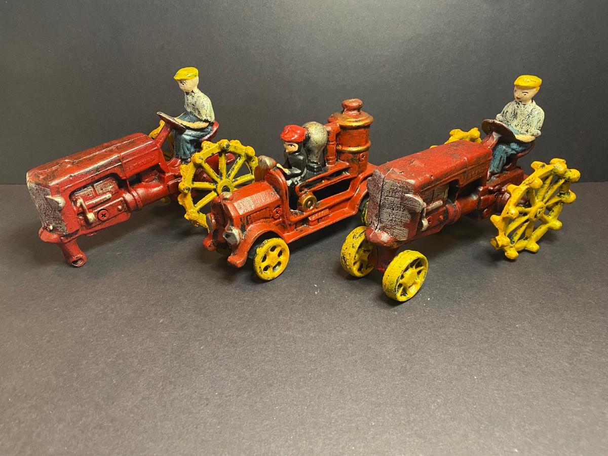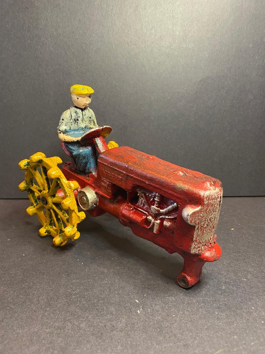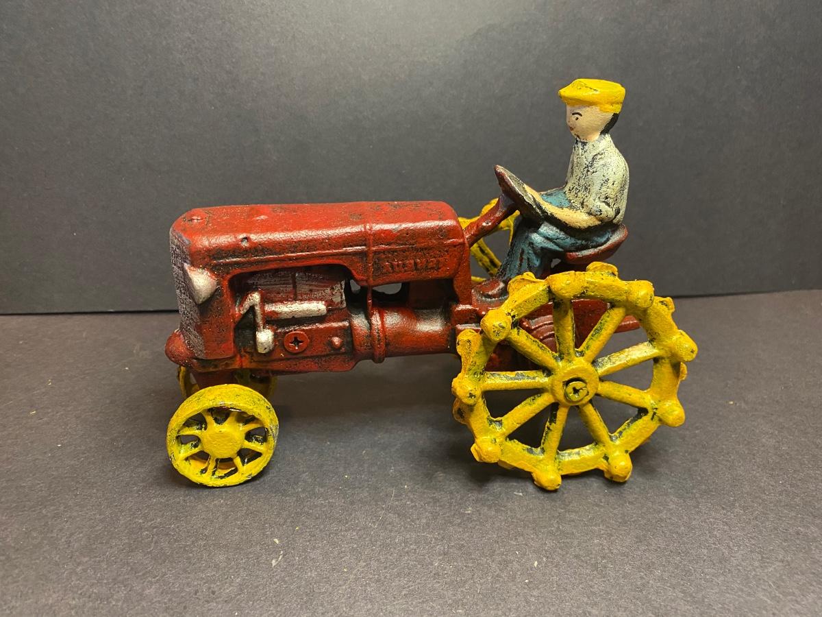 Collection of three cast iron farmers. One tractor is missing it’s front wheel. All three are heavy with vibrant colors. These were purchased wholesale and are antique reproductions. Please see all pictures as they are the best representation of the items. The pictures show condition, measurements if taken, and what is included in the lot. Due to the large amount that we photograph and the time frame, we are not always able to take measurements. All items unless noted, are pre-owned and have been used. If you purchased furniture, you must bring help. We do not allow one person to carry large furniture out on their own. Bring help, tools and a truck for the safety of our client’s homes, and your personal safety. Any damages that result to the property including walls, and floors due to moving of the furniture will be charged to the buyer. Company policy. Thank you.