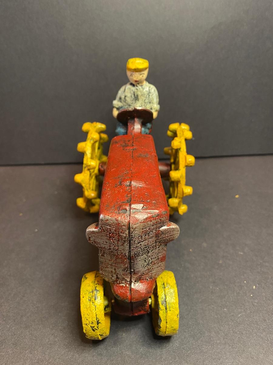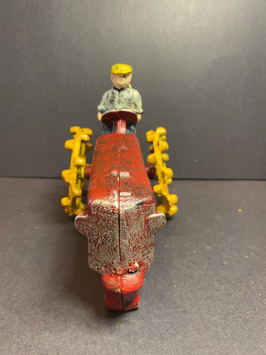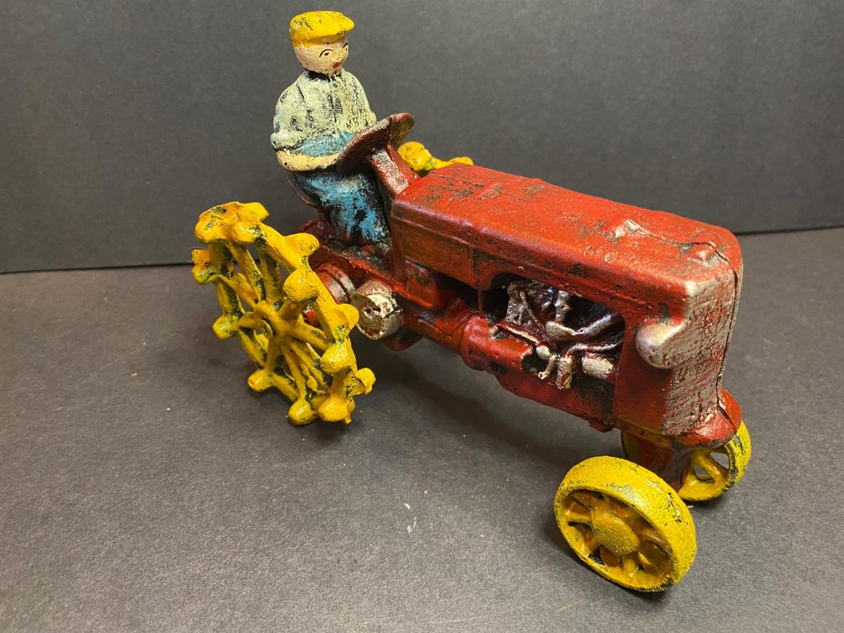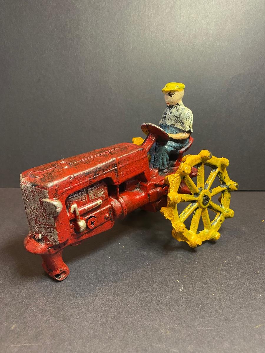 Collection of three cast iron farmers. One tractor is missing it’s front wheel. All three are heavy with vibrant colors. These were purchased wholesale and are antique reproductions. Please see all pictures as they are the best representation of the items. The pictures show condition, measurements if taken, and what is included in the lot. Due to the large amount that we photograph and the time frame, we are not always able to take measurements. All items unless noted, are pre-owned and have been used. If you purchased furniture, you must bring help. We do not allow one person to carry large furniture out on their own. Bring help, tools and a truck for the safety of our client’s homes, and your personal safety. Any damages that result to the property including walls, and floors due to moving of the furniture will be charged to the buyer. Company policy. Thank you.