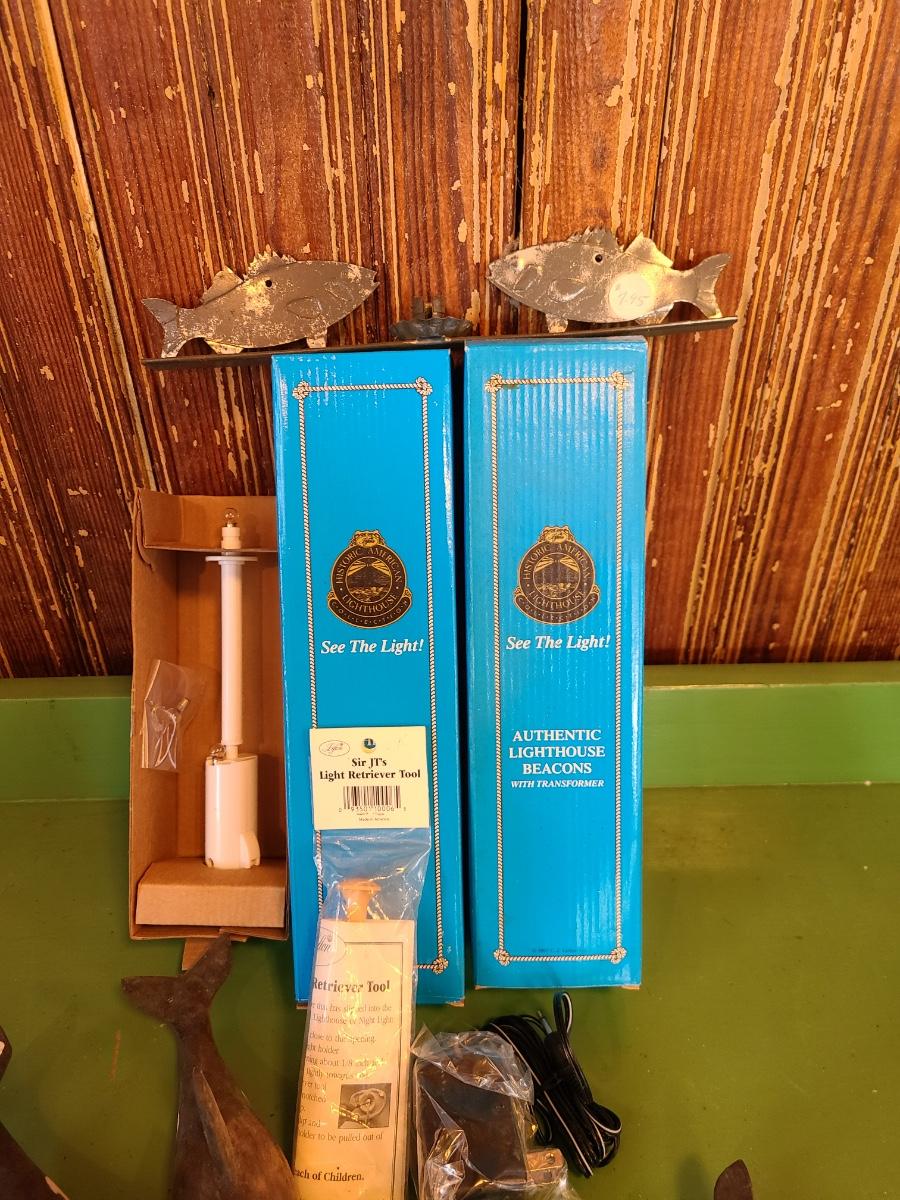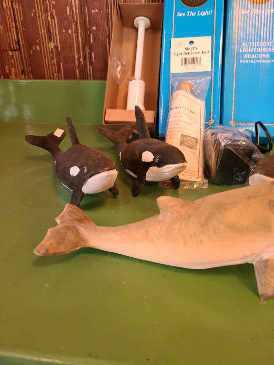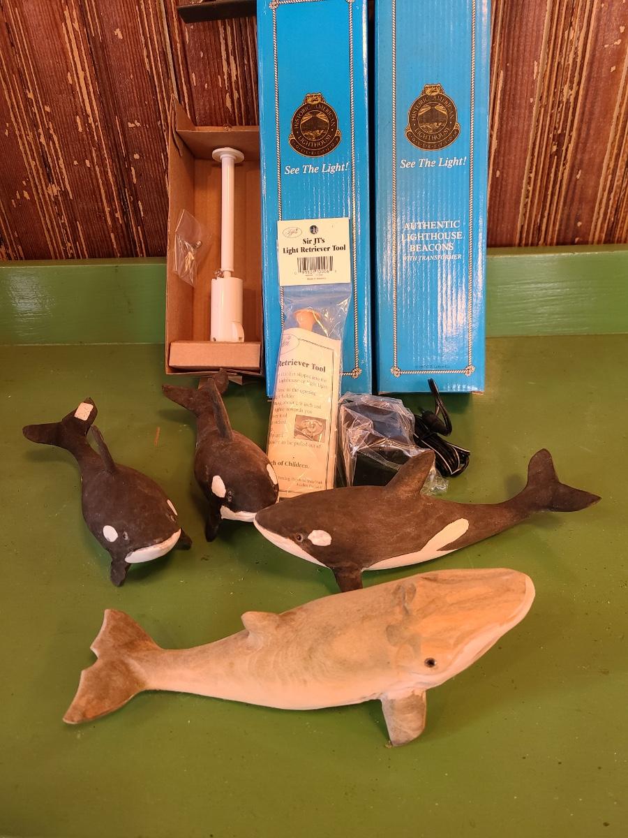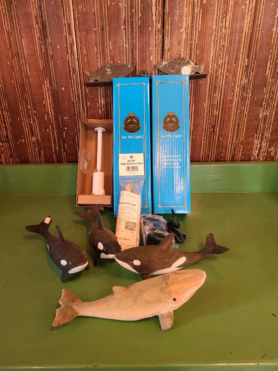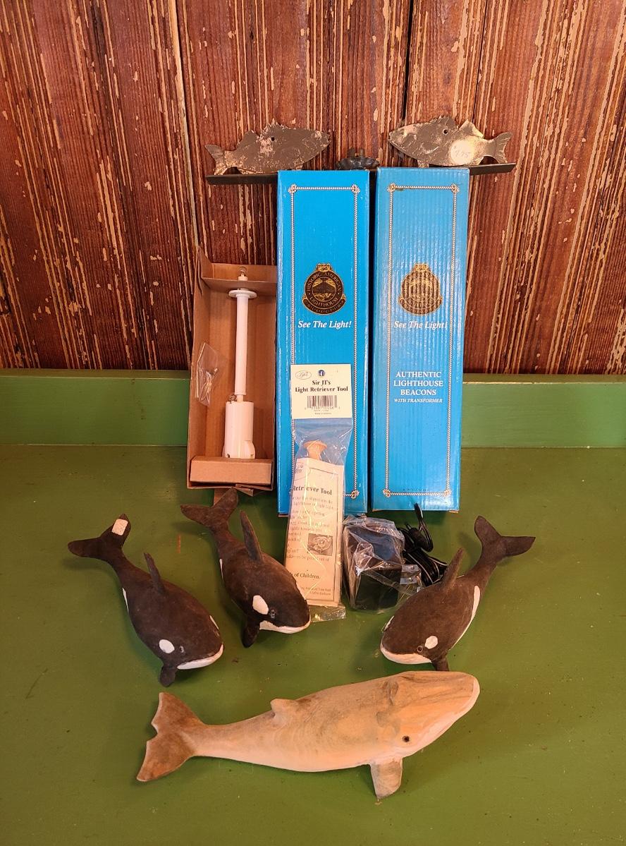 LOT 127: Wood Carved Whales, Tin Fish Candle Holder & Lefton Lighthouse Beacon Lights