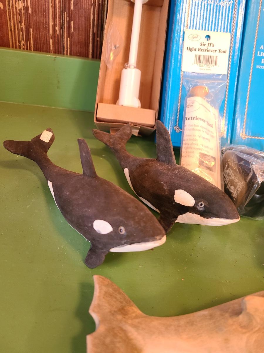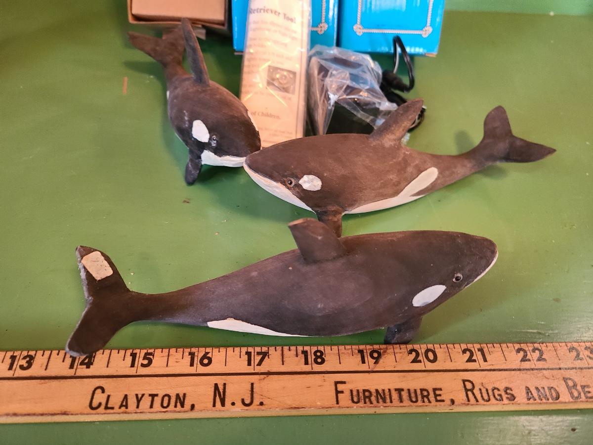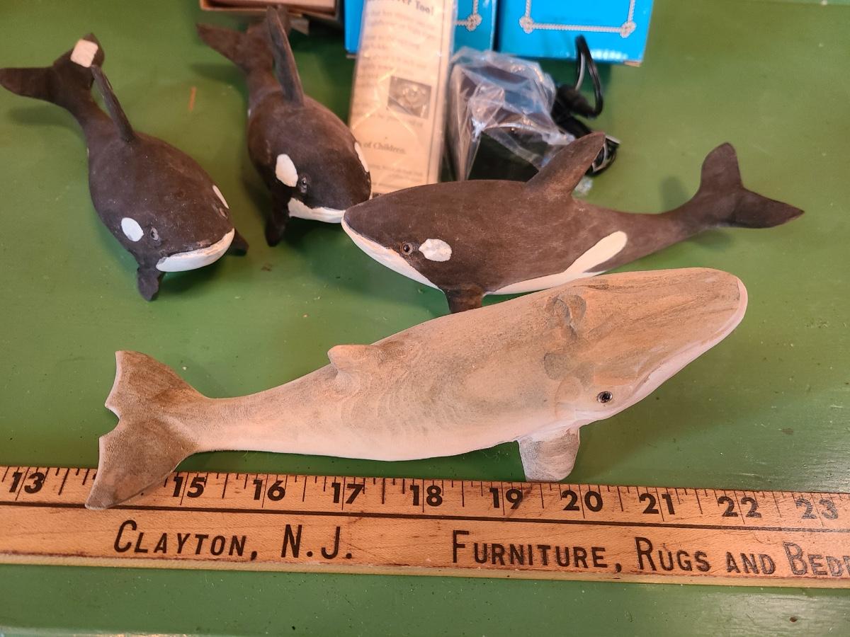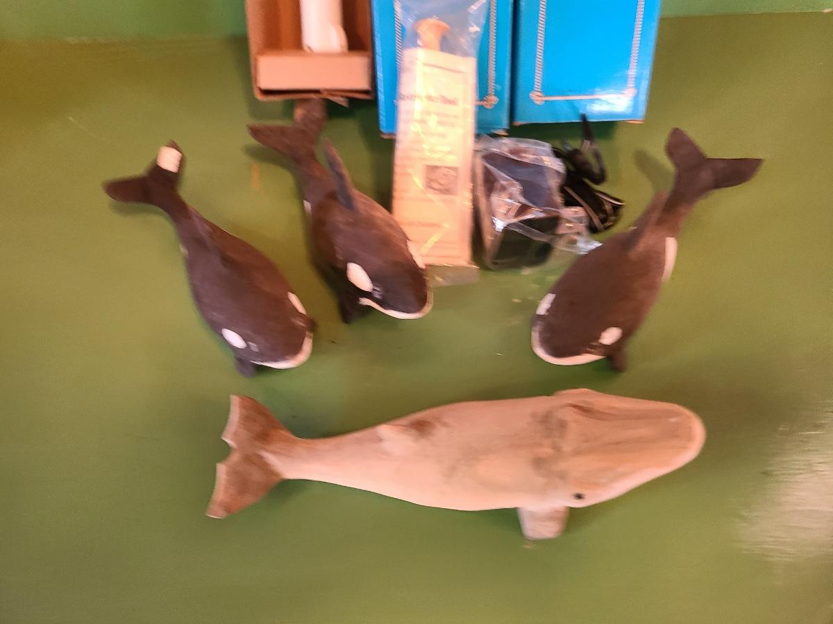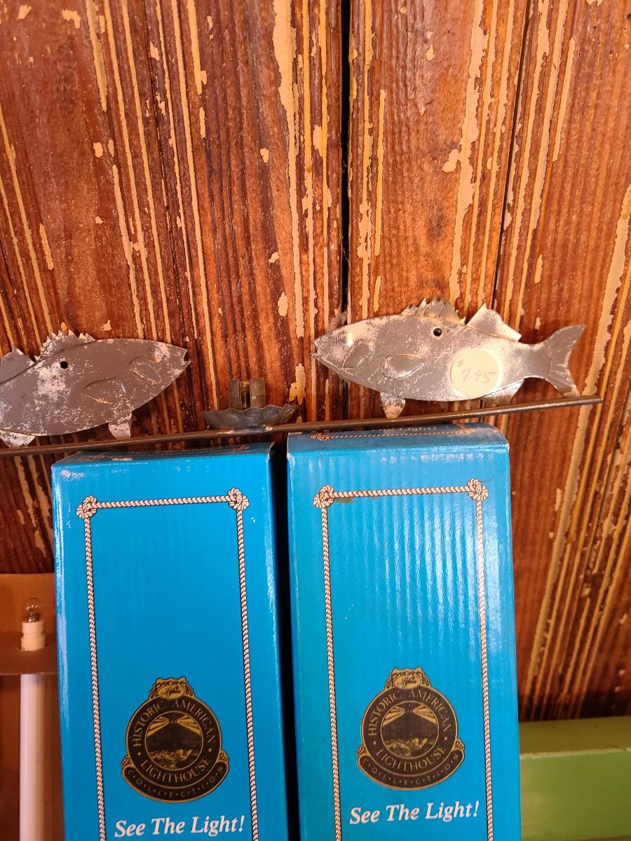 LOT 127: Wood Carved Whales, Tin Fish Candle Holder & Lefton Lighthouse Beacon Lights