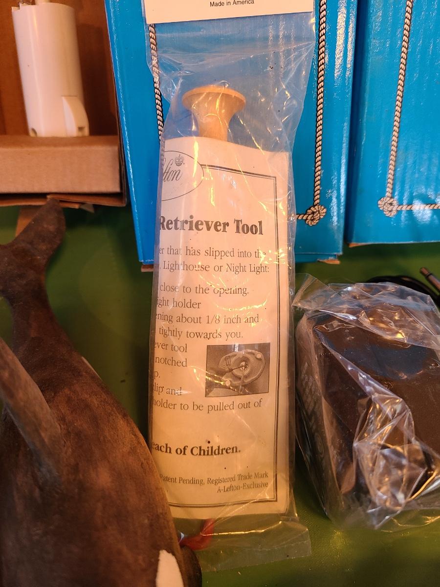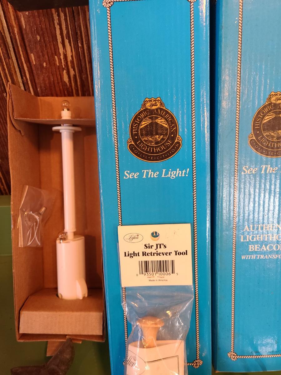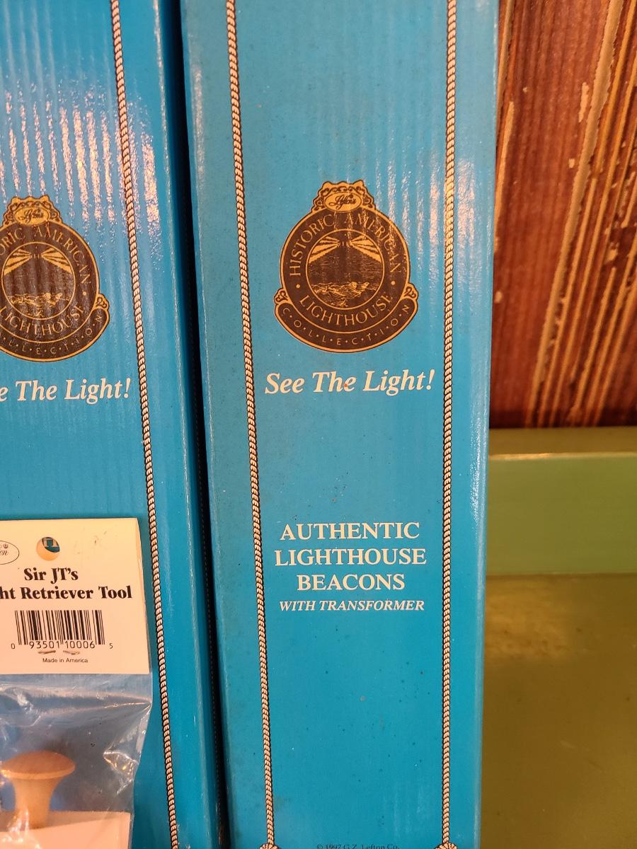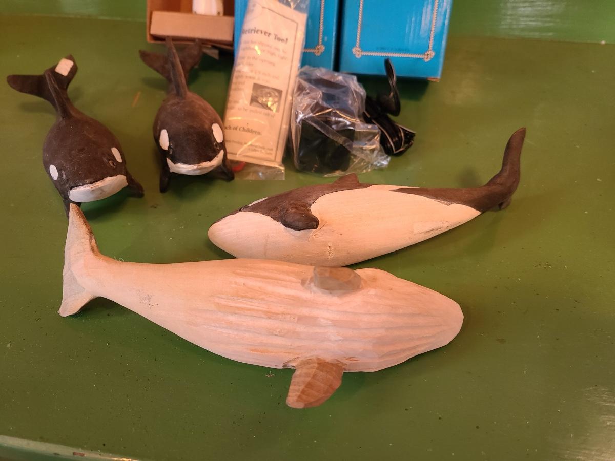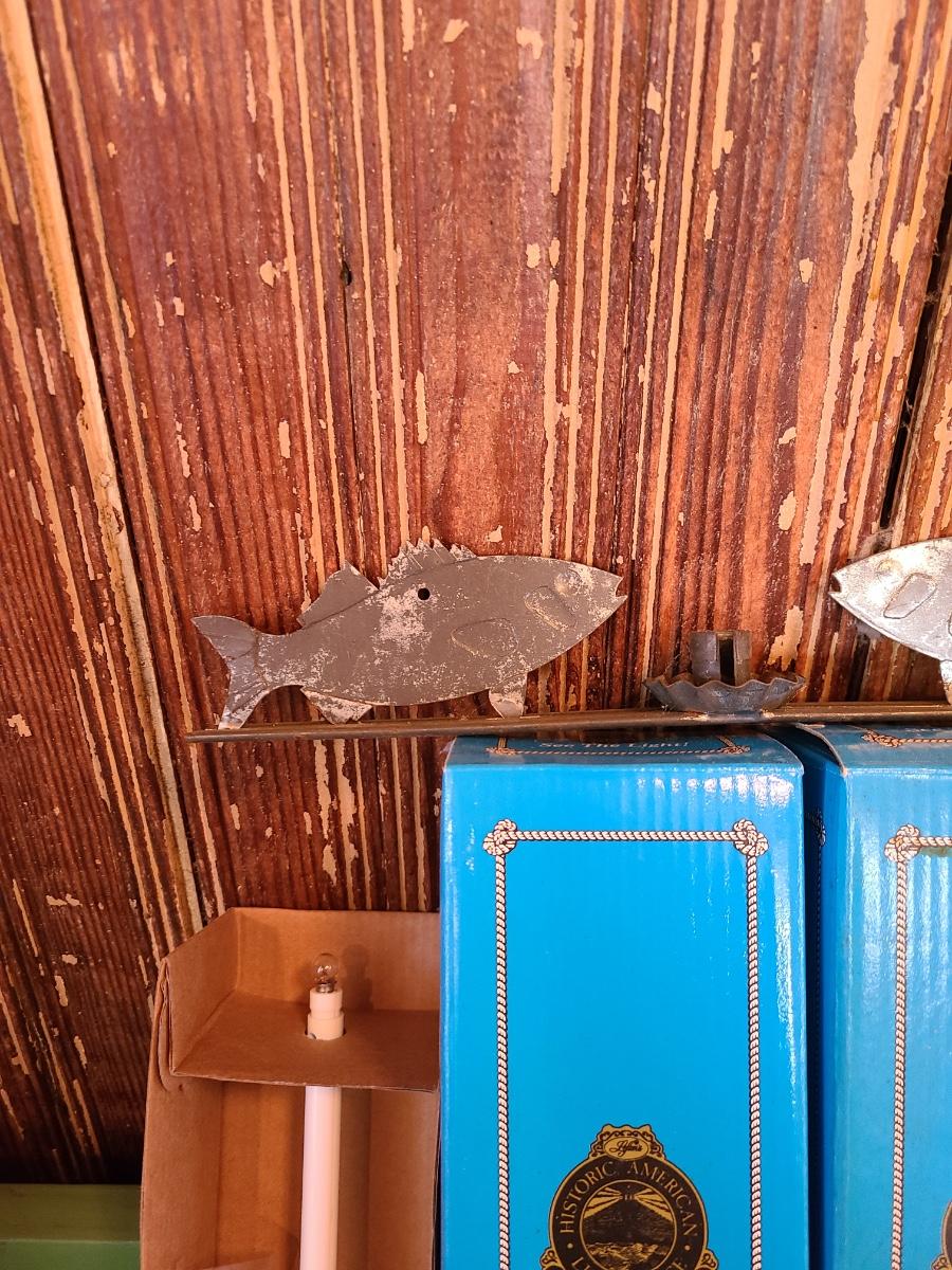 LOT 127: Wood Carved Whales, Tin Fish Candle Holder & Lefton Lighthouse Beacon Lights