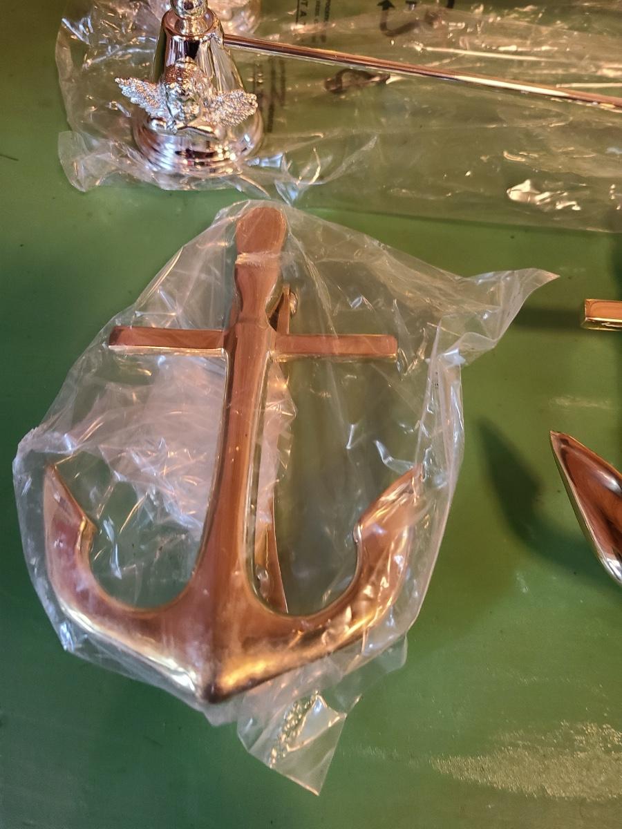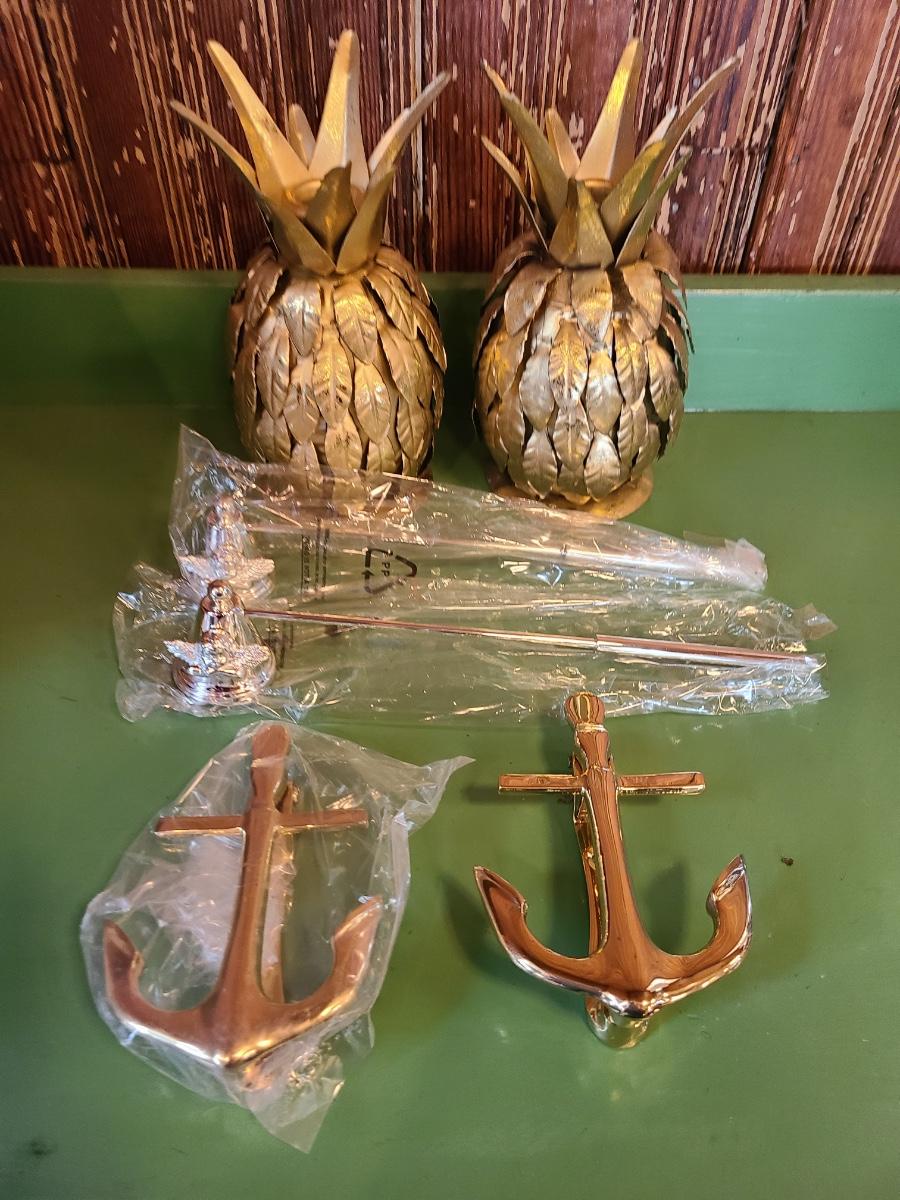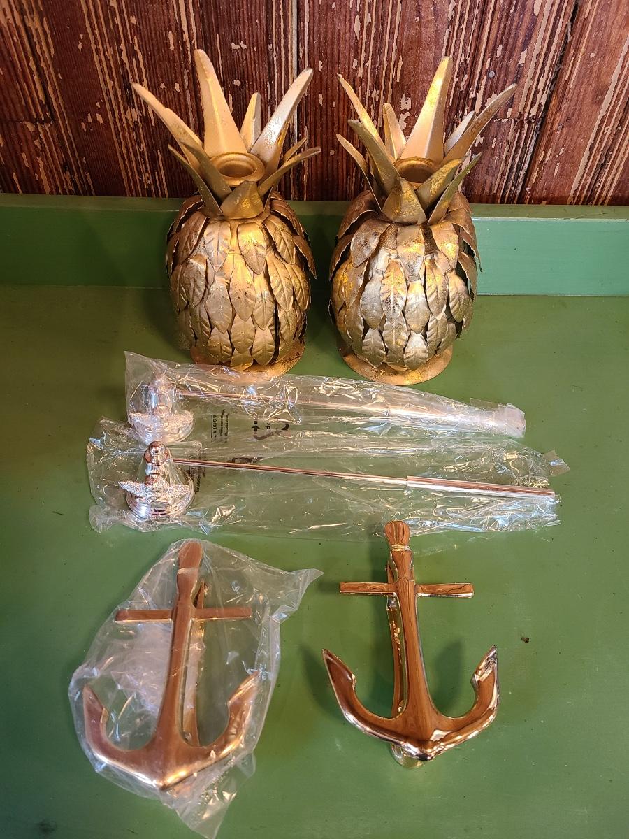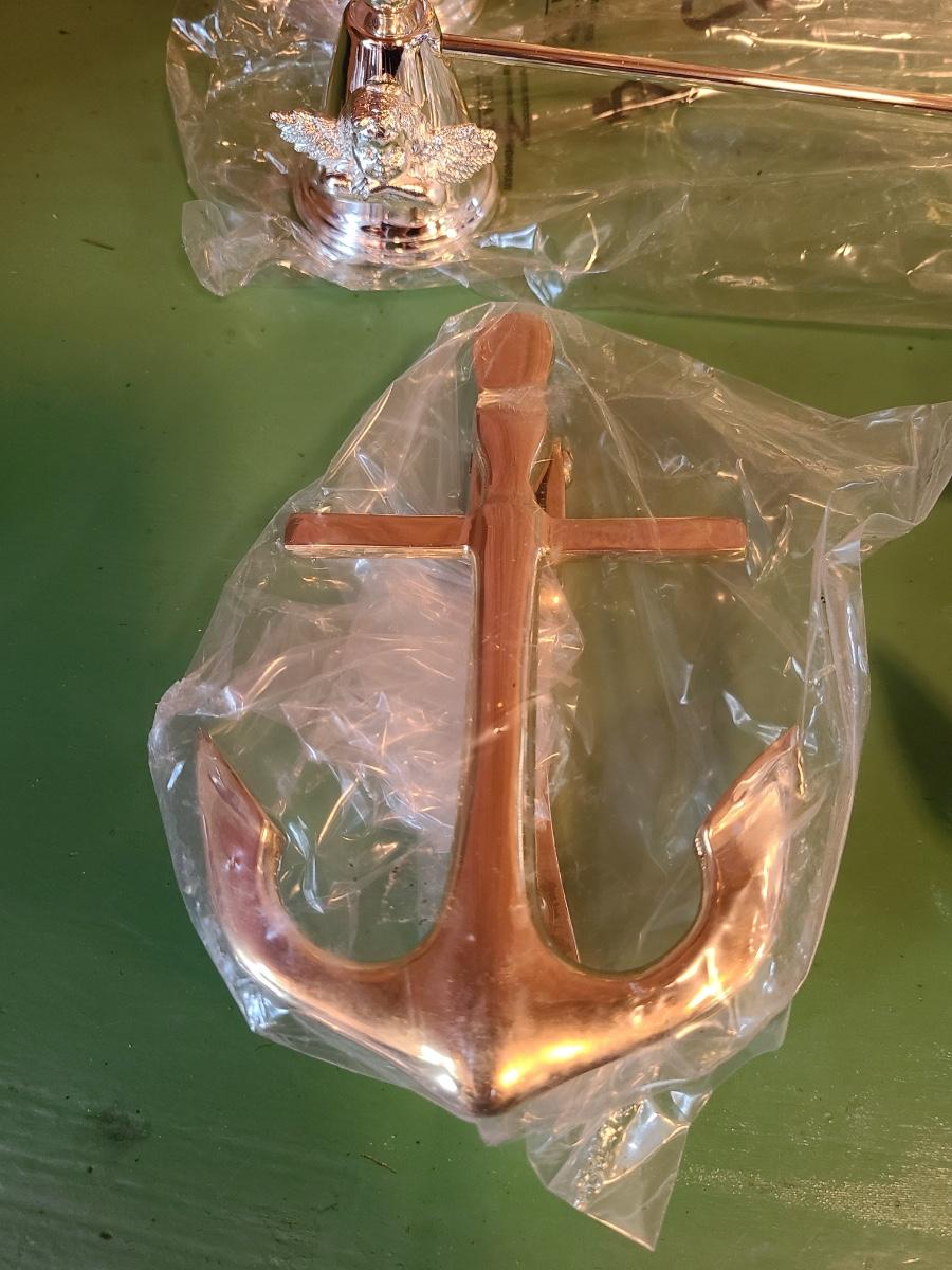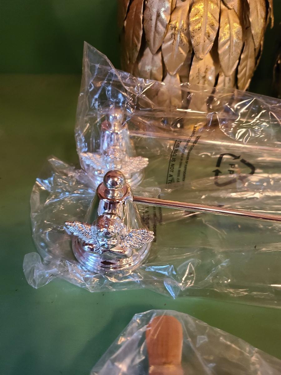 LOT 141: New: Brass Anchor Door Knockers, Metal Pinecone Candleholders, 2 Angel Candle Snuffes