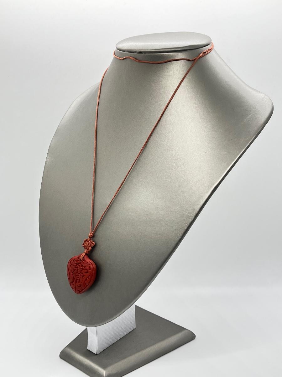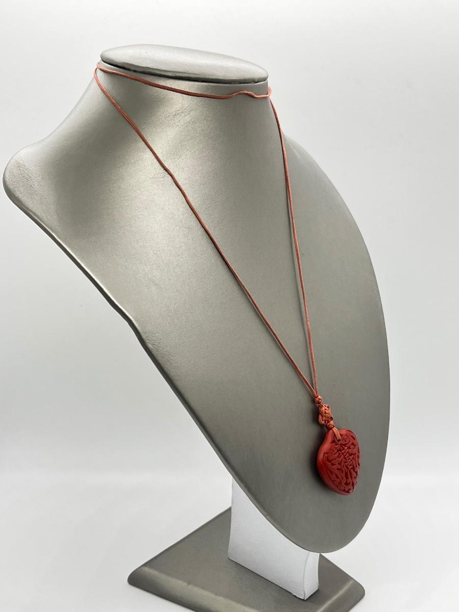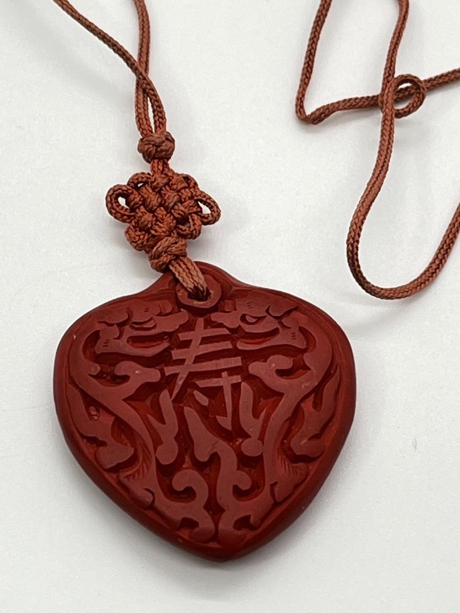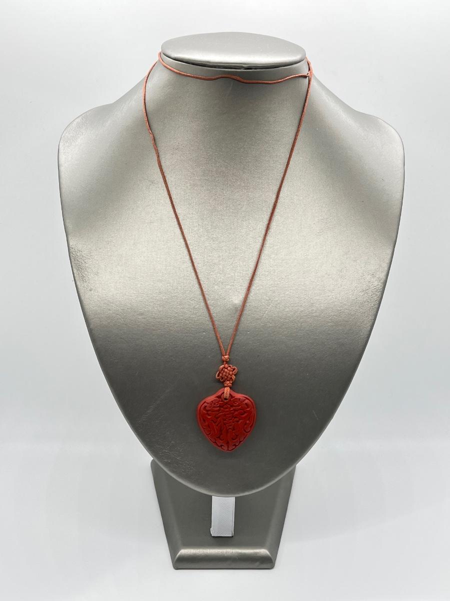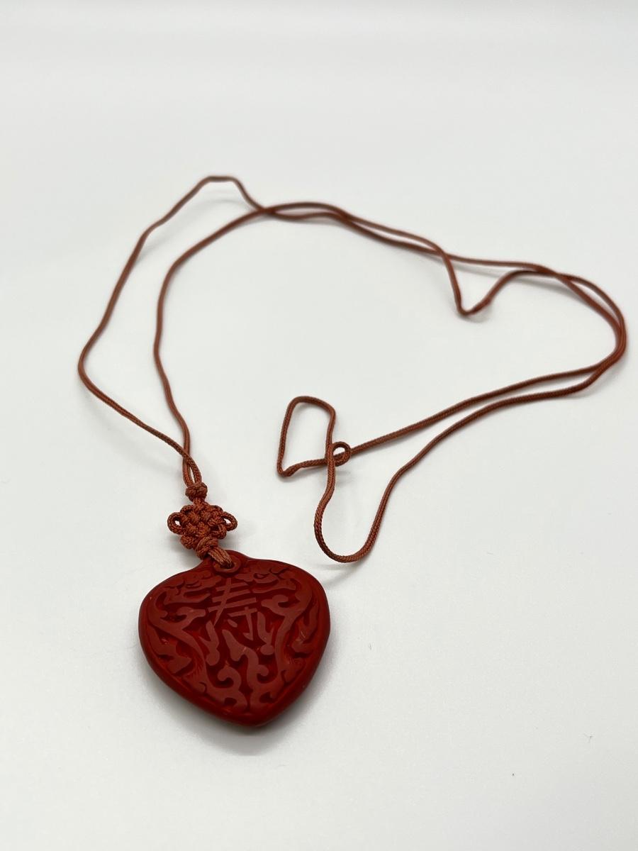 Wonderful carved cinnabar heart & corded necklace. The knot work is so intricate! It easily adjusts up to 30": keep know lose.