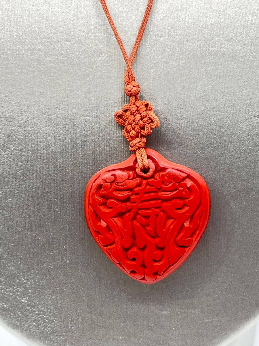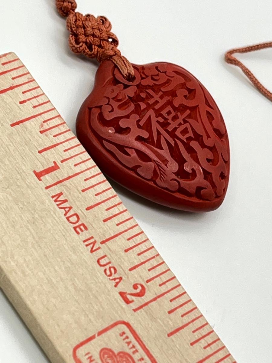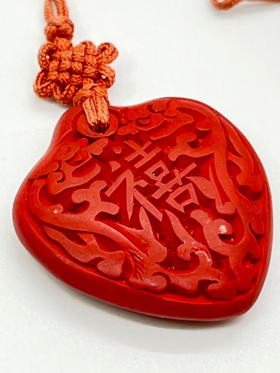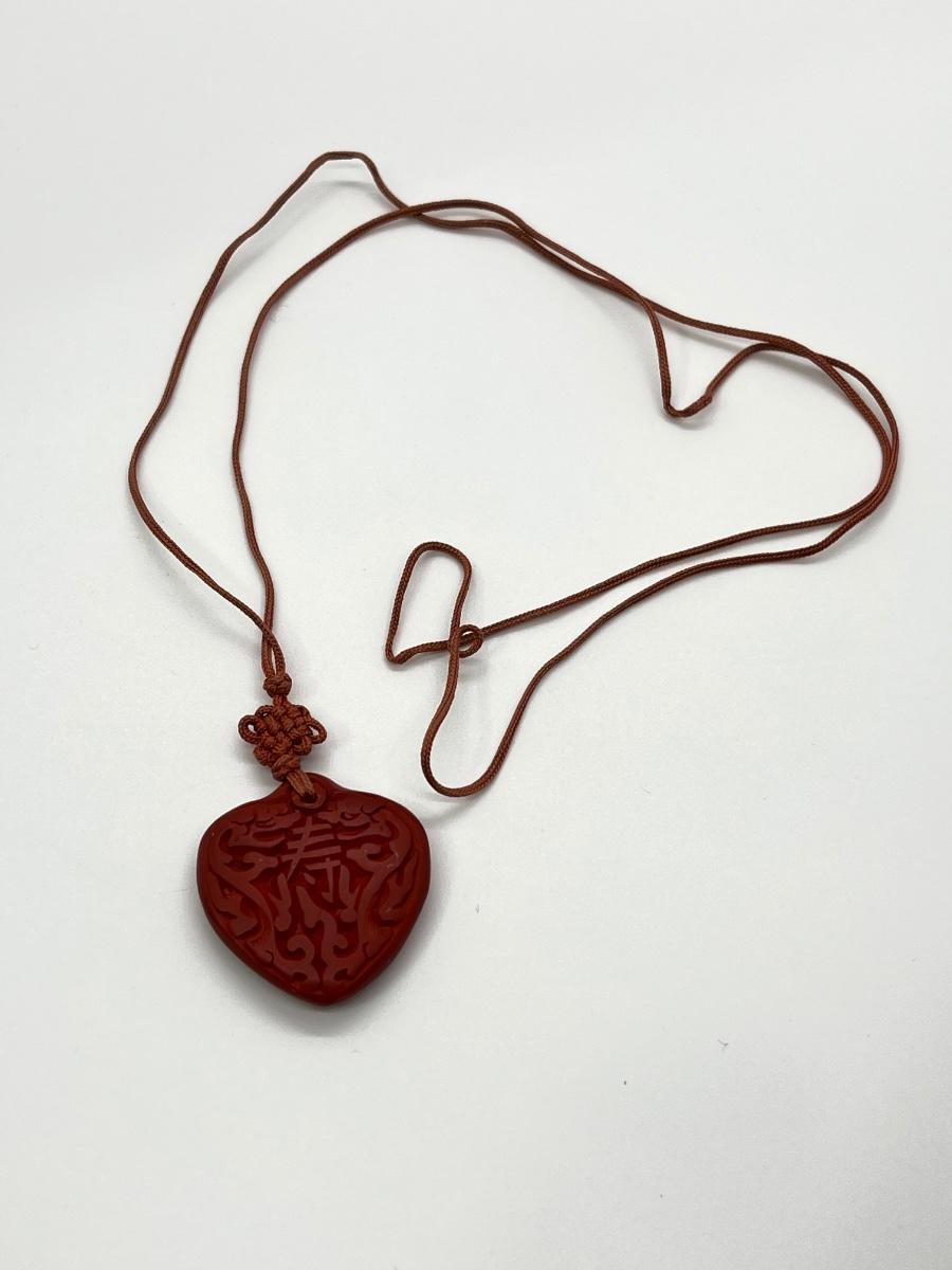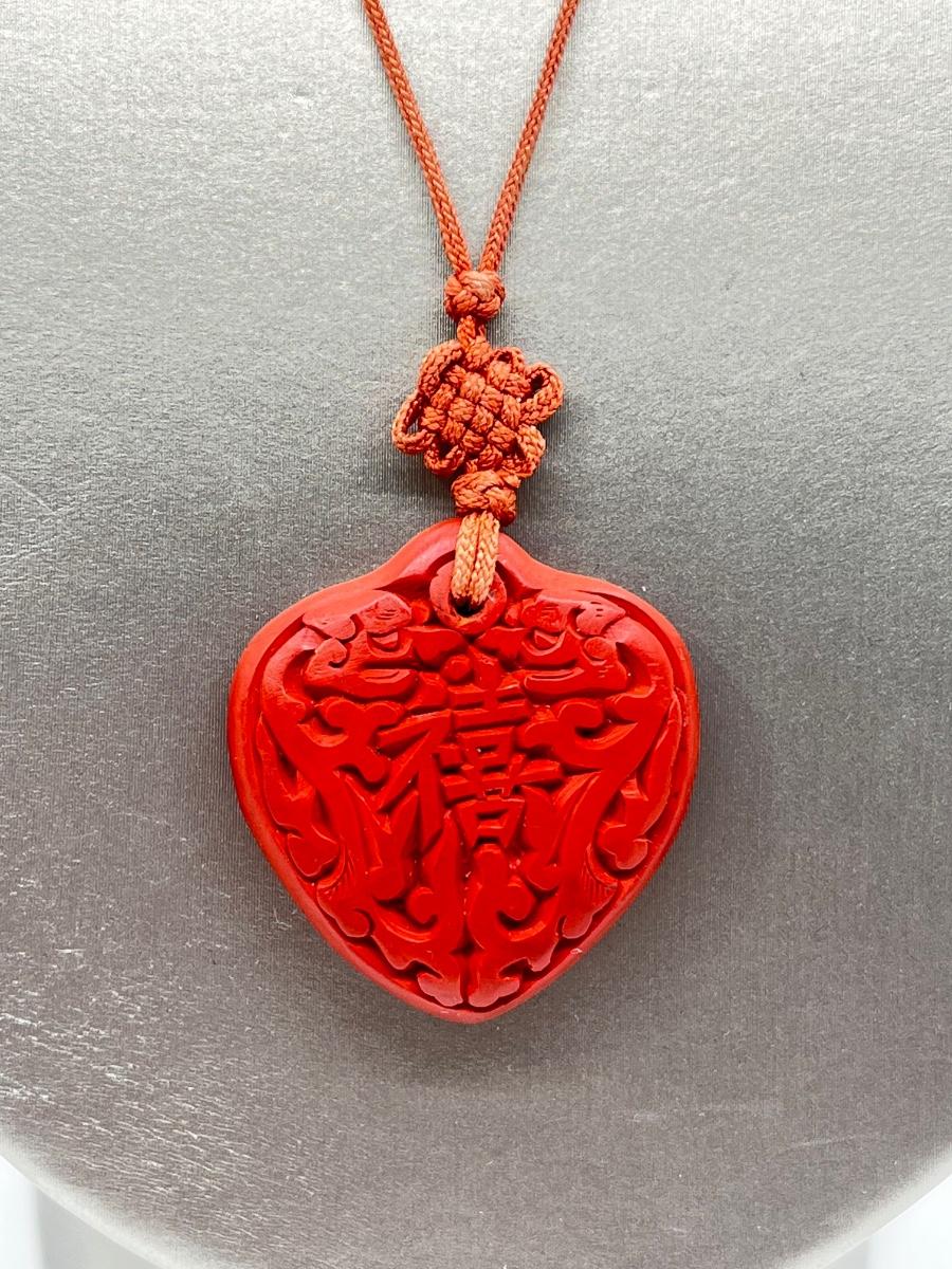 Wonderful carved cinnabar heart & corded necklace. The knot work is so intricate! It easily adjusts up to 30": keep know lose.