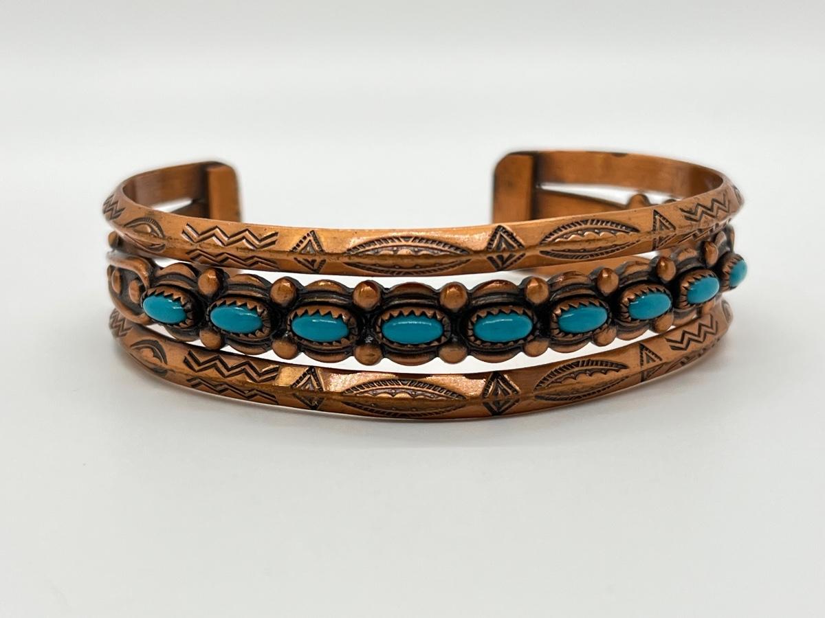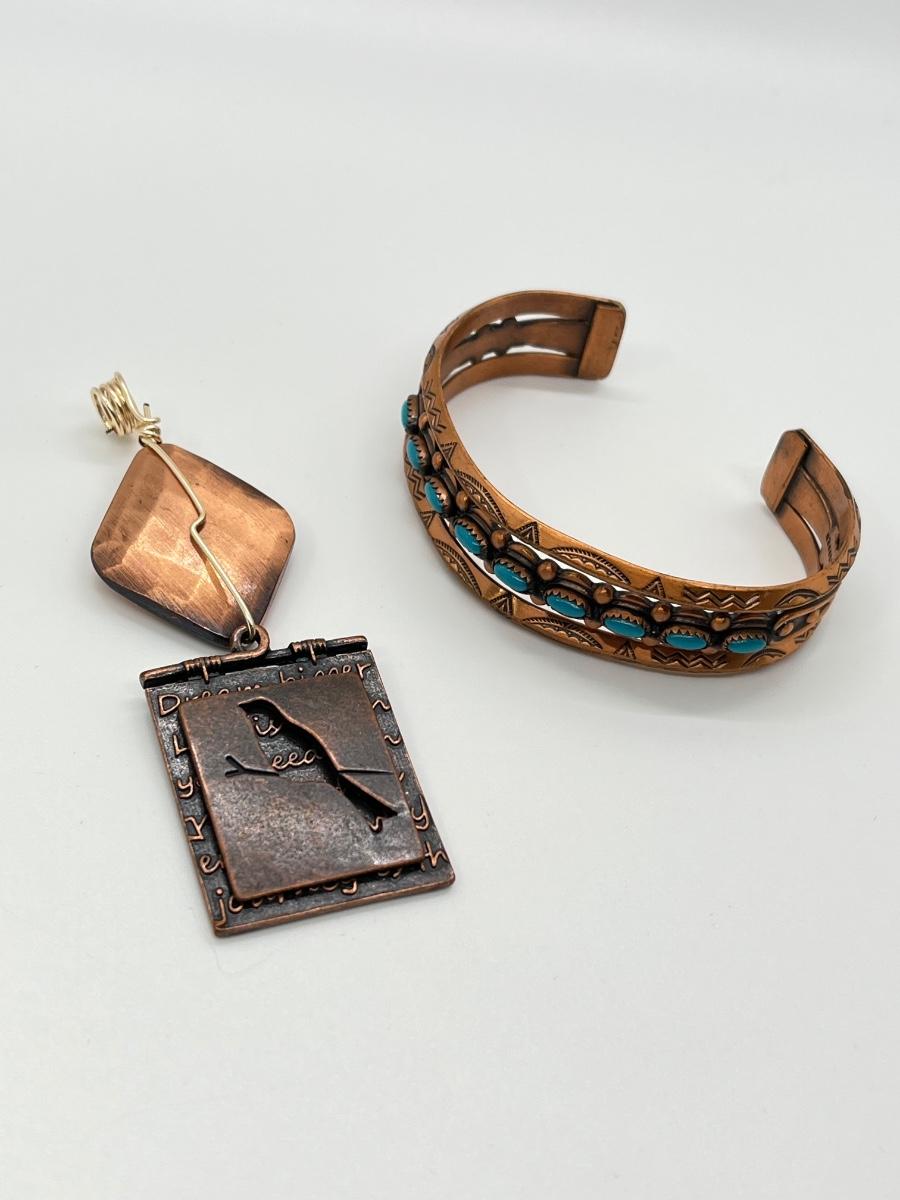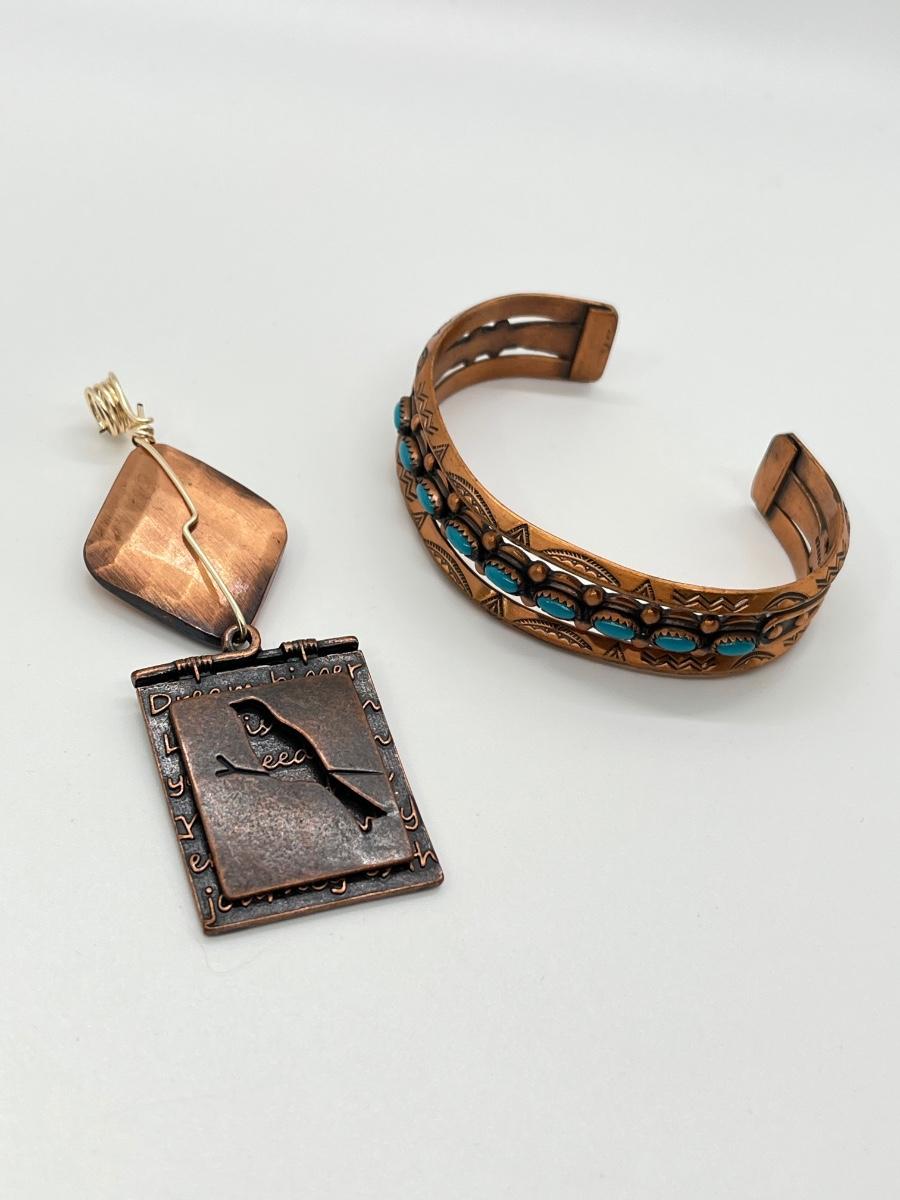 LOT 27: Artisan Southwestern Solid Copper Bangle w/Turquoise Accents & Handcrafted Copper Pendant