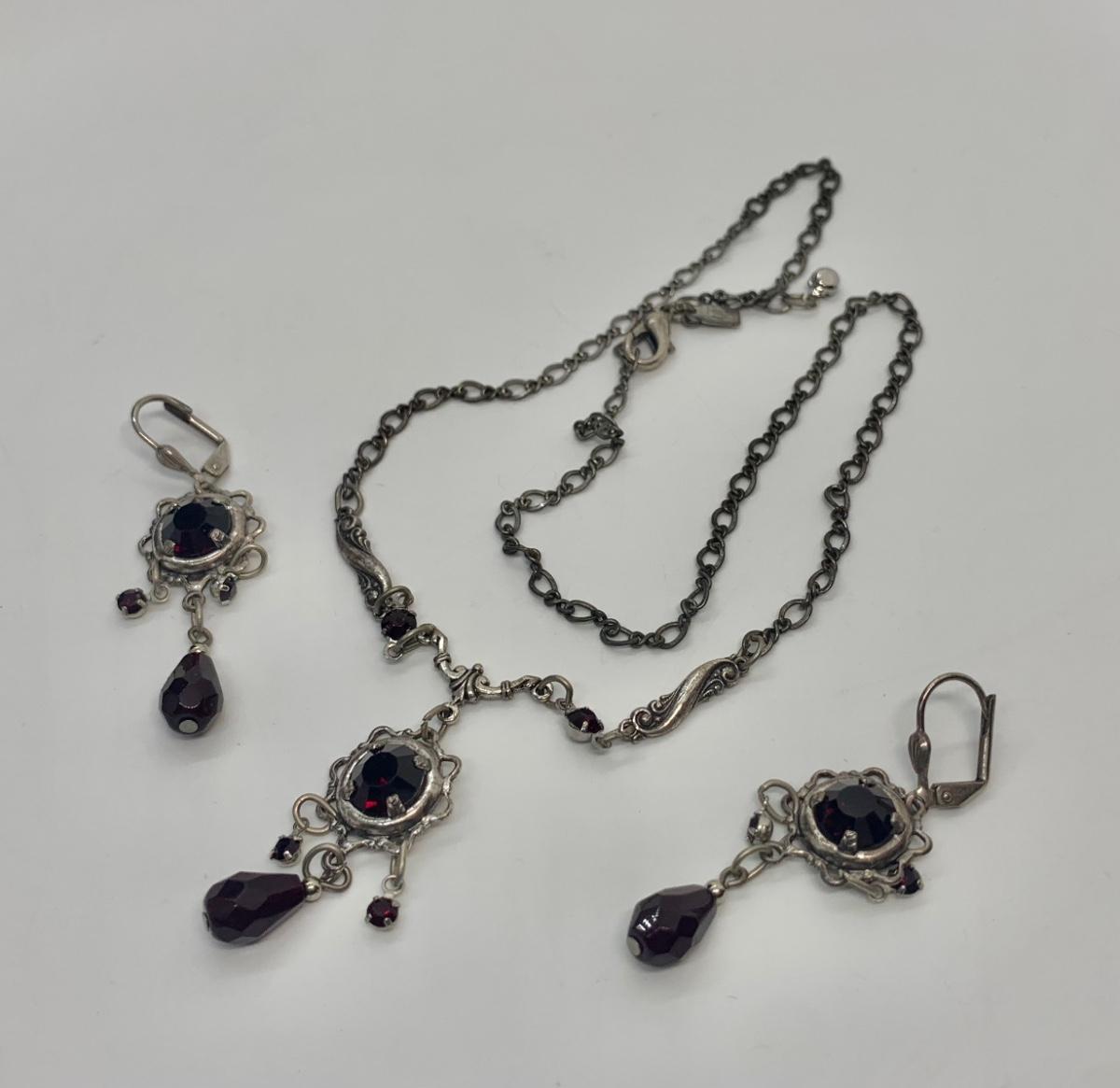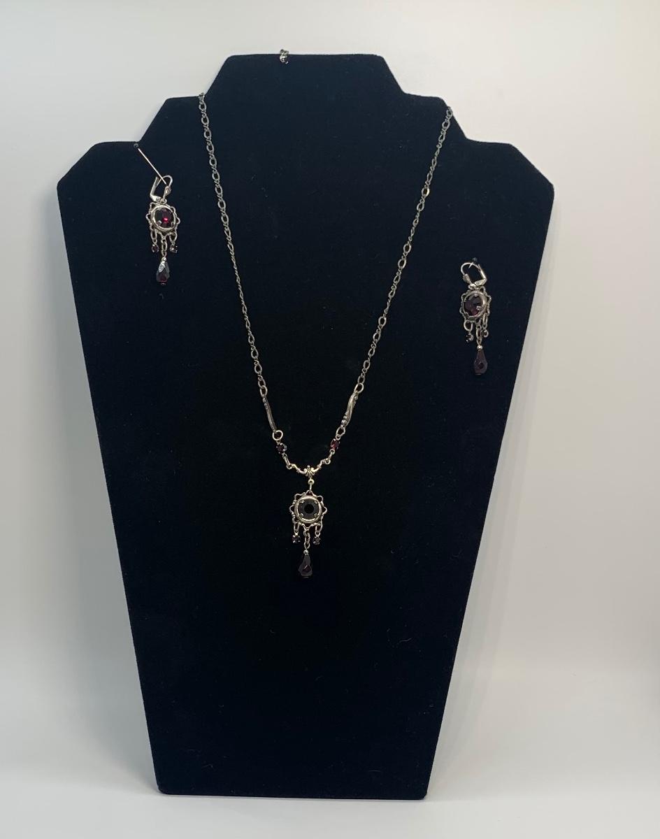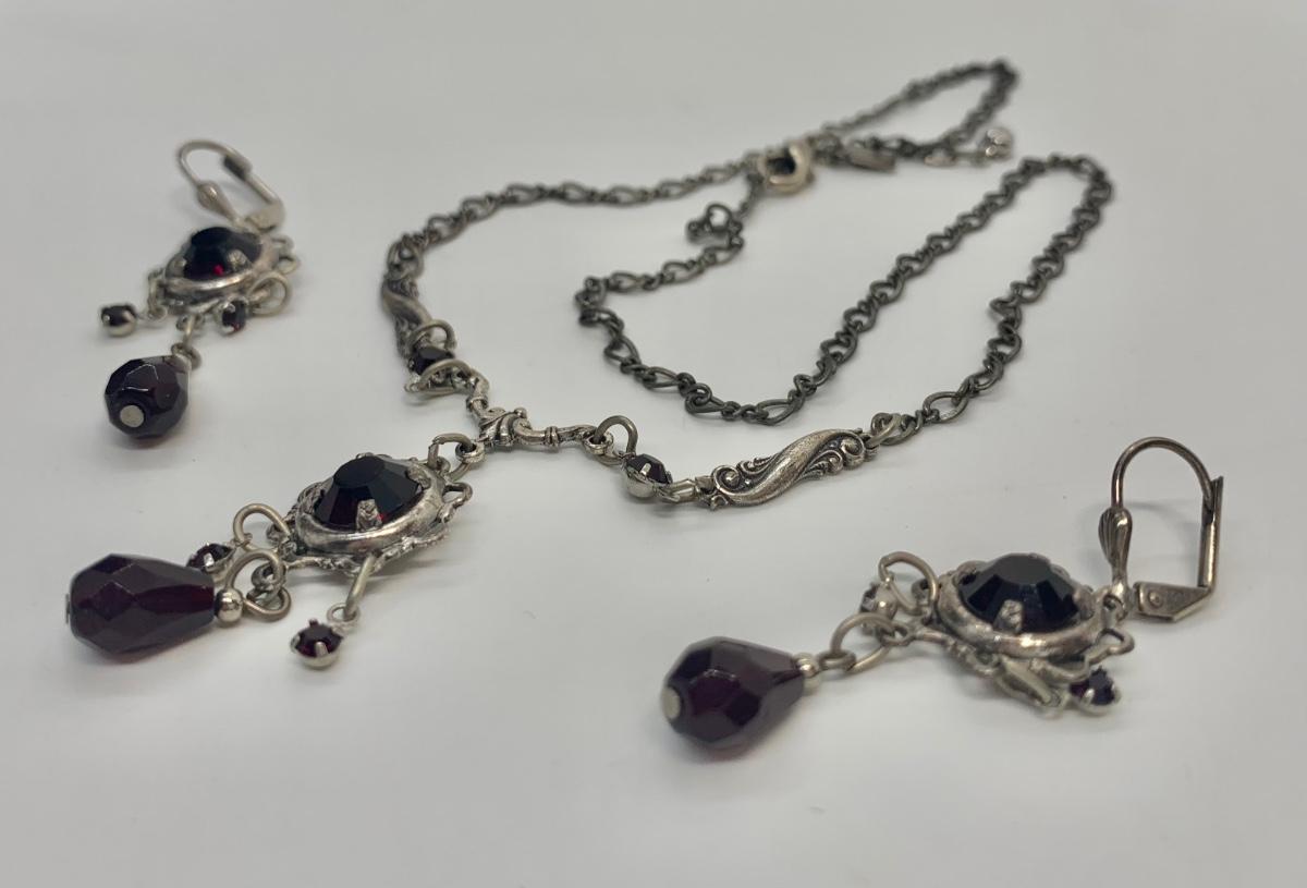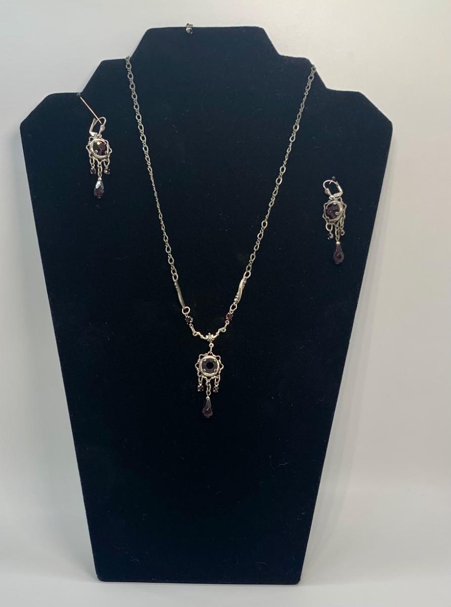 LOT 55: Beautiful Silver Tone Faux Garnet Earrings & Necklace Set (20" Necklace & Pierced Earrings)