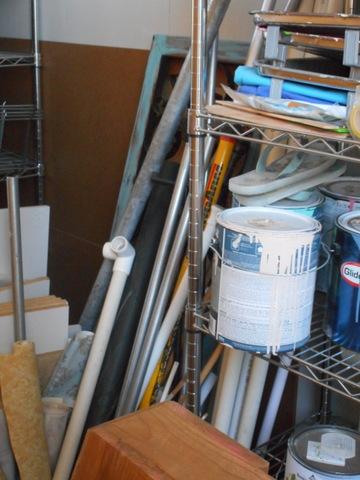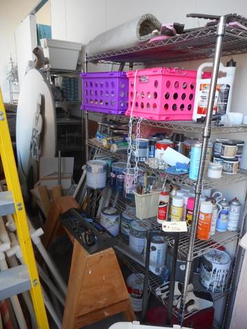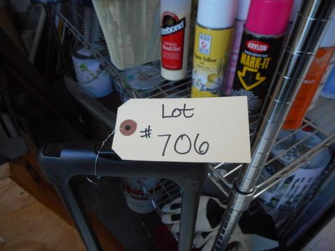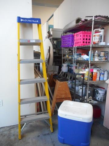 Lot 706 - 1 Stainless Rack Full Of Supplies, Ladder, Rolling Ice Chest, Etc.