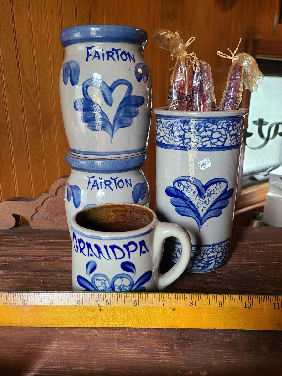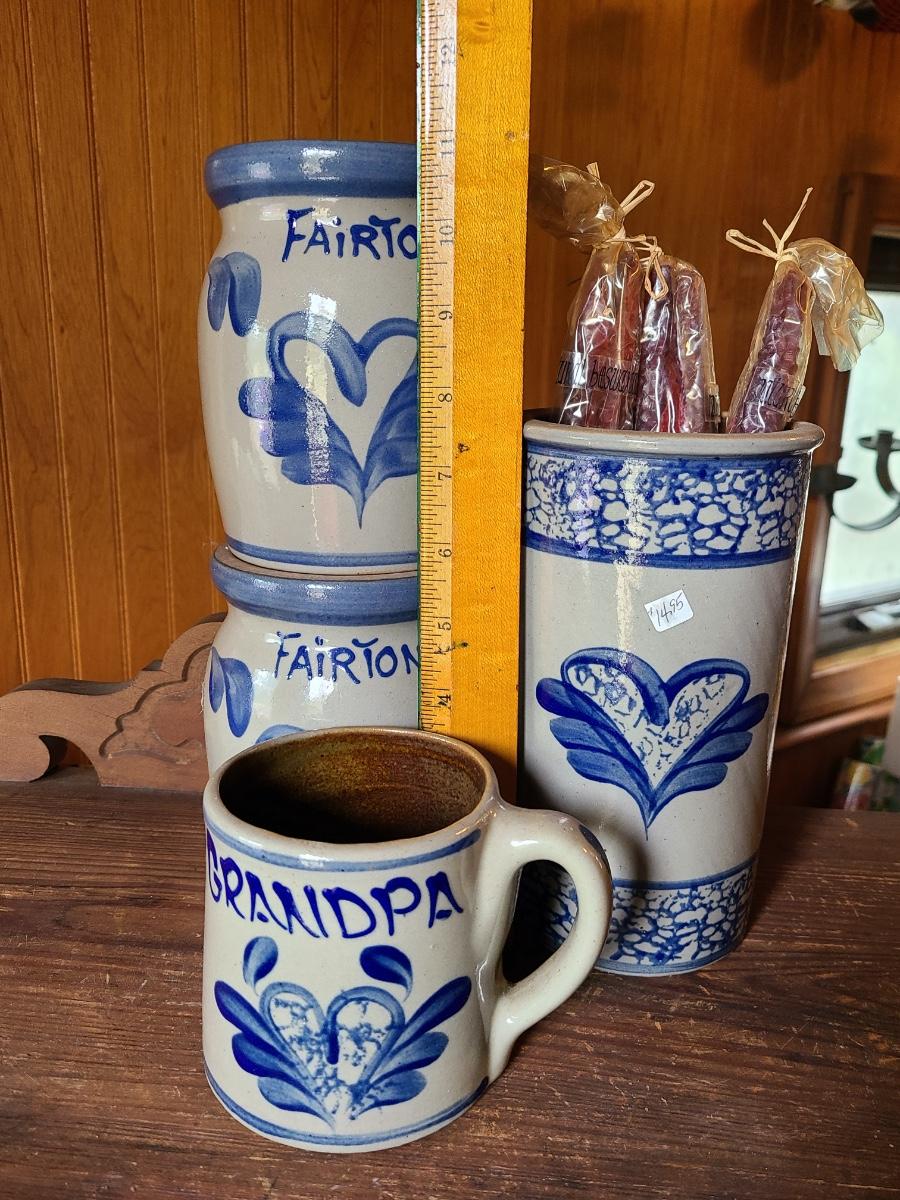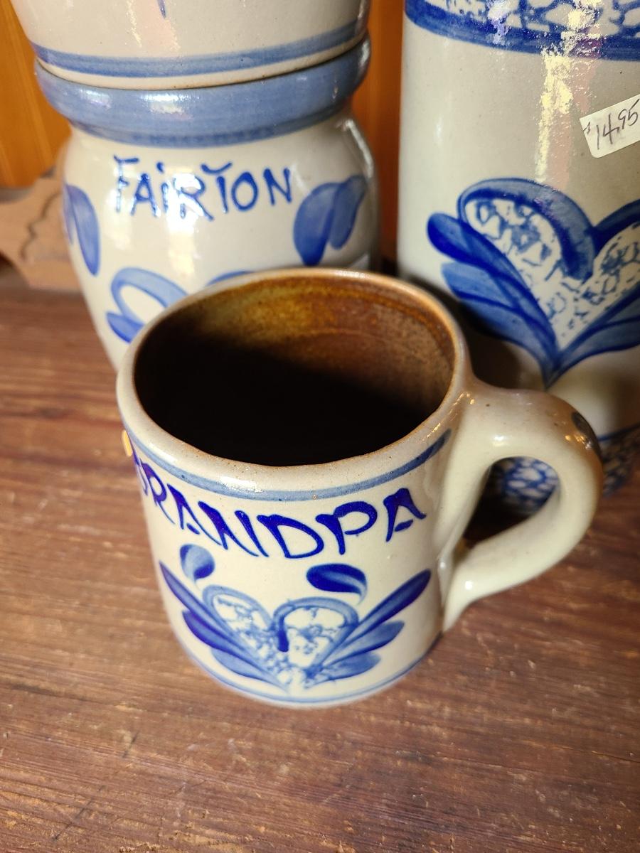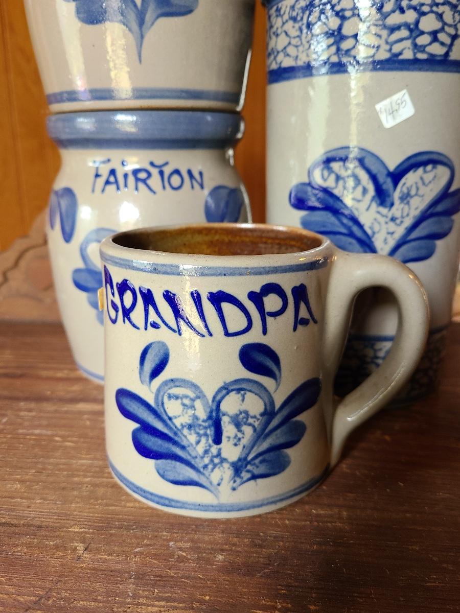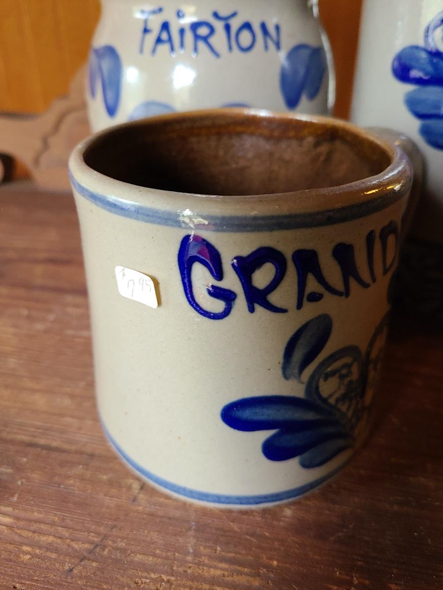 LOT 9C: Beaumont Brothers Salt Glaze Pottery Small Crocks, Heart, and Grandpa Mug