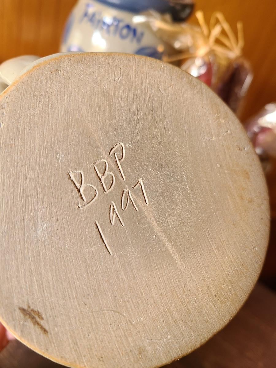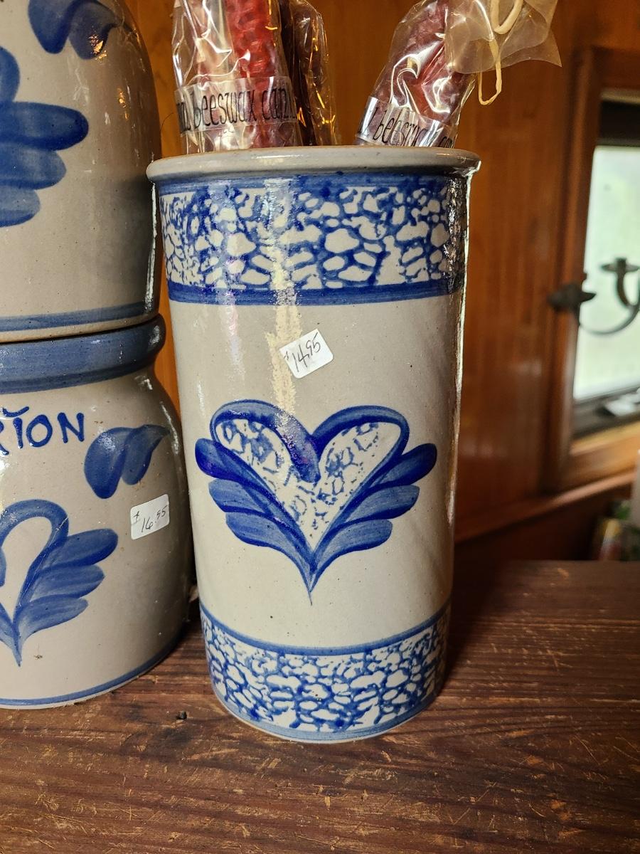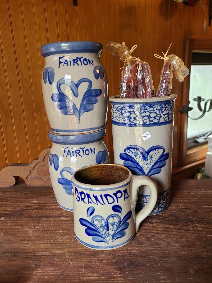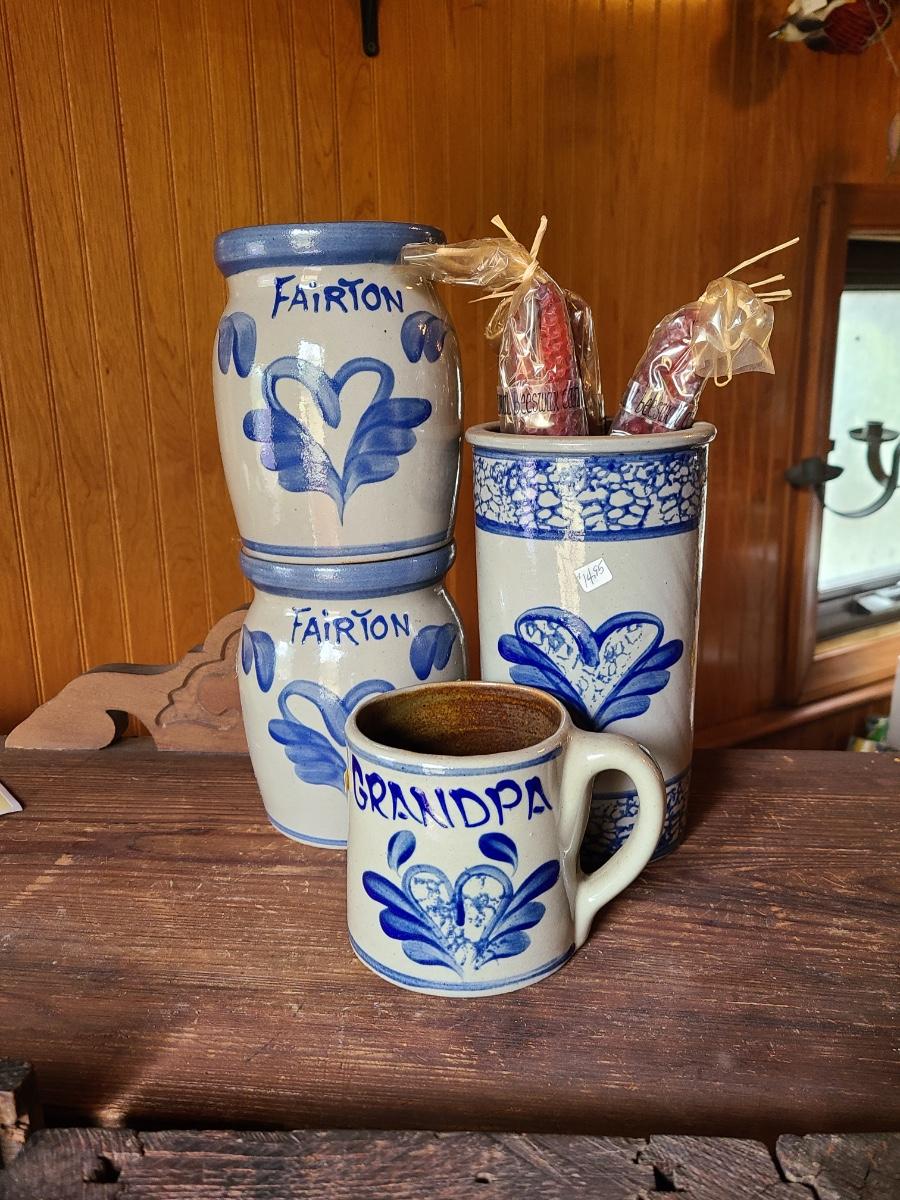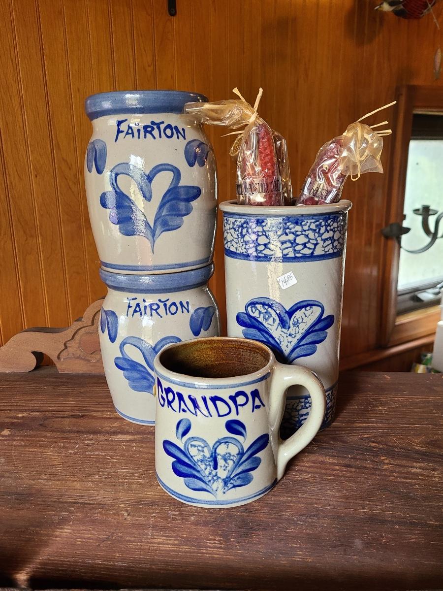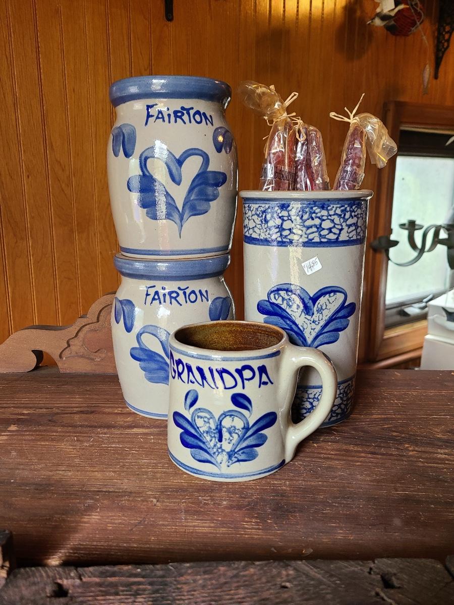 LOT 9C: Beaumont Brothers Salt Glaze Pottery Small Crocks, Heart, and Grandpa Mug