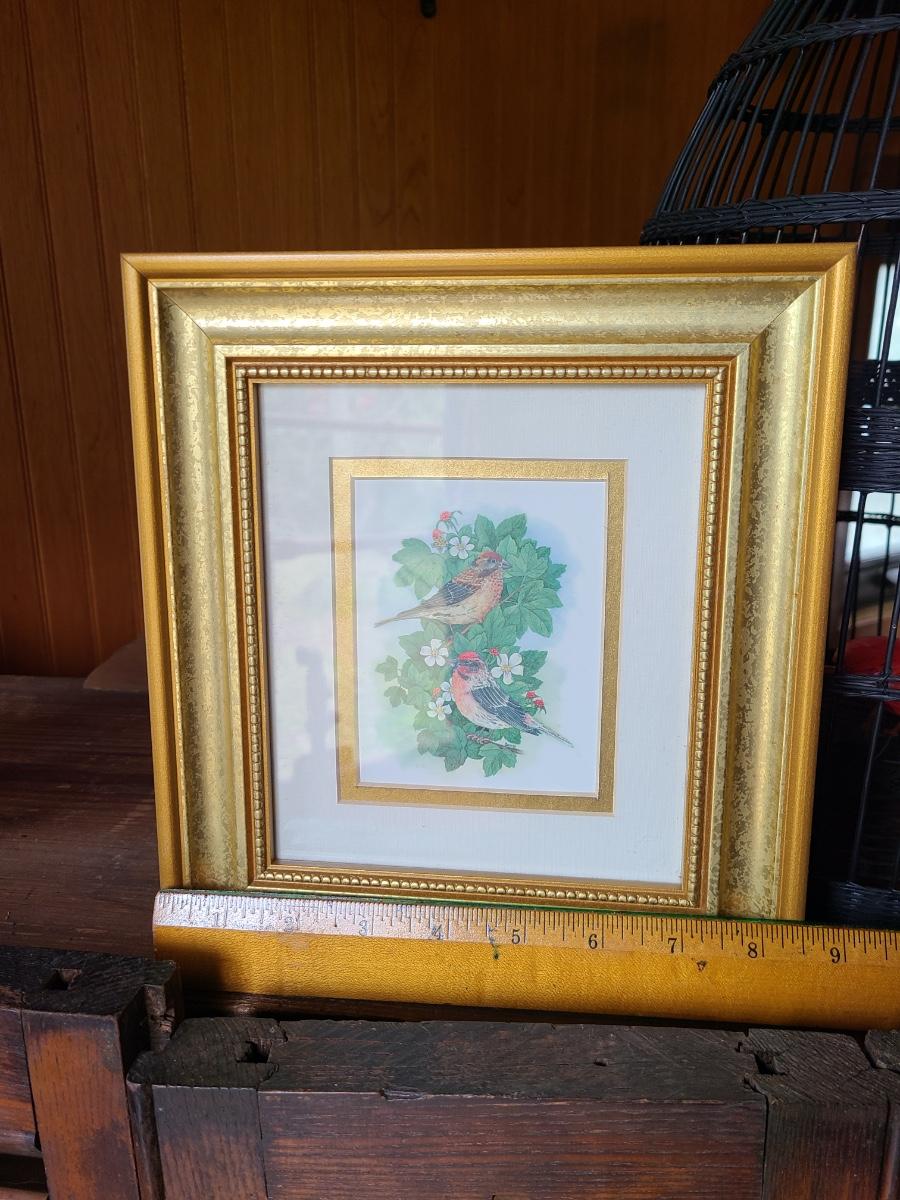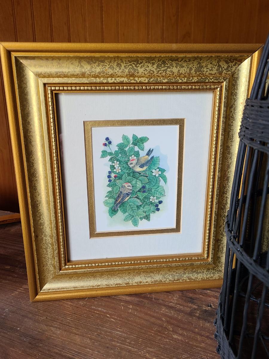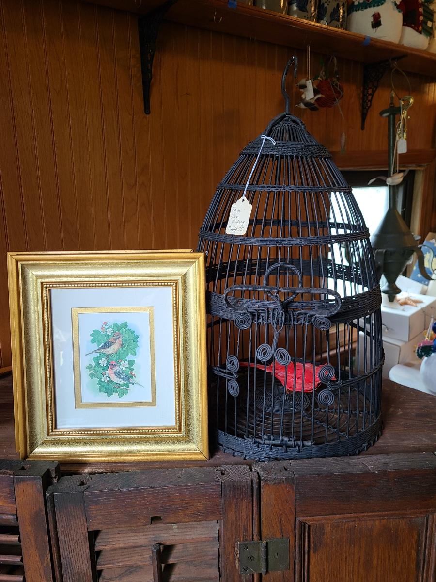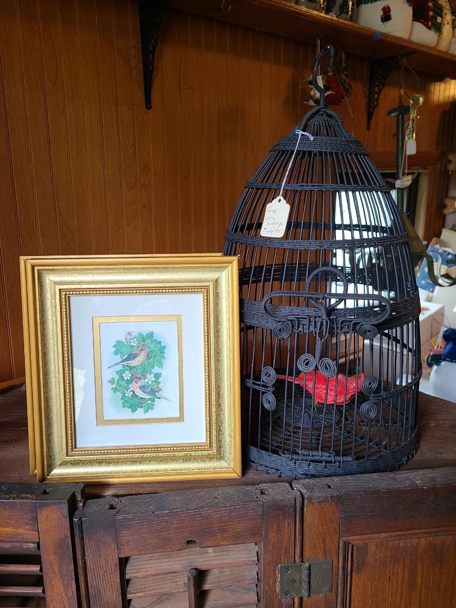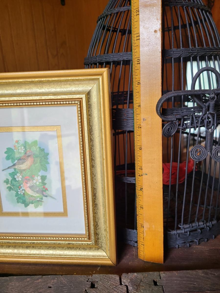 LOT 10C: Black Wire Ornate Bird Cage, and Gold Framed Bird Prints
