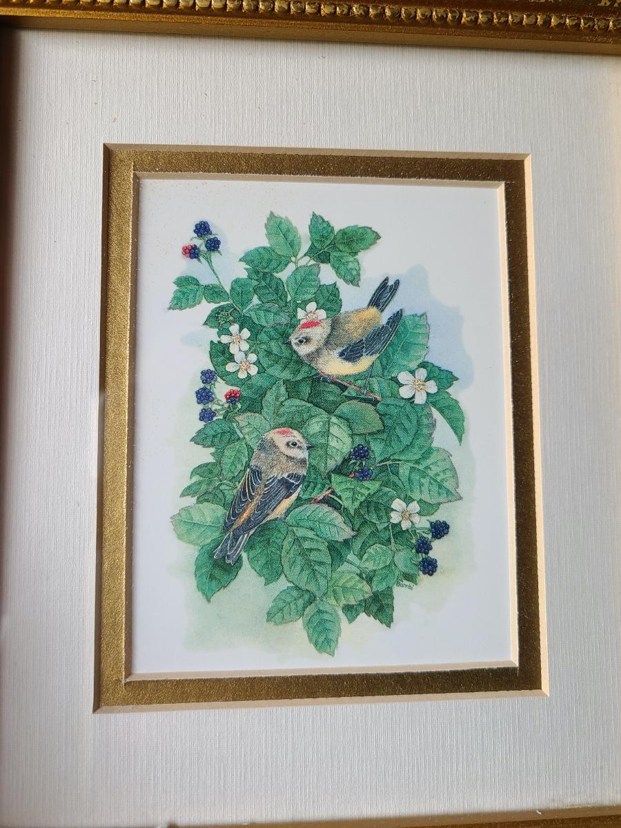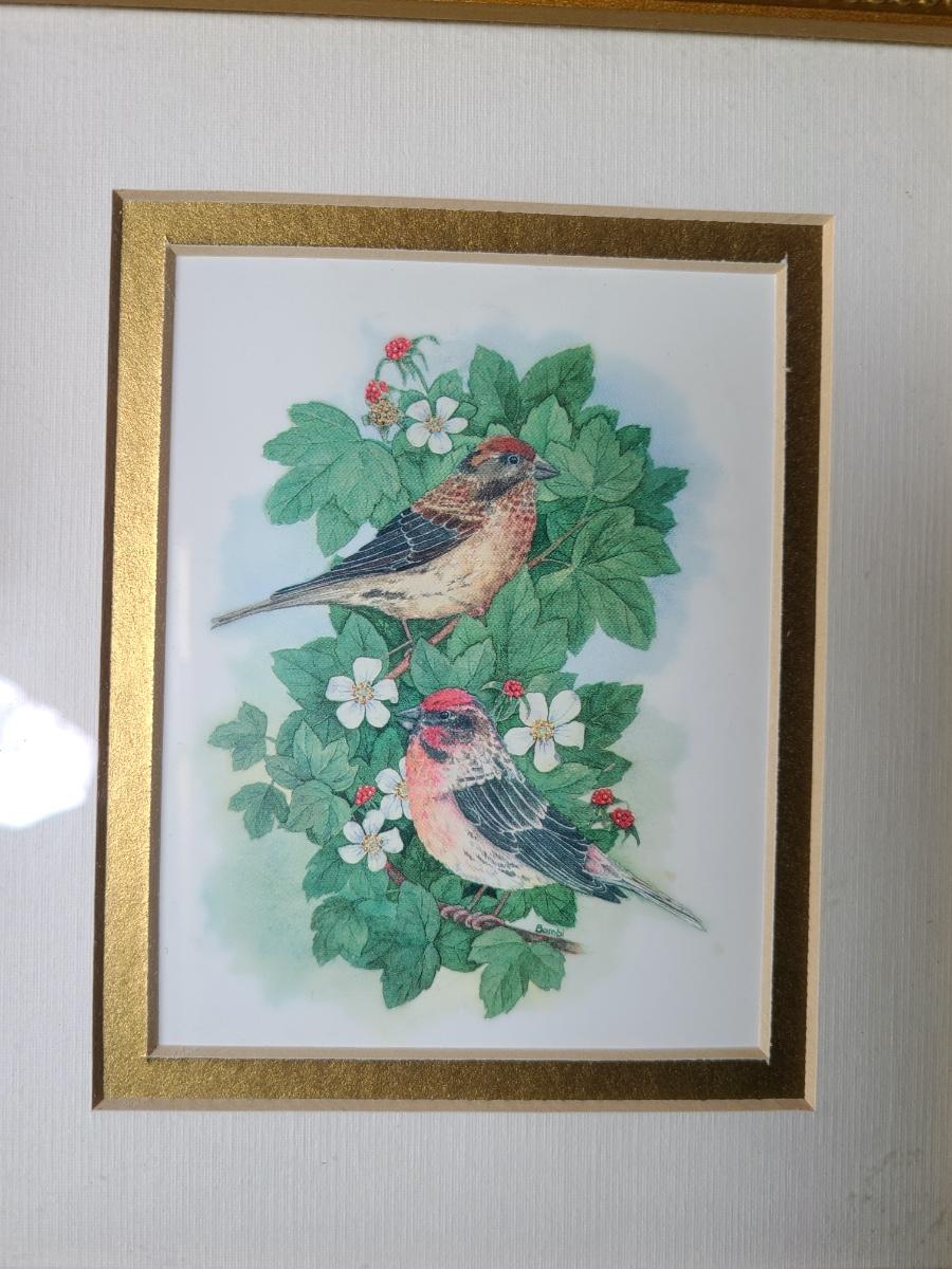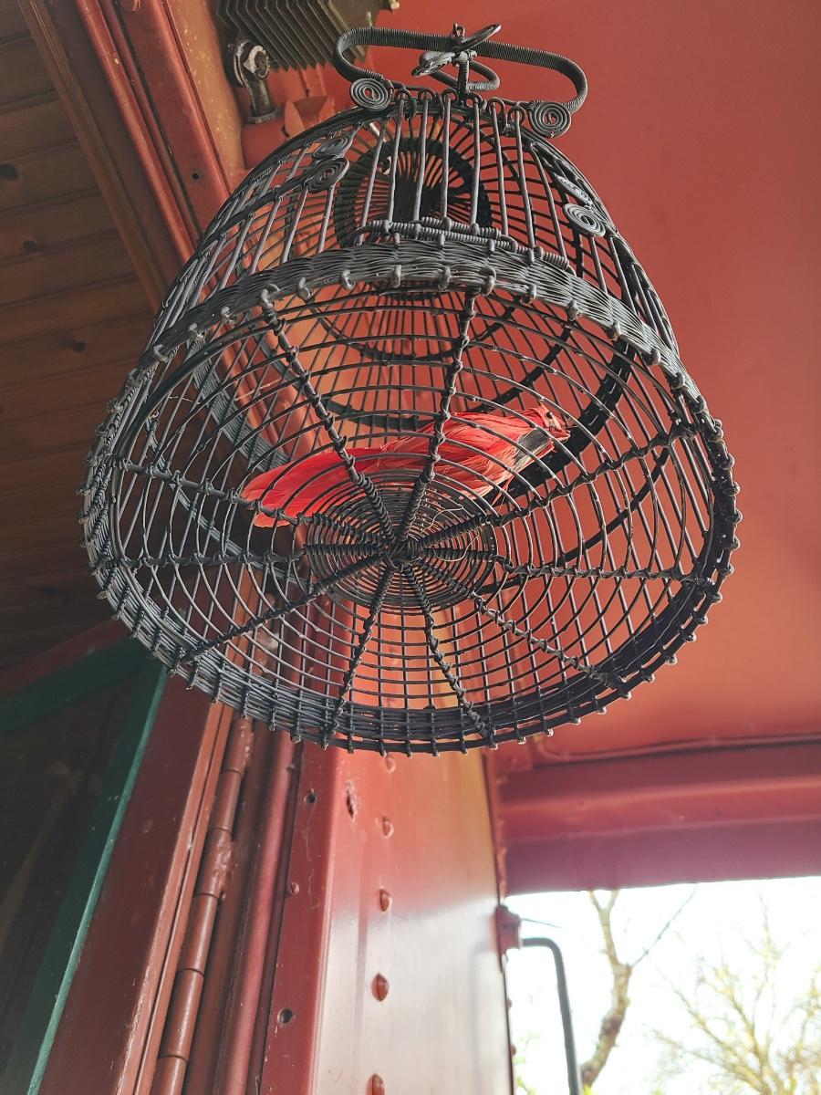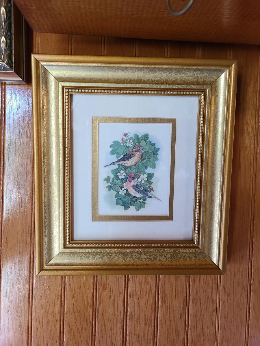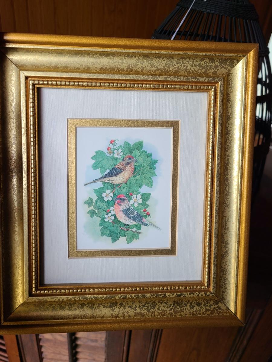 LOT 10C: Black Wire Ornate Bird Cage, and Gold Framed Bird Prints