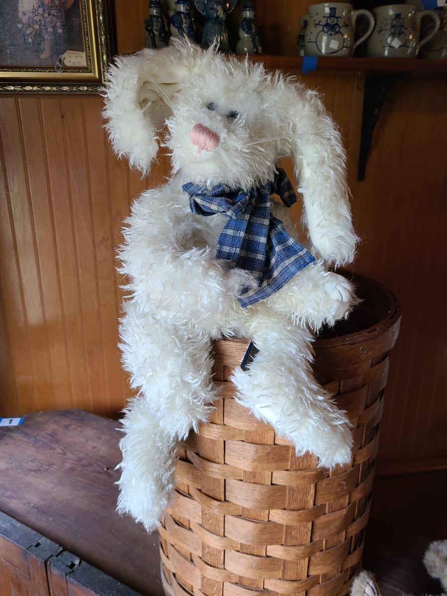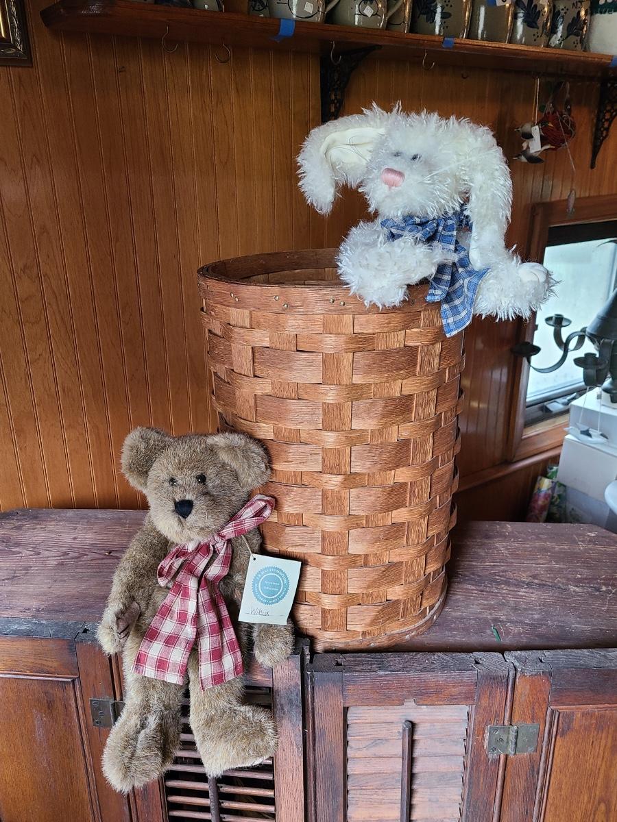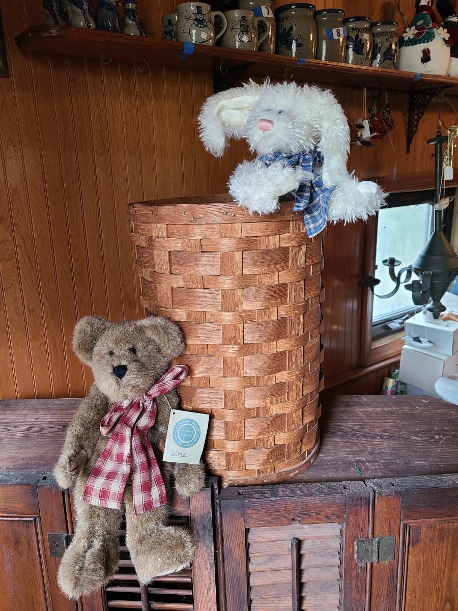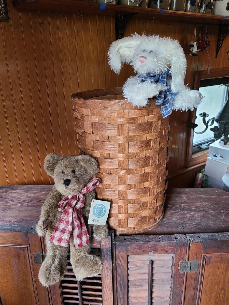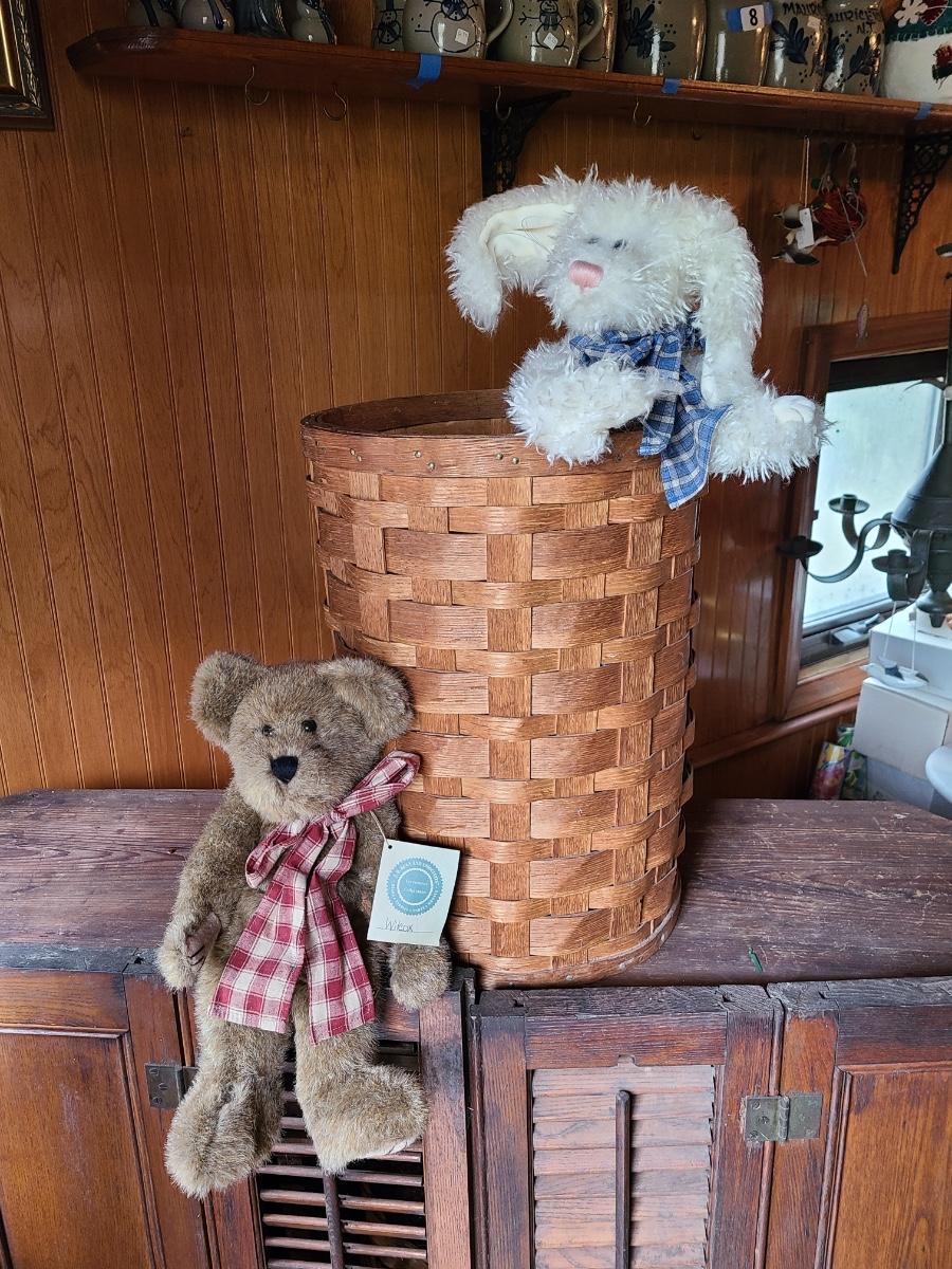 LOT 15C: Tall Delsea Basket Shop Handmade Basket and Boyds Bear/Bunny