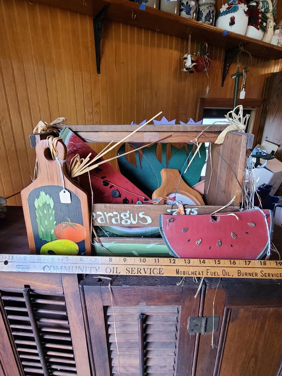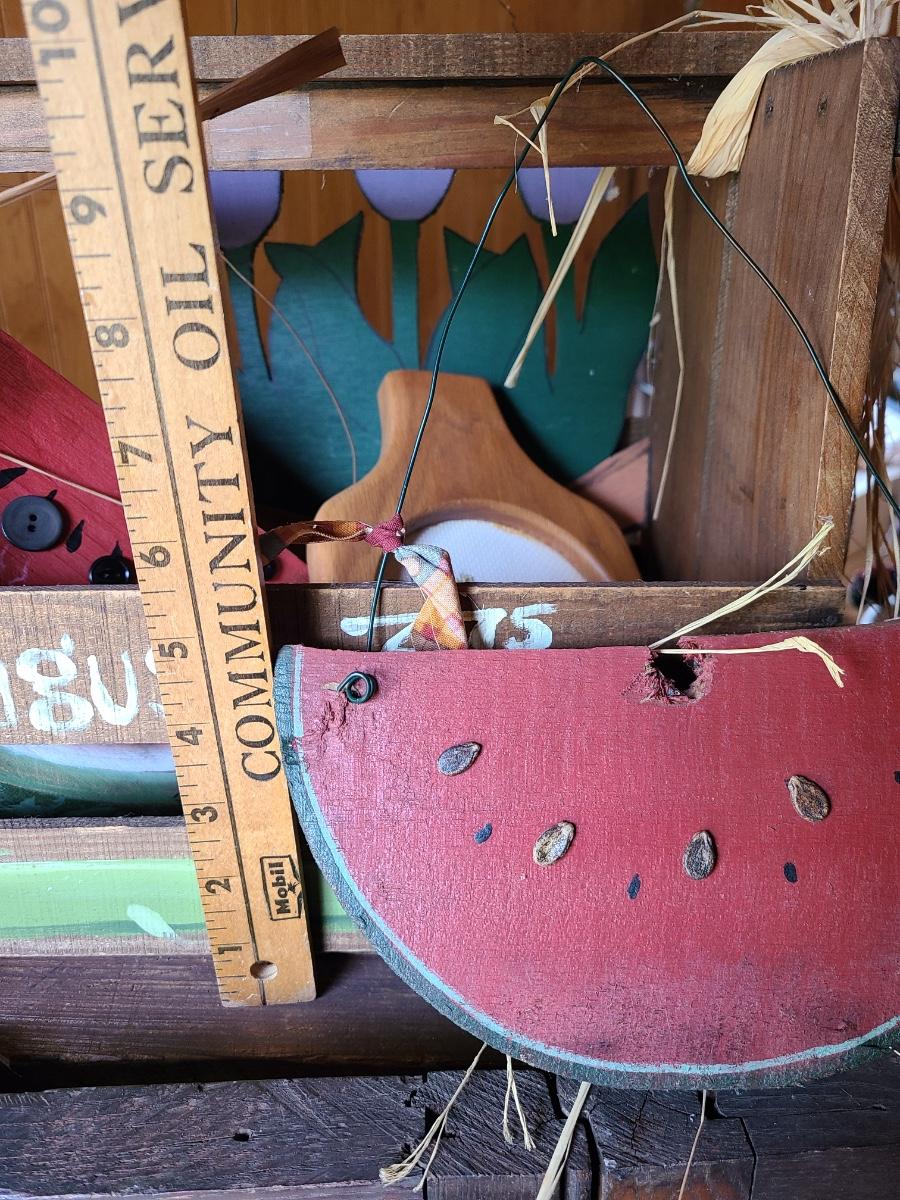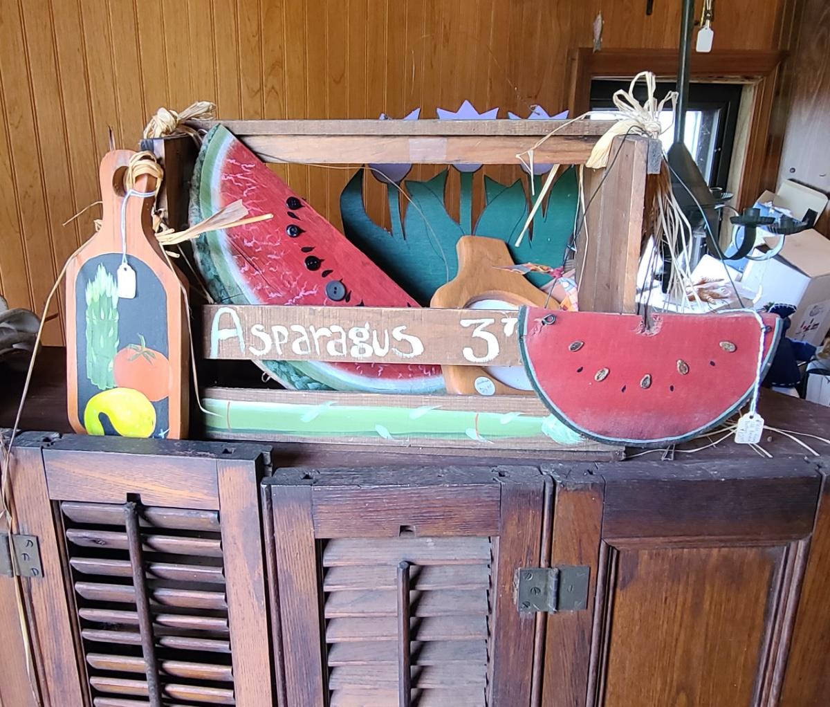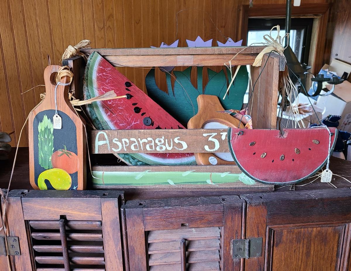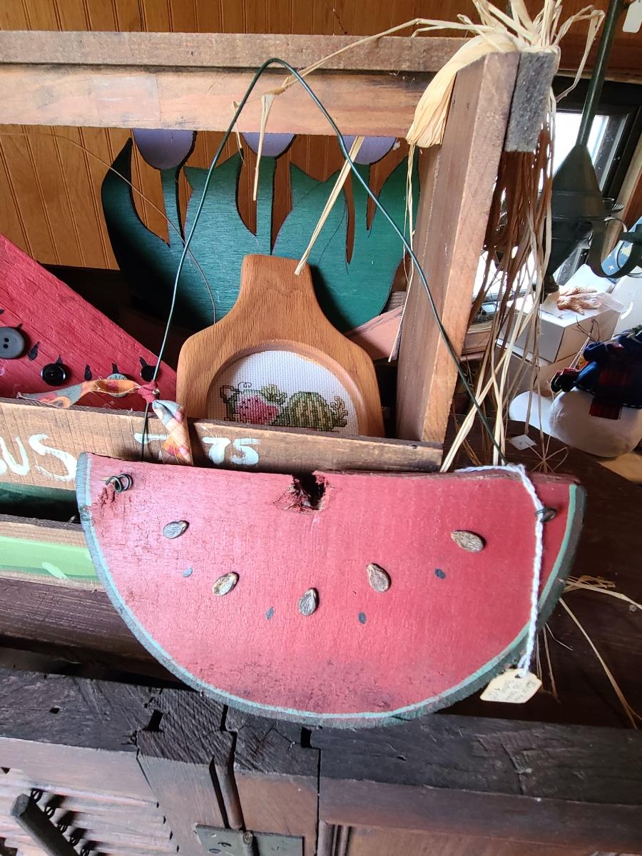 LOT 18C: Wood Crafts: Asparagus Wood Basket, Watermelon Hanging Sign, and More