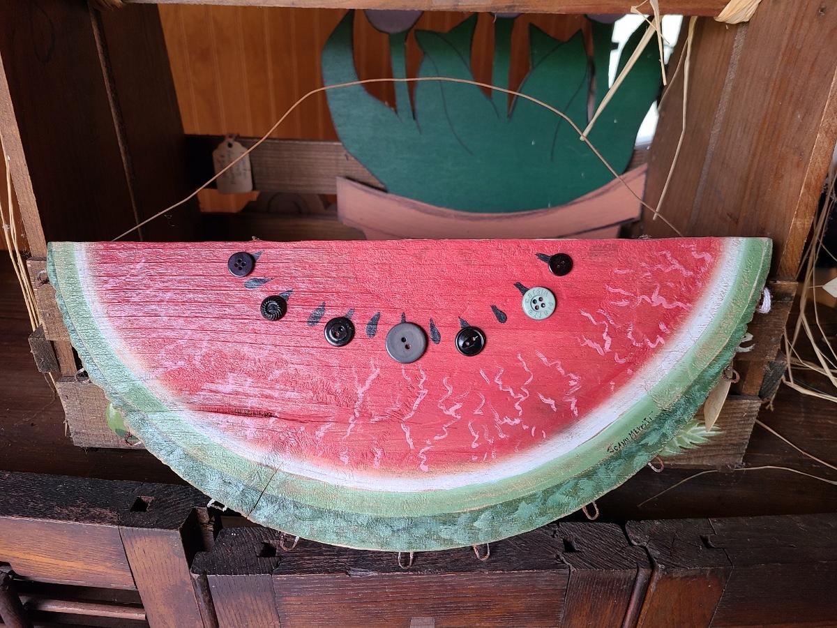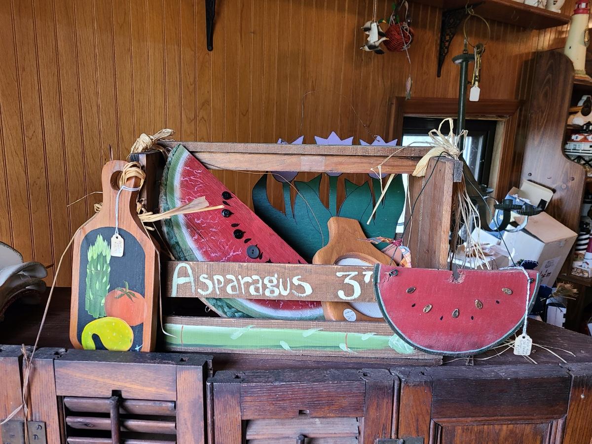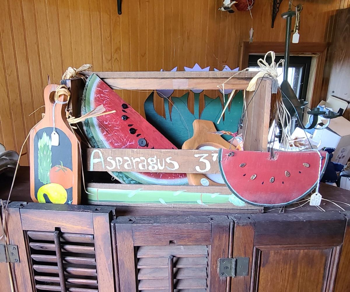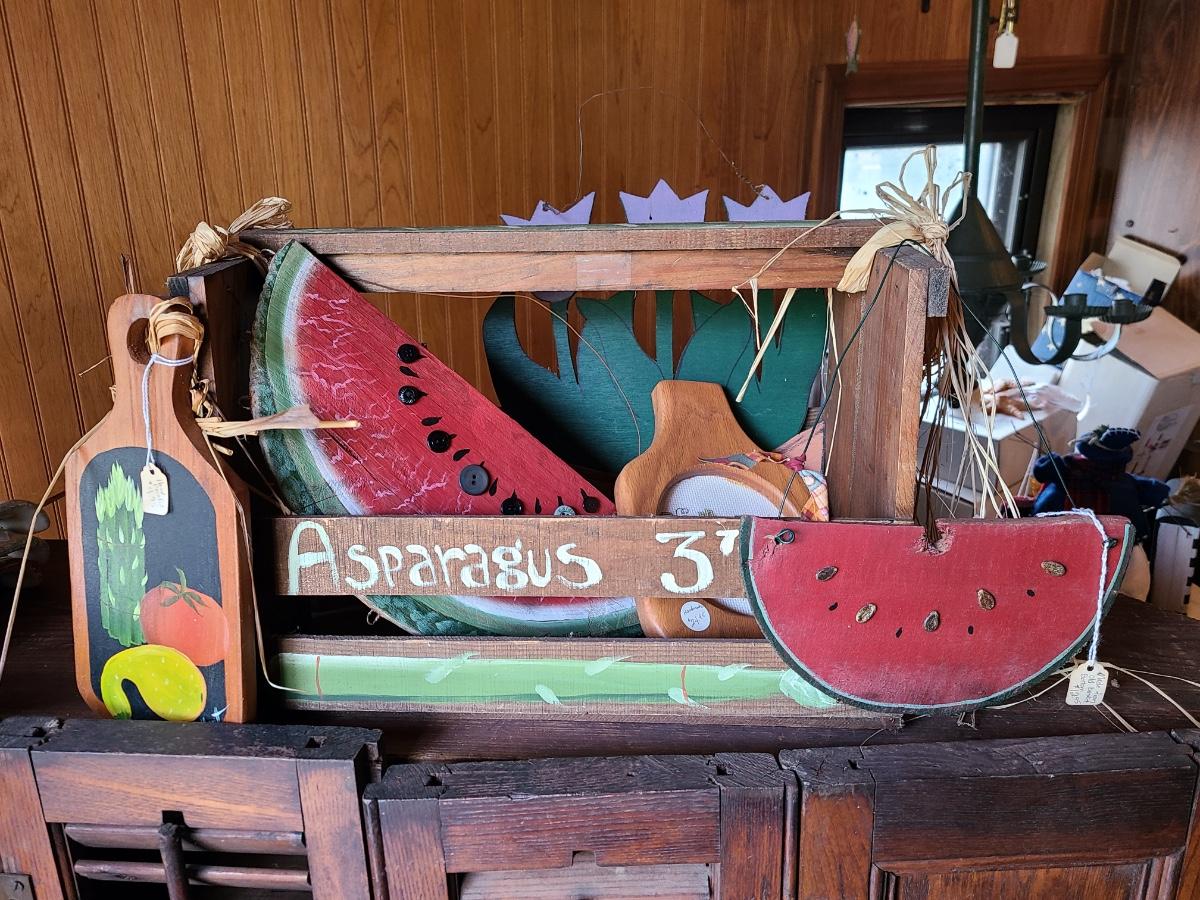 LOT 18C: Wood Crafts: Asparagus Wood Basket, Watermelon Hanging Sign, and More