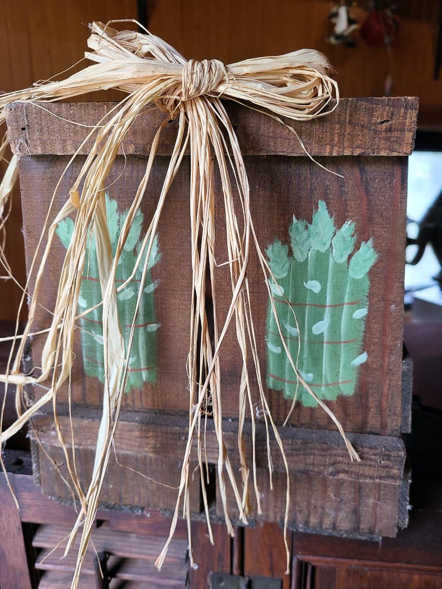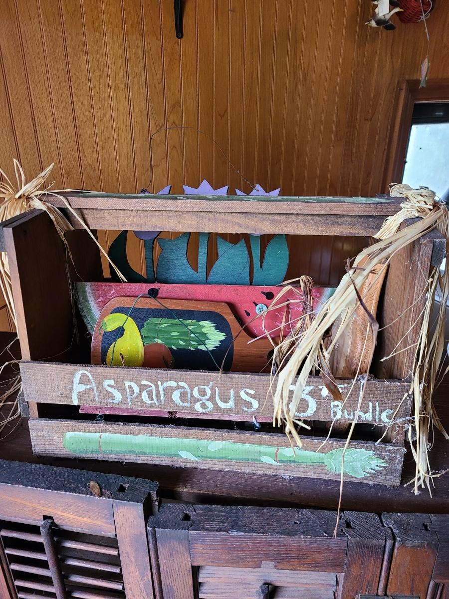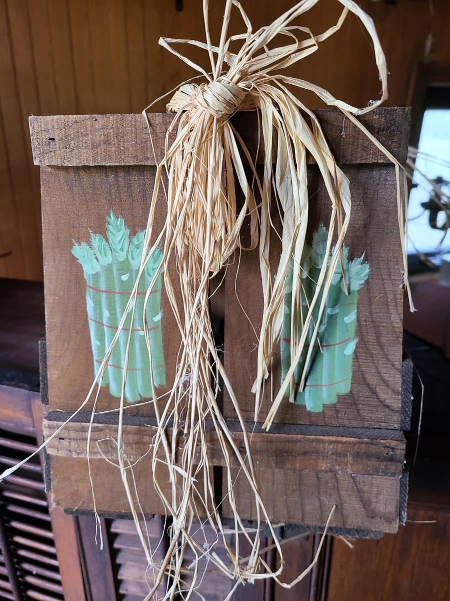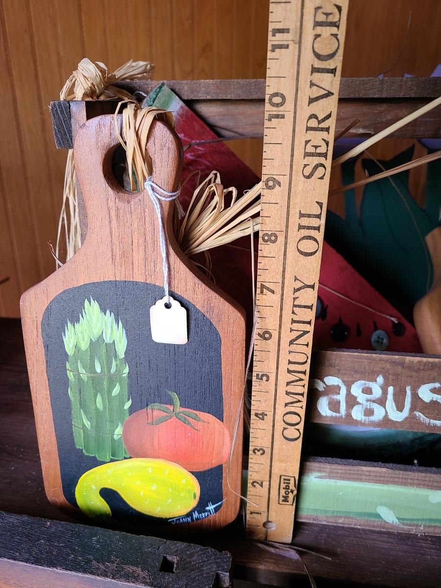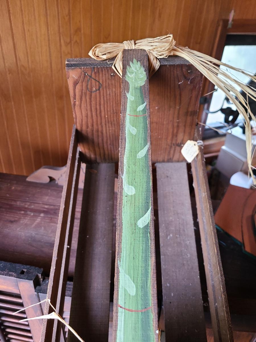 LOT 18C: Wood Crafts: Asparagus Wood Basket, Watermelon Hanging Sign, and More
