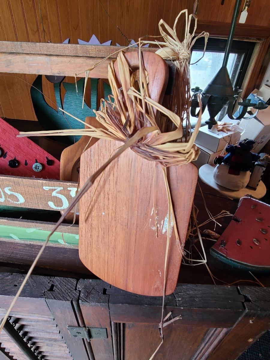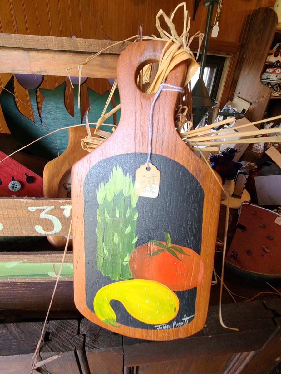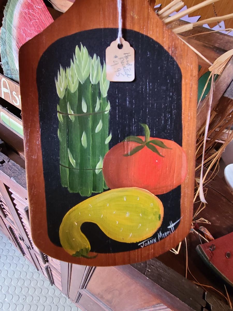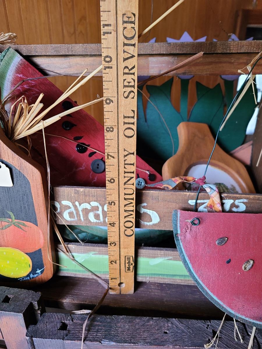 LOT 18C: Wood Crafts: Asparagus Wood Basket, Watermelon Hanging Sign, and More