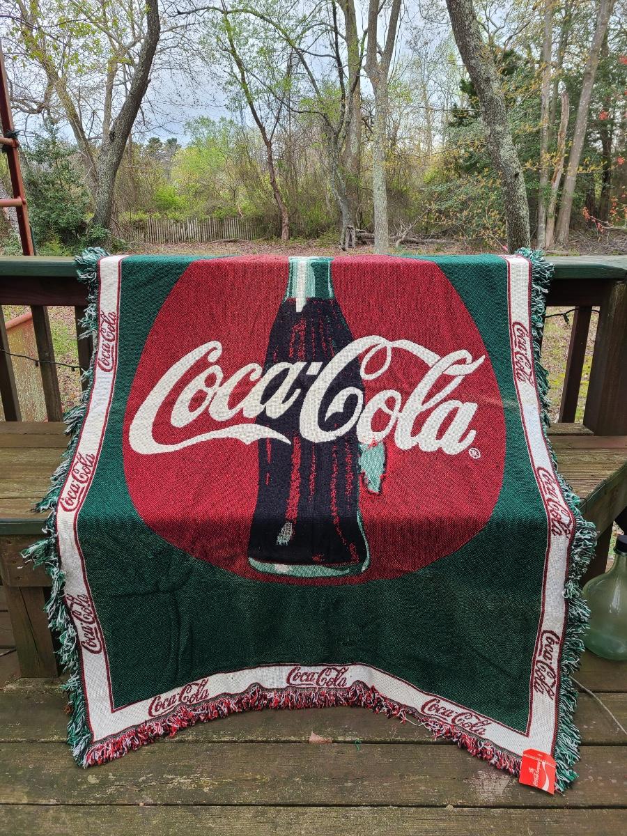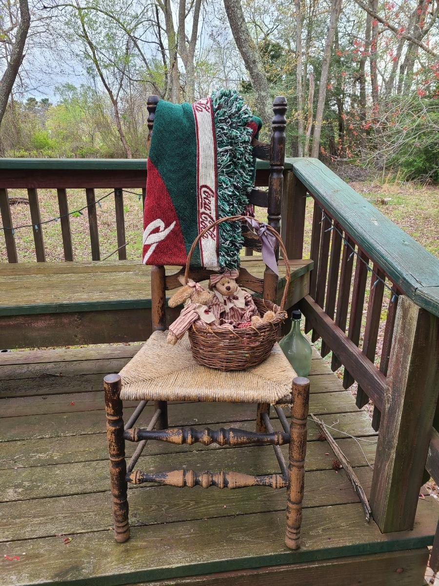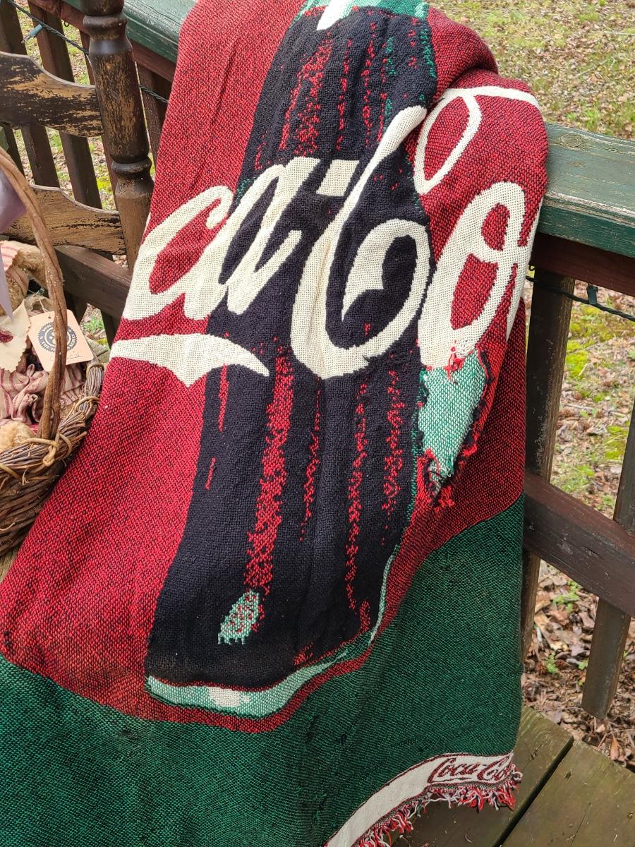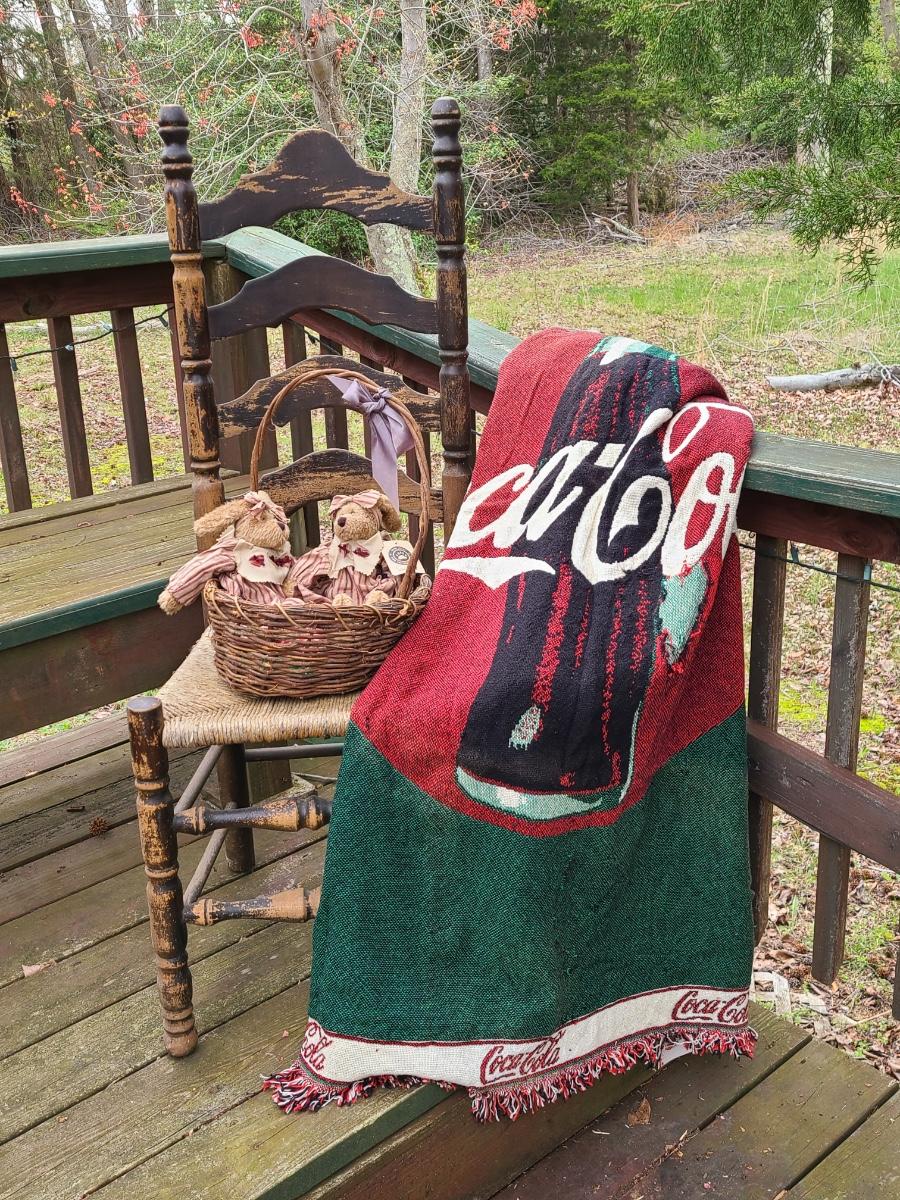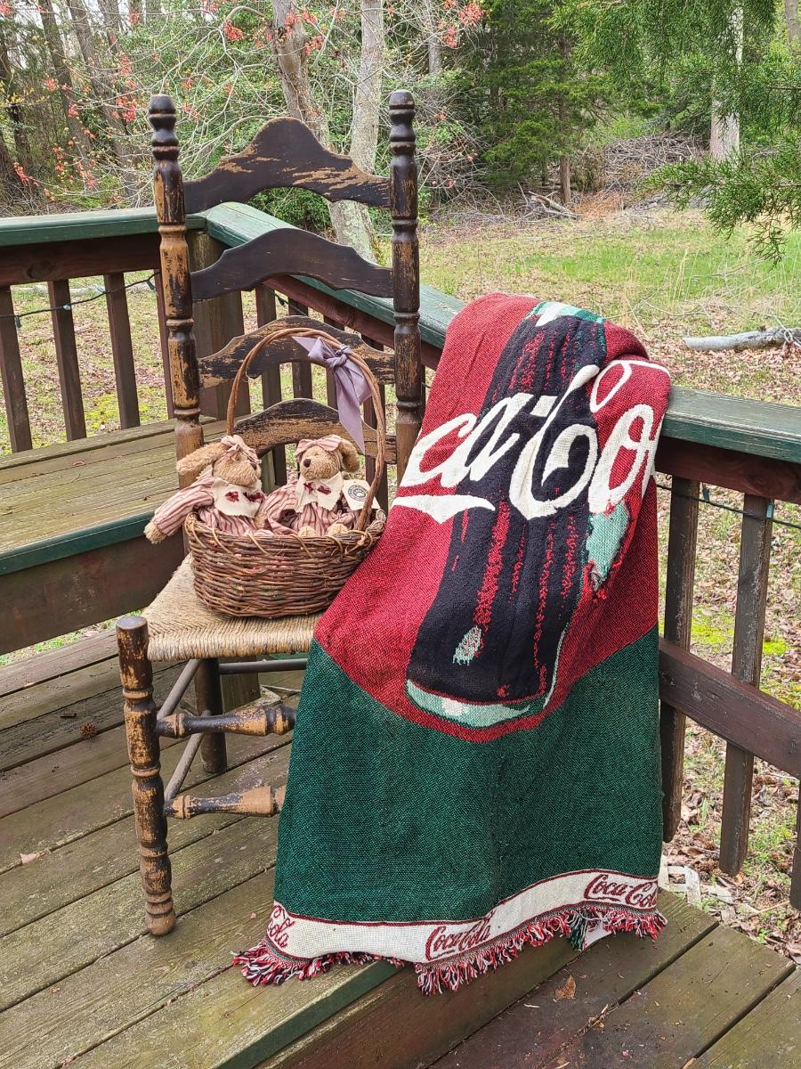 LOT 701: Vintage Ladderback Chair, Boyds Bunnies, and Coca-Cola Blanket As-Is