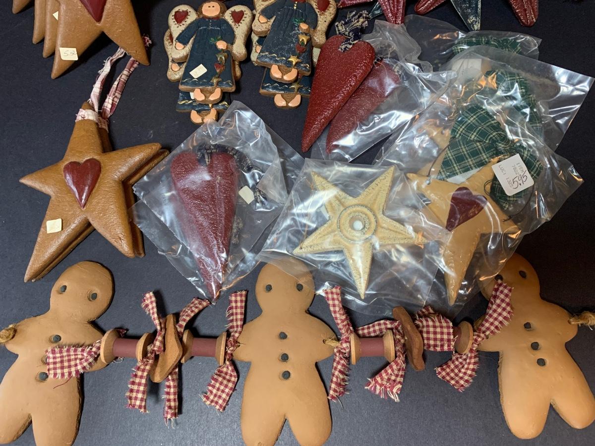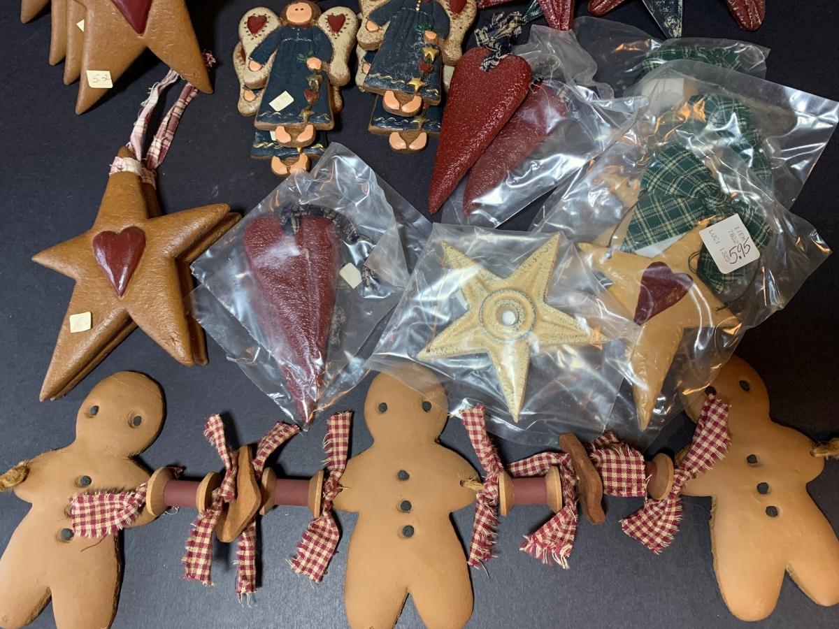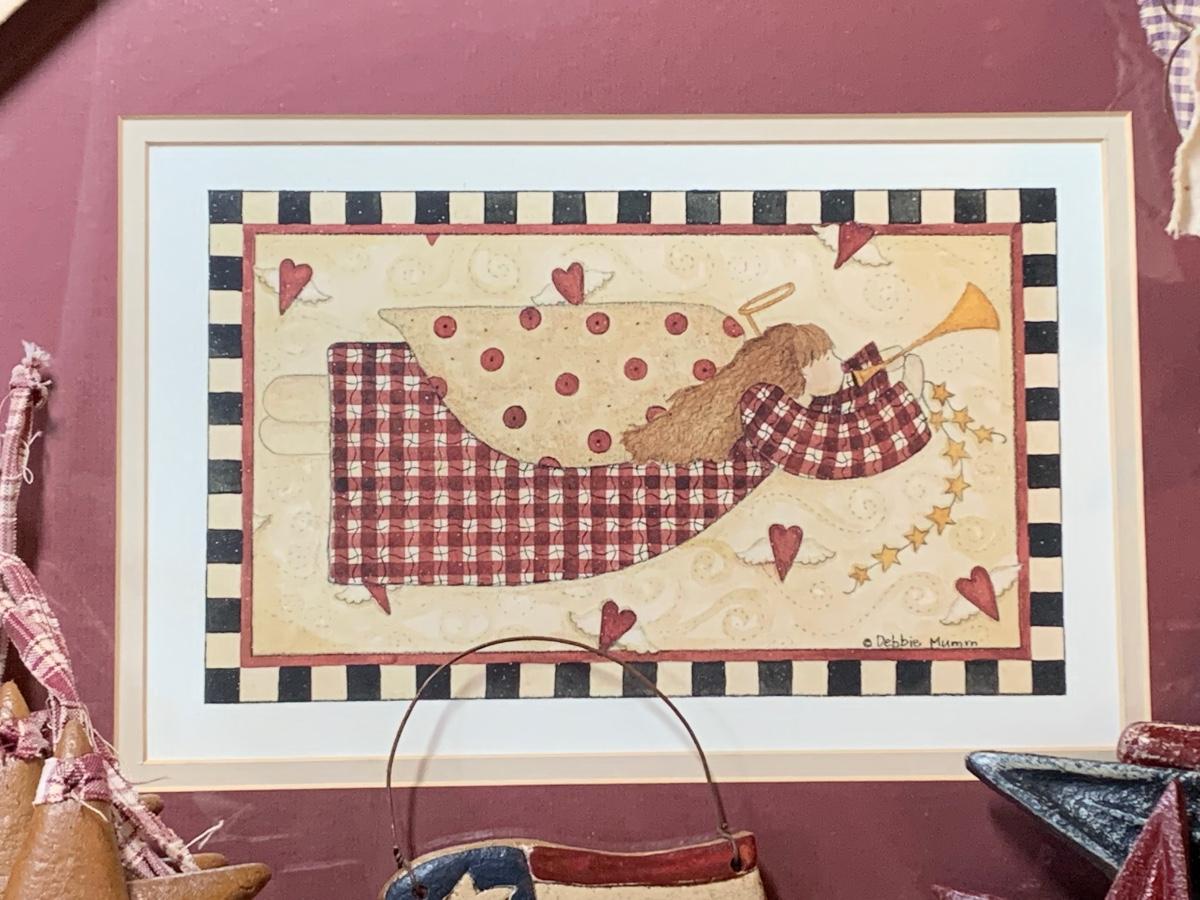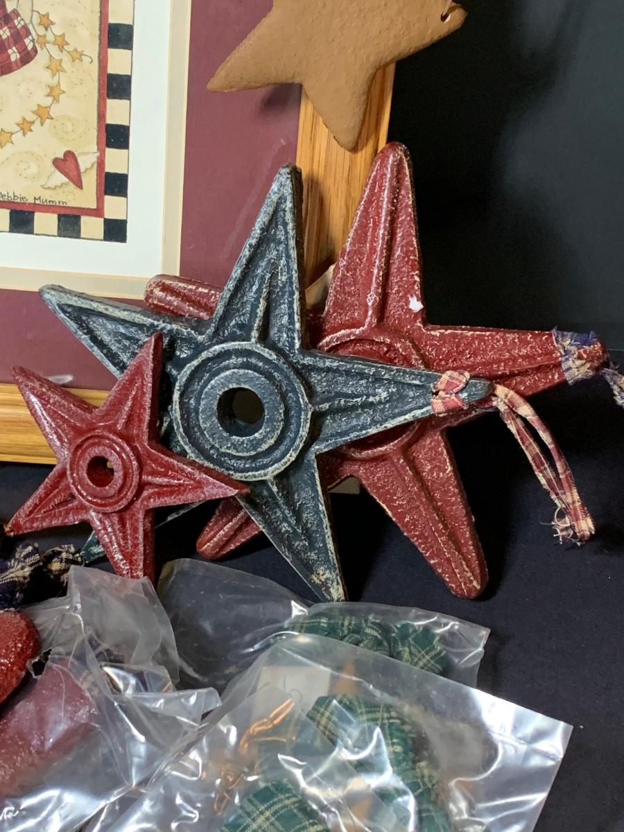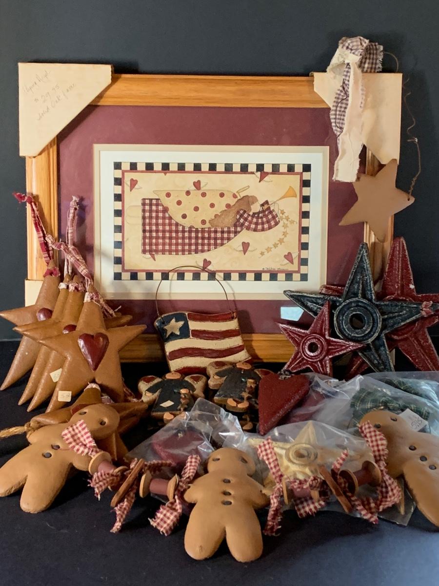 Large collection of primitive home decor including an angle print by Debbie Mumm with oak frame, barn stars, hand angels, hearts, stars and more