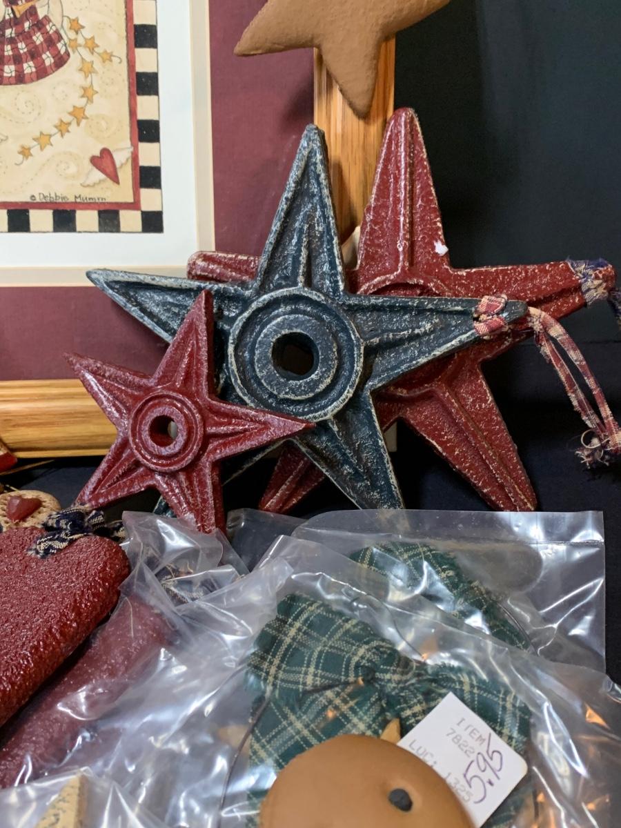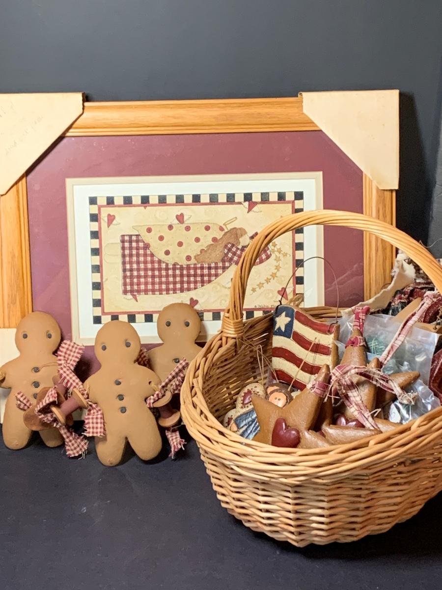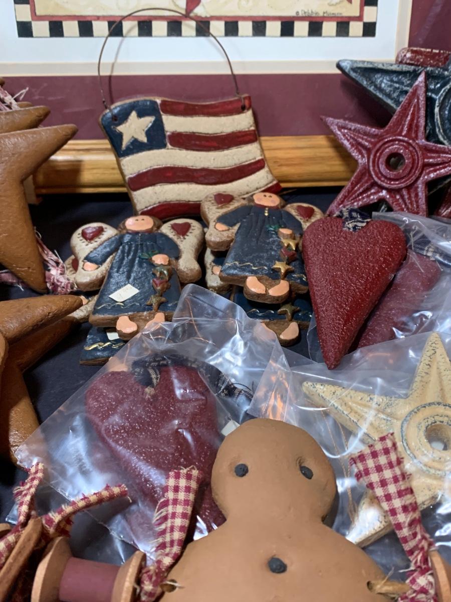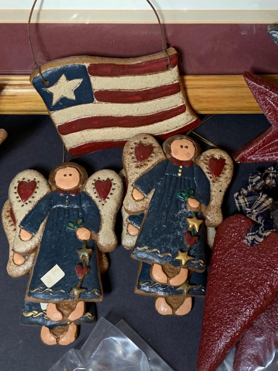 Large collection of primitive home decor including an angle print by Debbie Mumm with oak frame, barn stars, hand angels, hearts, stars and more