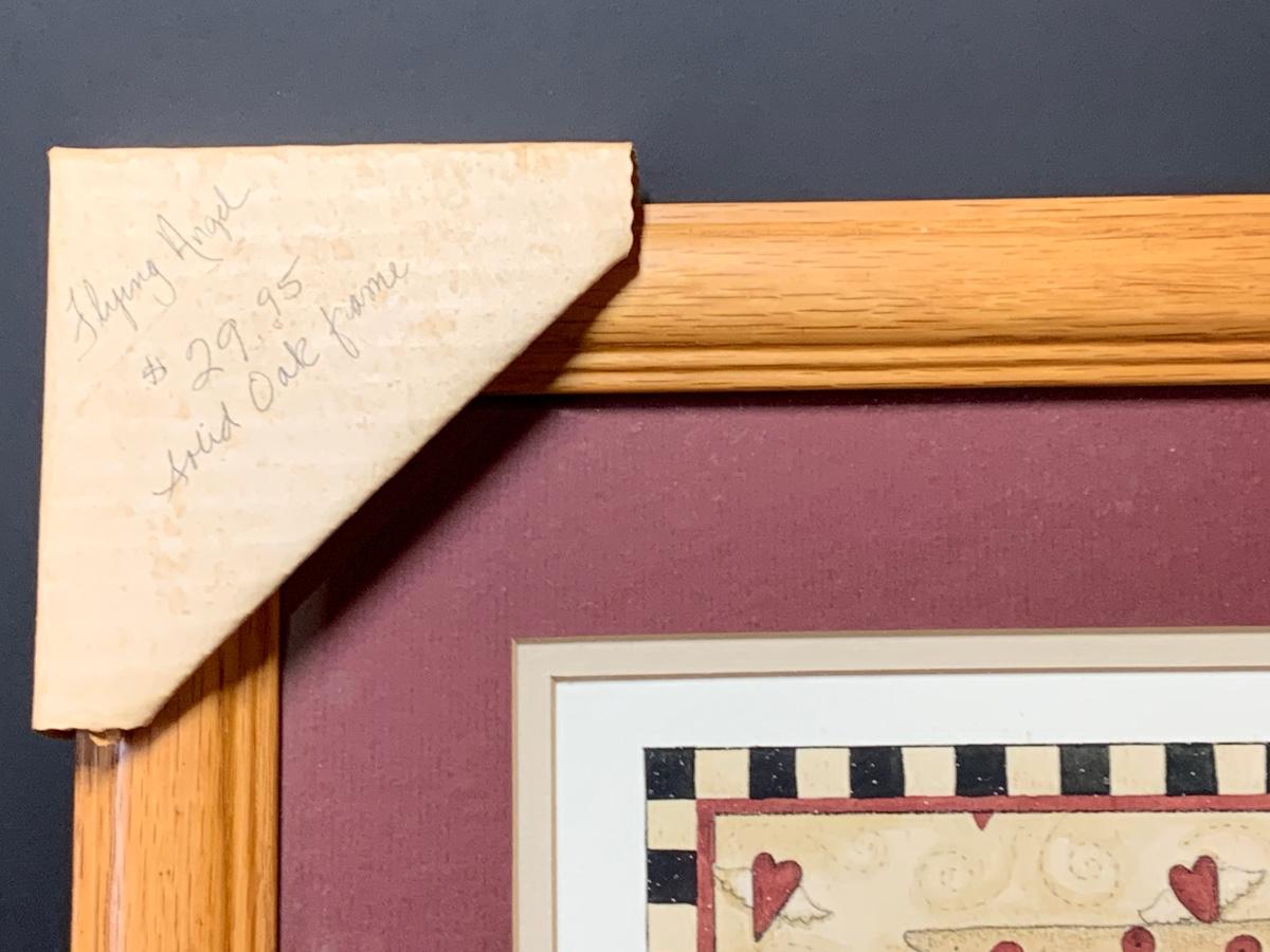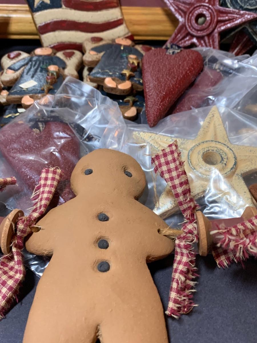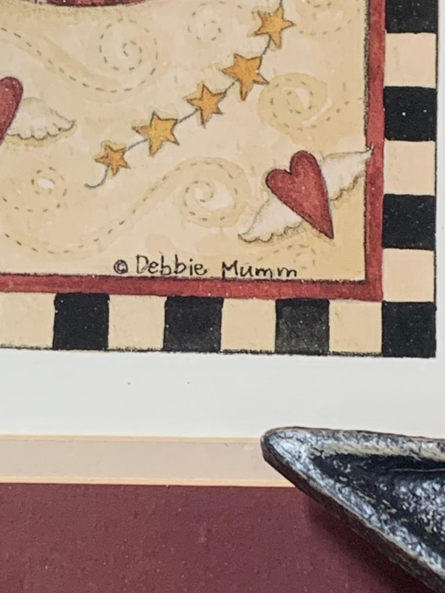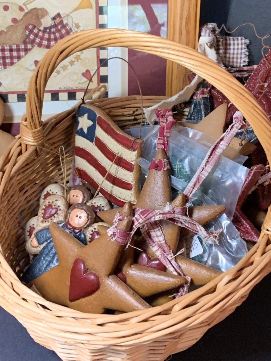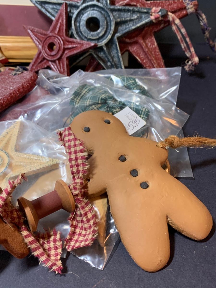 Large collection of primitive home decor including an angle print by Debbie Mumm with oak frame, barn stars, hand angels, hearts, stars and more