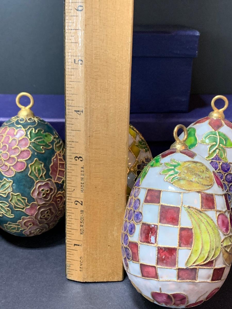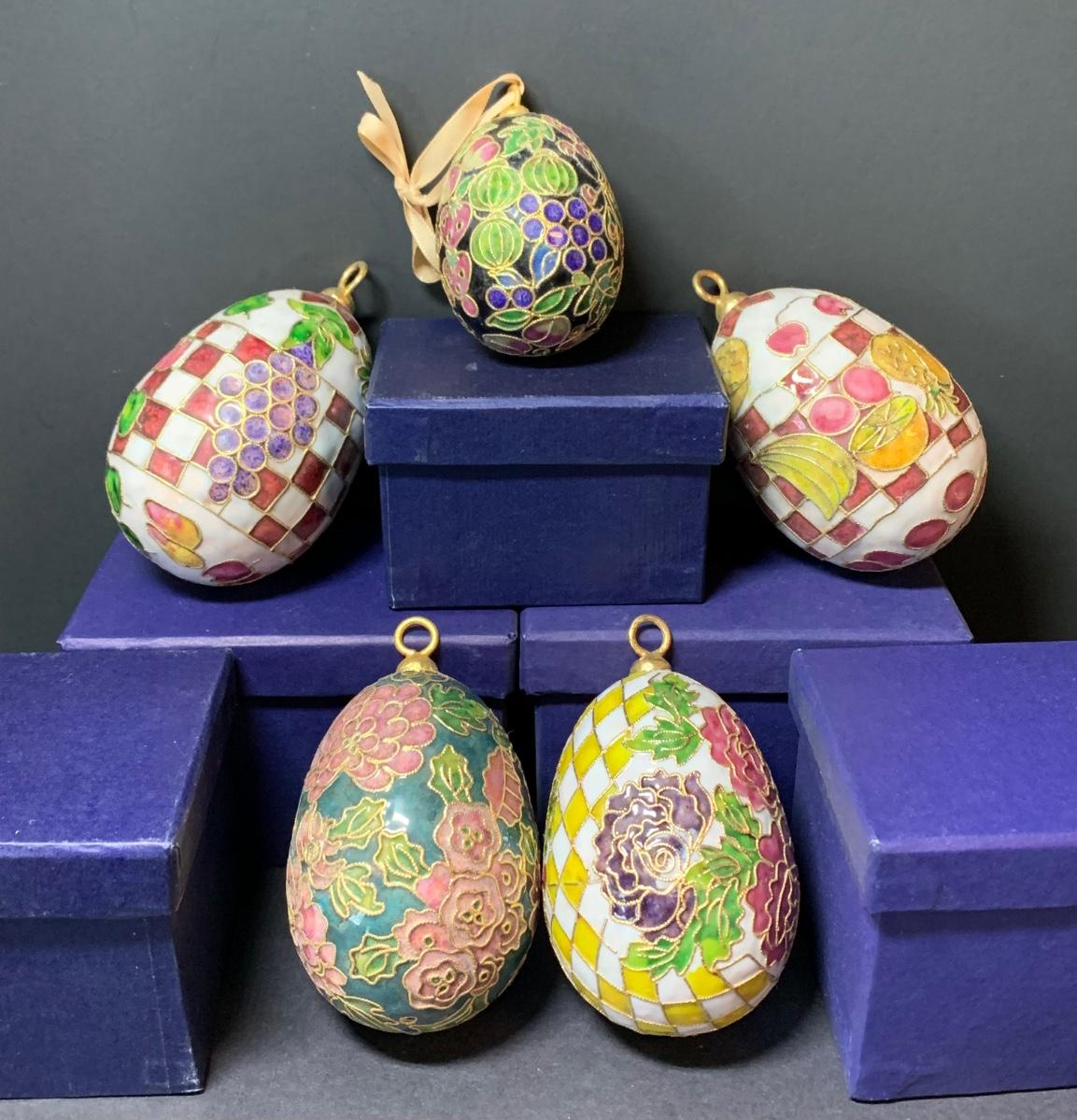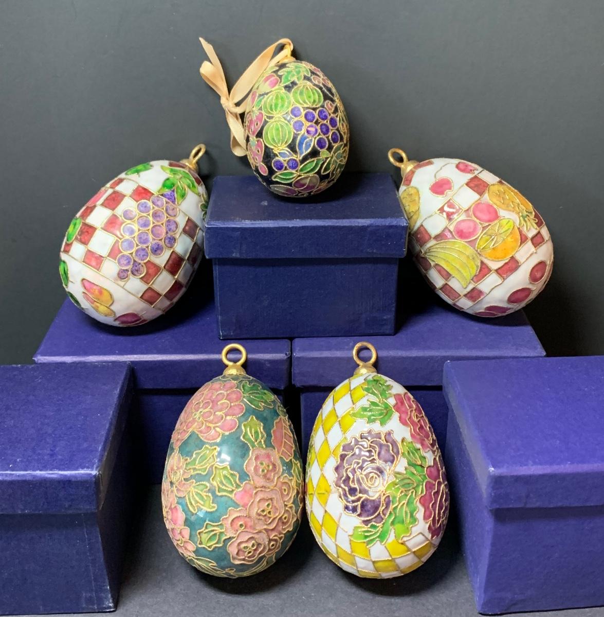 LOT 62R: Victorian Enamelling/Cloisonné Style Egg Ornaments w/Boxes: Floral & Fruit