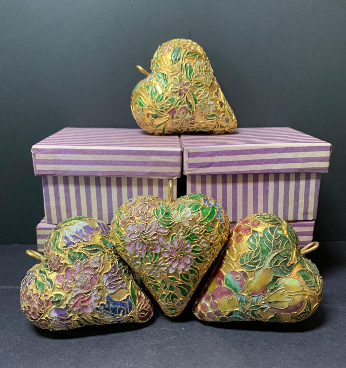 LOT 63R: Victorian Enamelling/Cloisonné  Style Heart Ornaments w/Boxes: Fruit & Floral