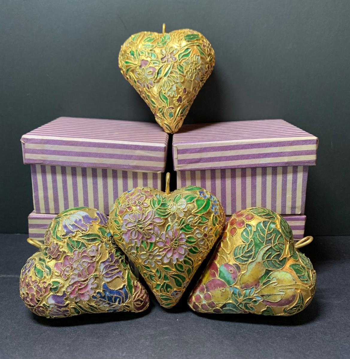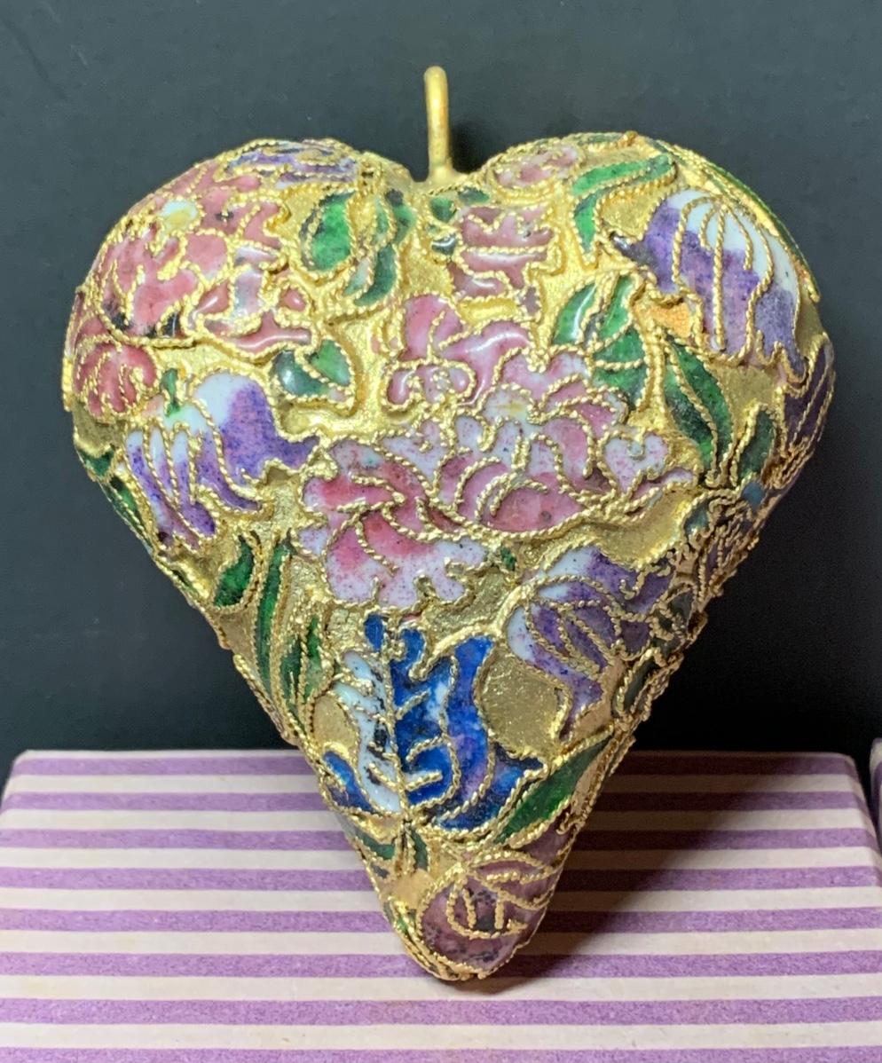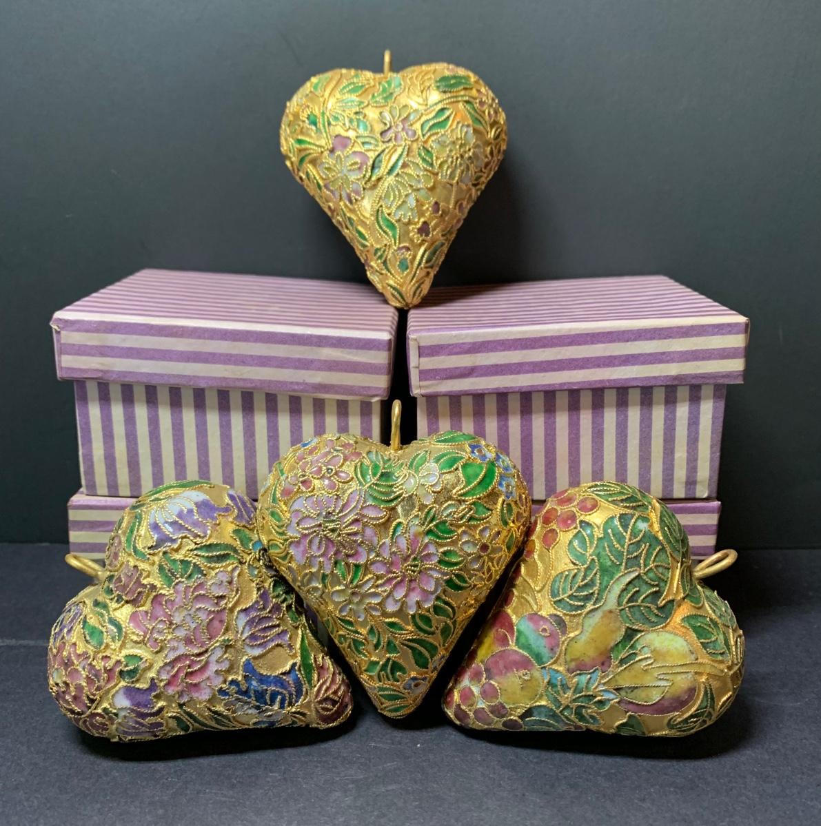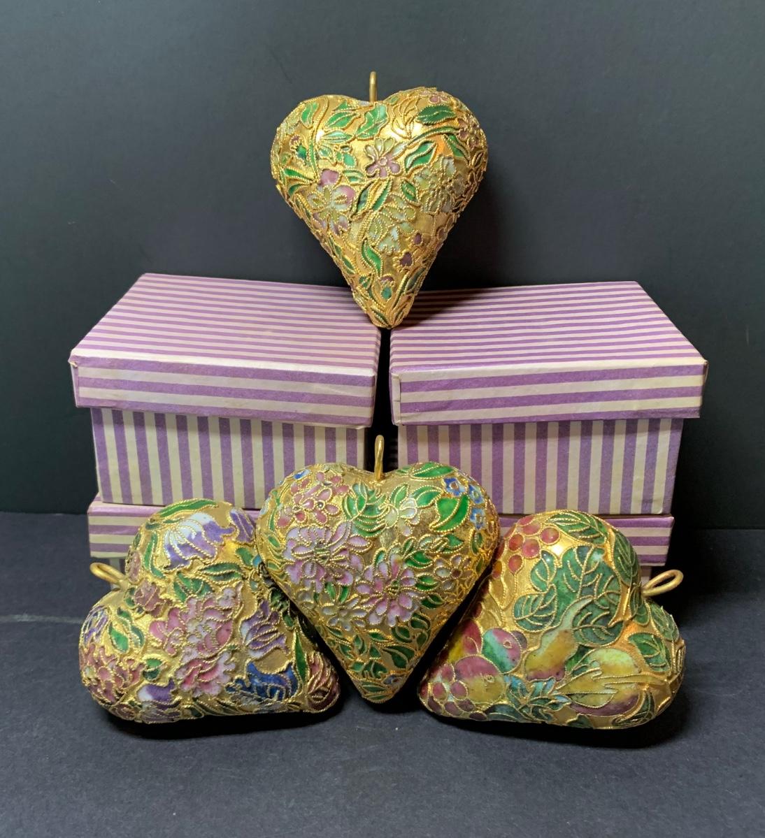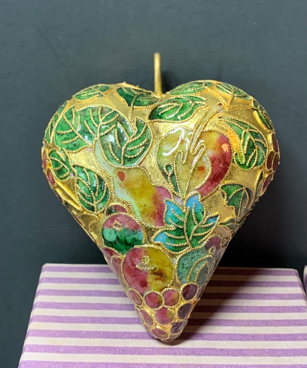 LOT 63R: Victorian Enamelling/Cloisonné Style Heart Ornaments w/Boxes: Fruit & Floral