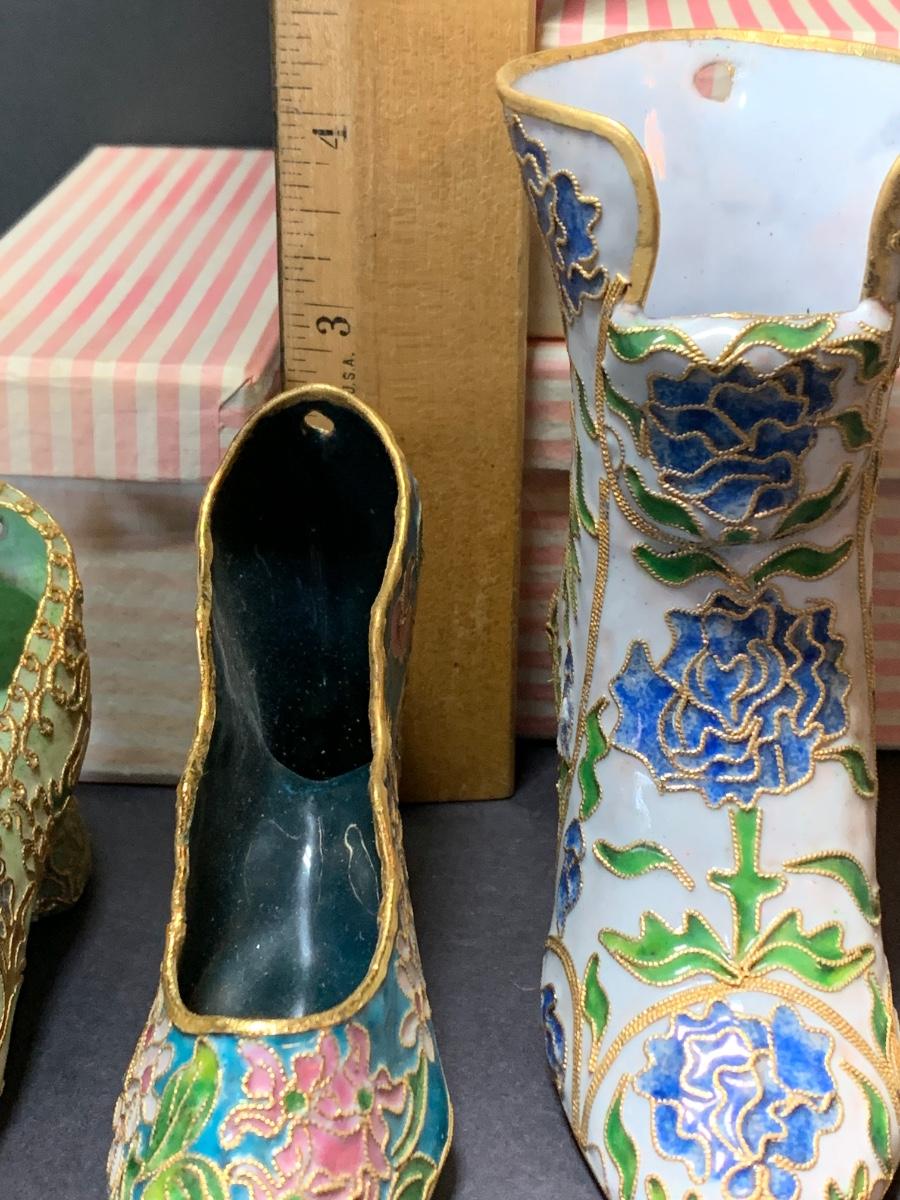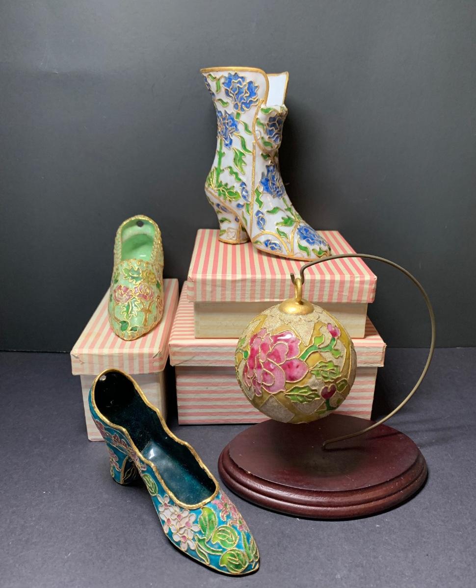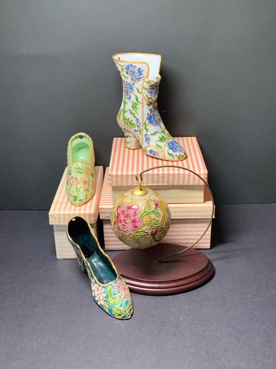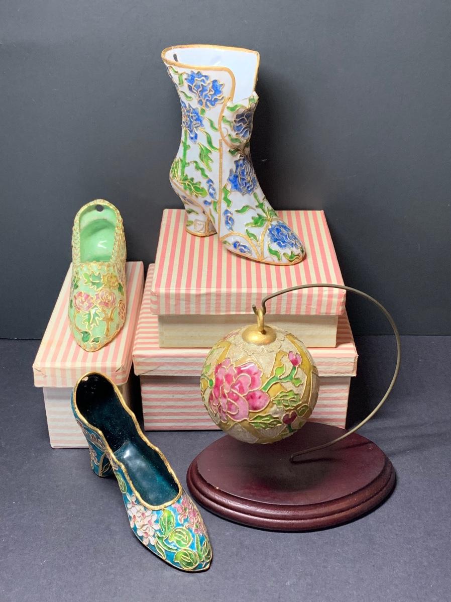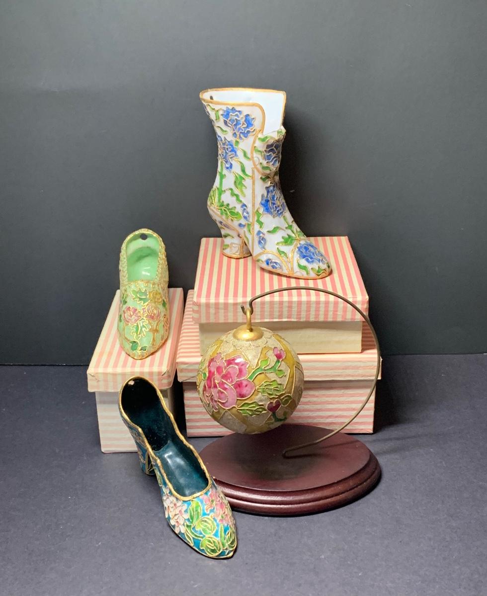 LOT 67R Victorian Enamelling/Cloisonné Style Shoe Ornaments w/ Boxes  & Ball Ornament w/Stand