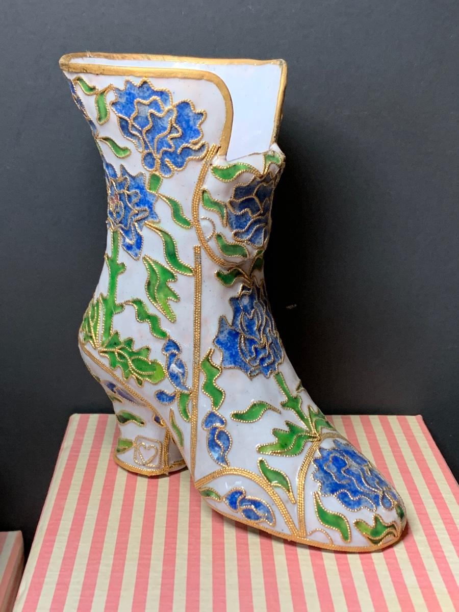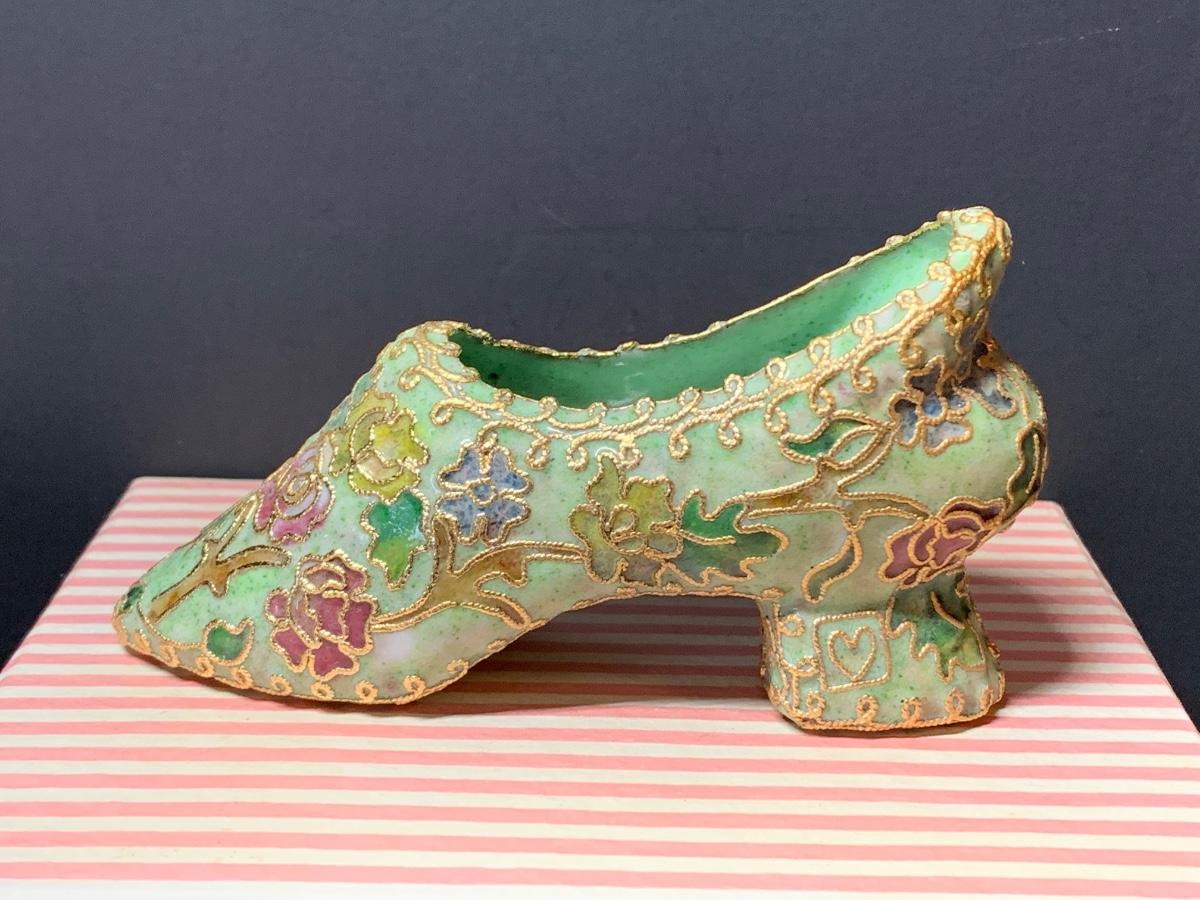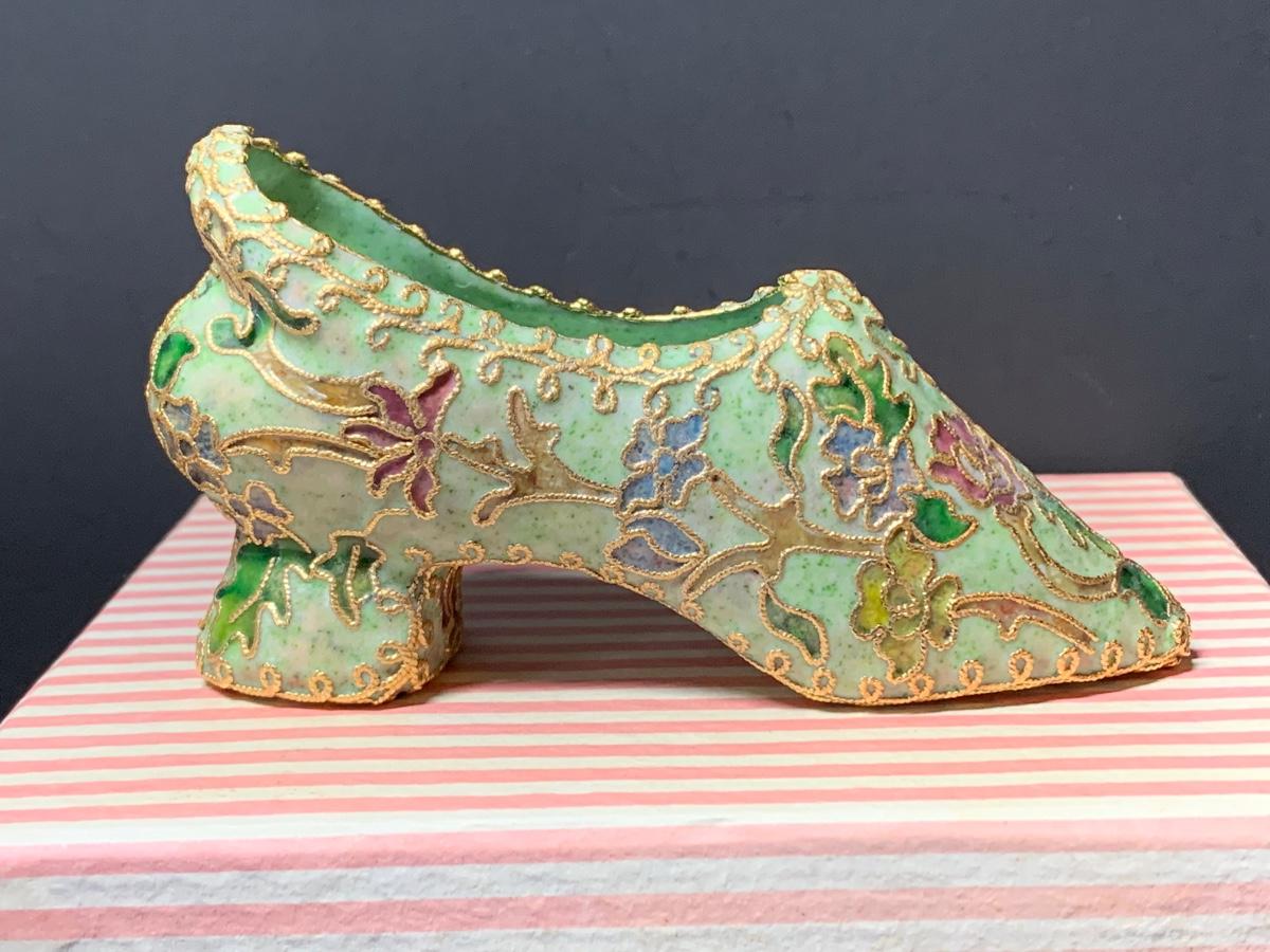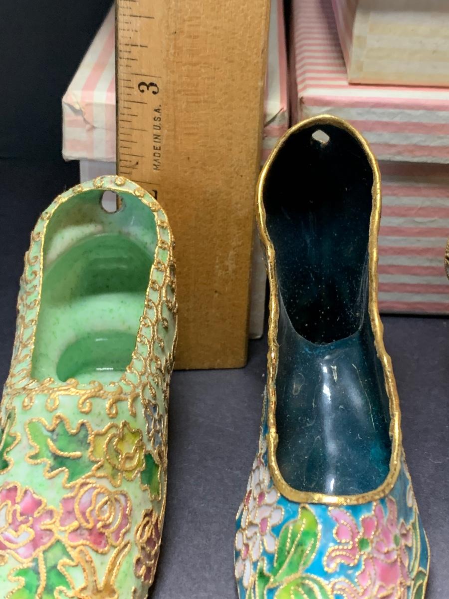 LOT 67R Victorian Enamelling/Cloisonné Style Shoe Ornaments w/ Boxes  & Ball Ornament w/Stand