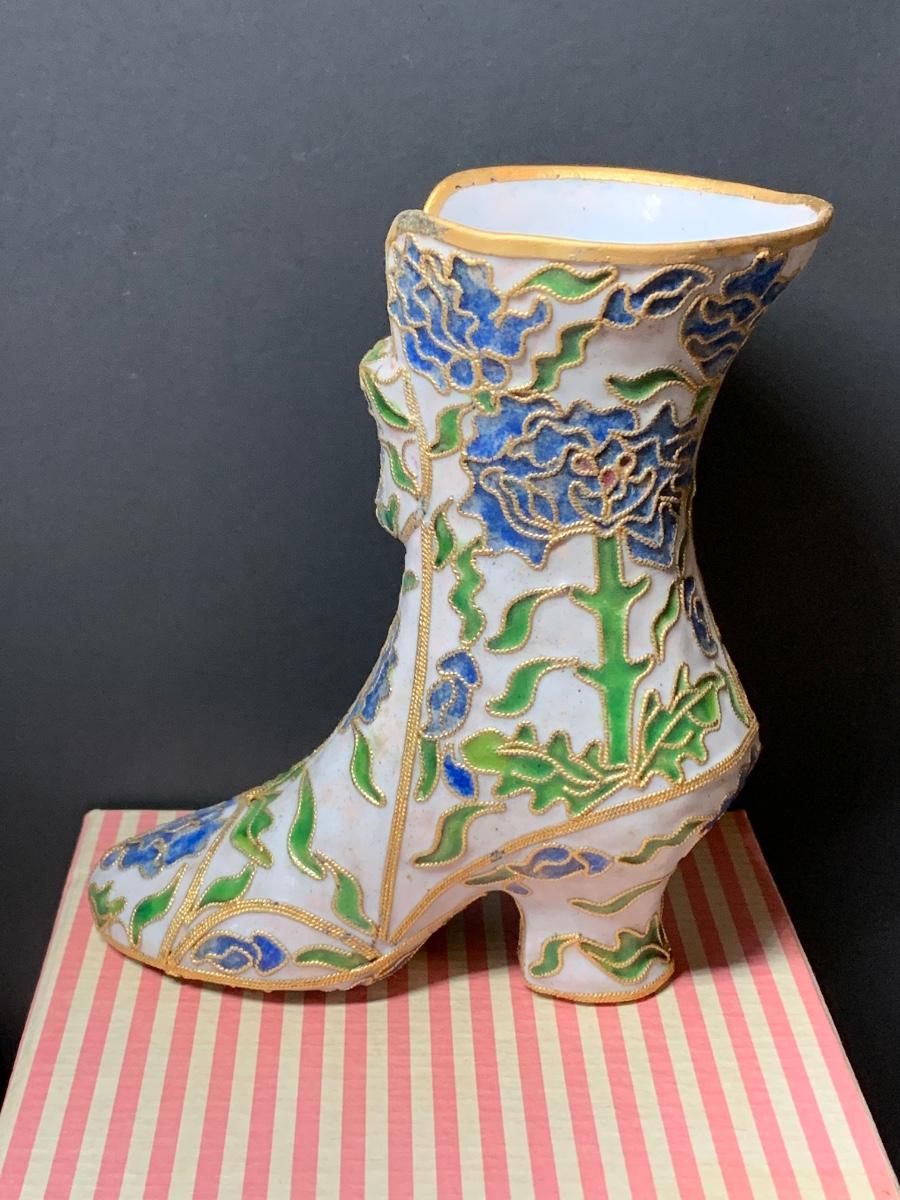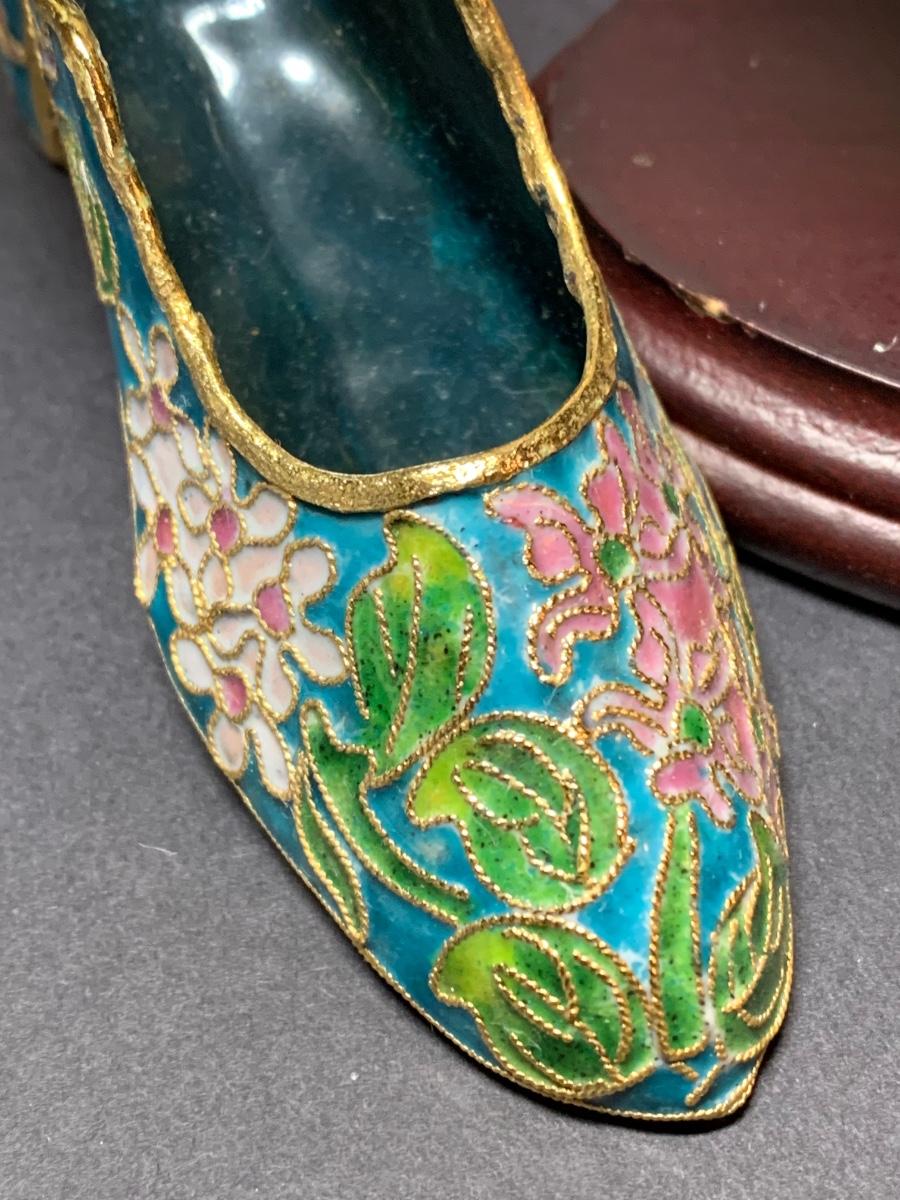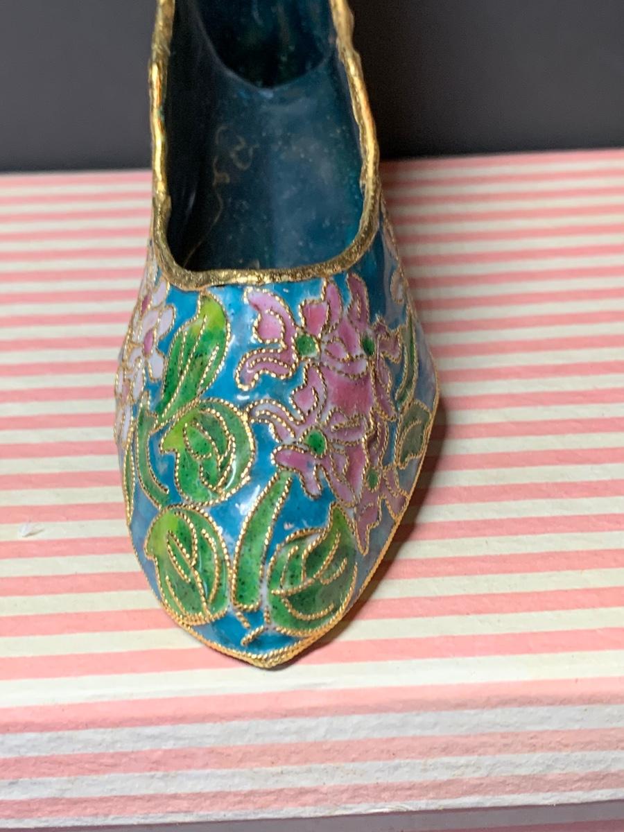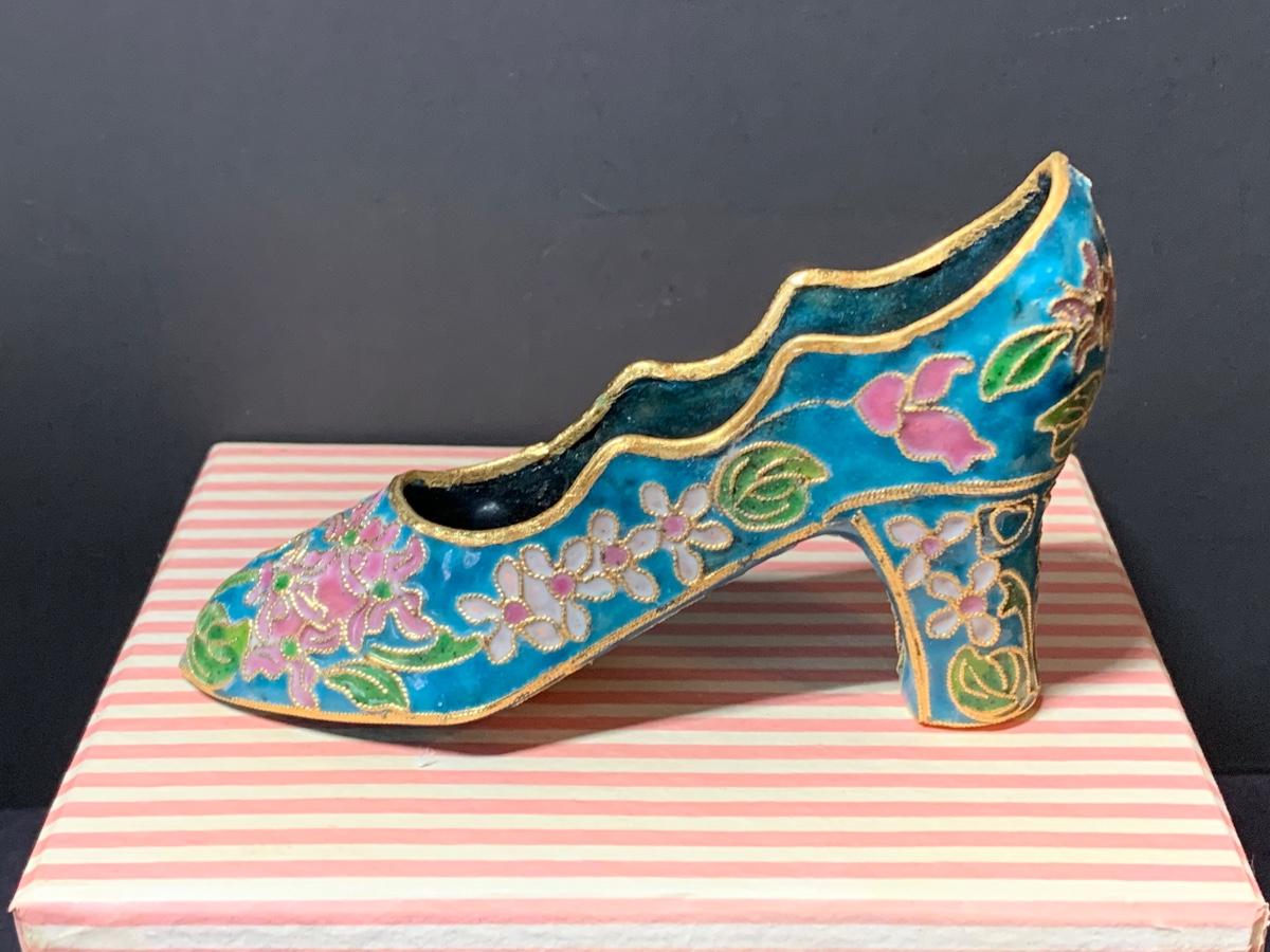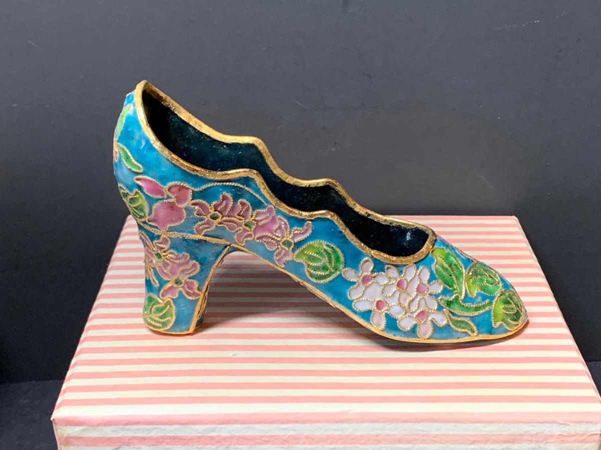 LOT 67R Victorian Enamelling/Cloisonné Style Shoe Ornaments w/ Boxes  & Ball Ornament w/Stand