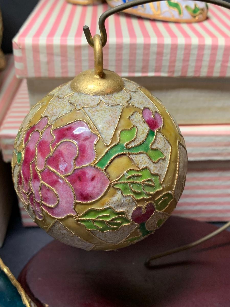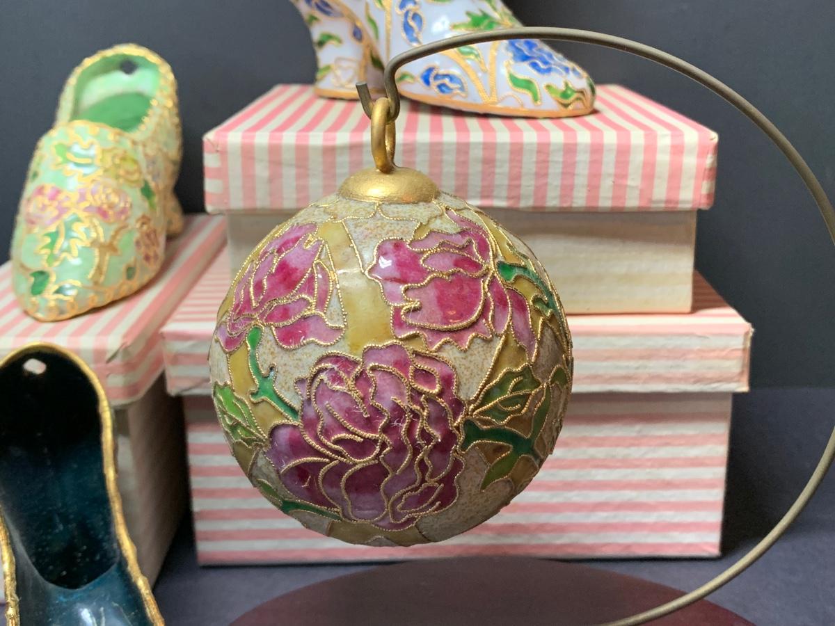 LOT 67R Victorian Enamelling/Cloisonné Style Shoe Ornaments w/ Boxes & Ball Ornament w/Stand