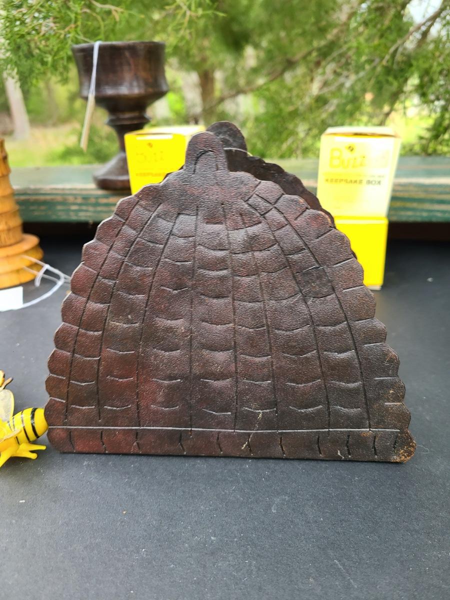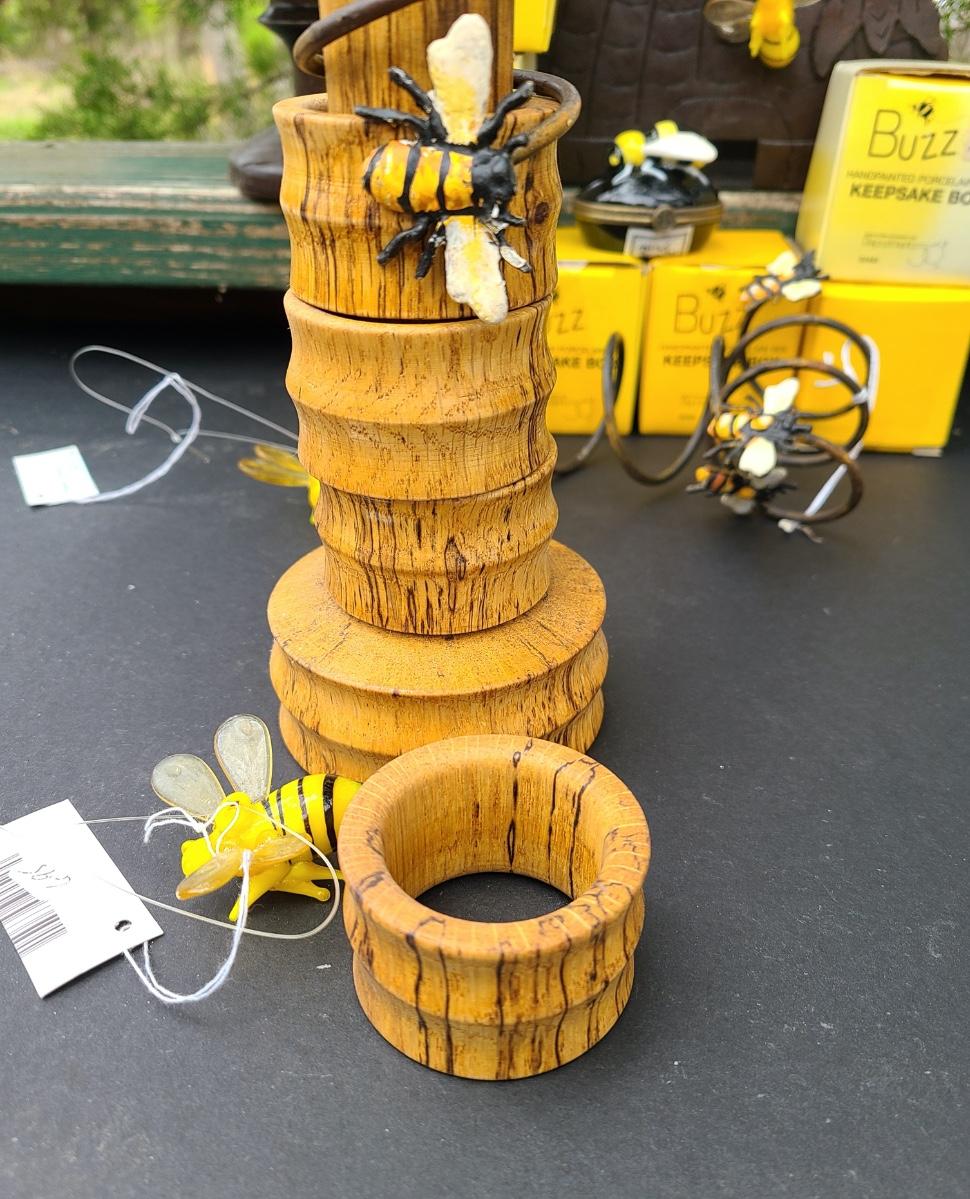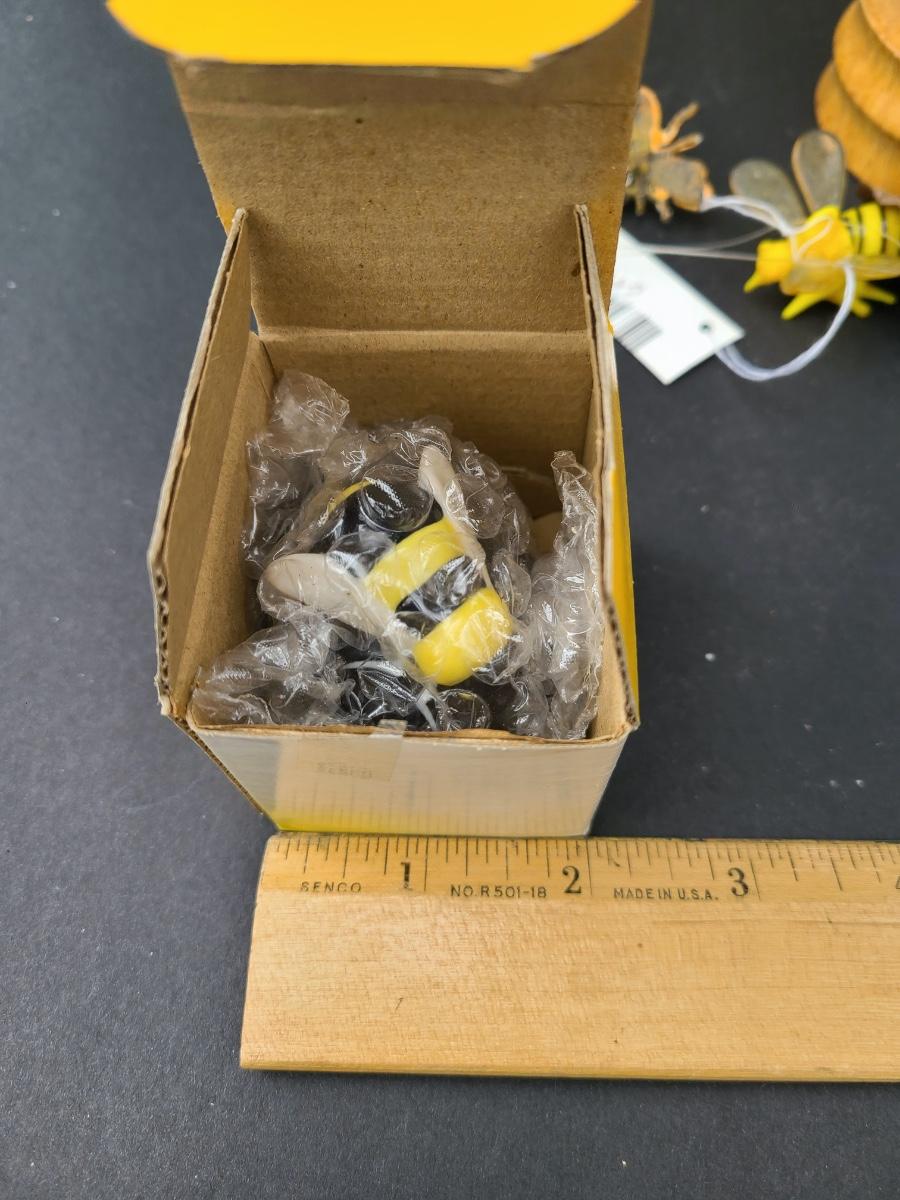Fun lot for decor or re-sell. New in the box, porcelain bee trinket boxes. Three napkin or candle rings with bees, a wood carved stand with wood napkin rings for four, wood turned candle stand, and heavy metal beehive napkin holder. Please see all pictures as they are the best representation of the items. The pictures show condition, measurements if taken, and what is included in the lot. Due to the large amount that we photograph and the time frame, we are not always able to take measurements. All items unless noted, are pre-owned and have been used. If you purchased furniture, you must bring help. We do not allow one person to carry large furniture out on their own. Bring help, tools and a truck for the safety of our client’s homes, and your personal safety. Any damages that result to the property including walls, and floors due to moving of the furniture will be charged to the buyer. Company policy. Thank you.
