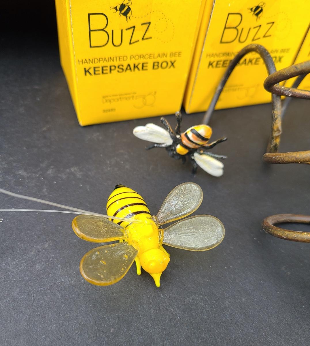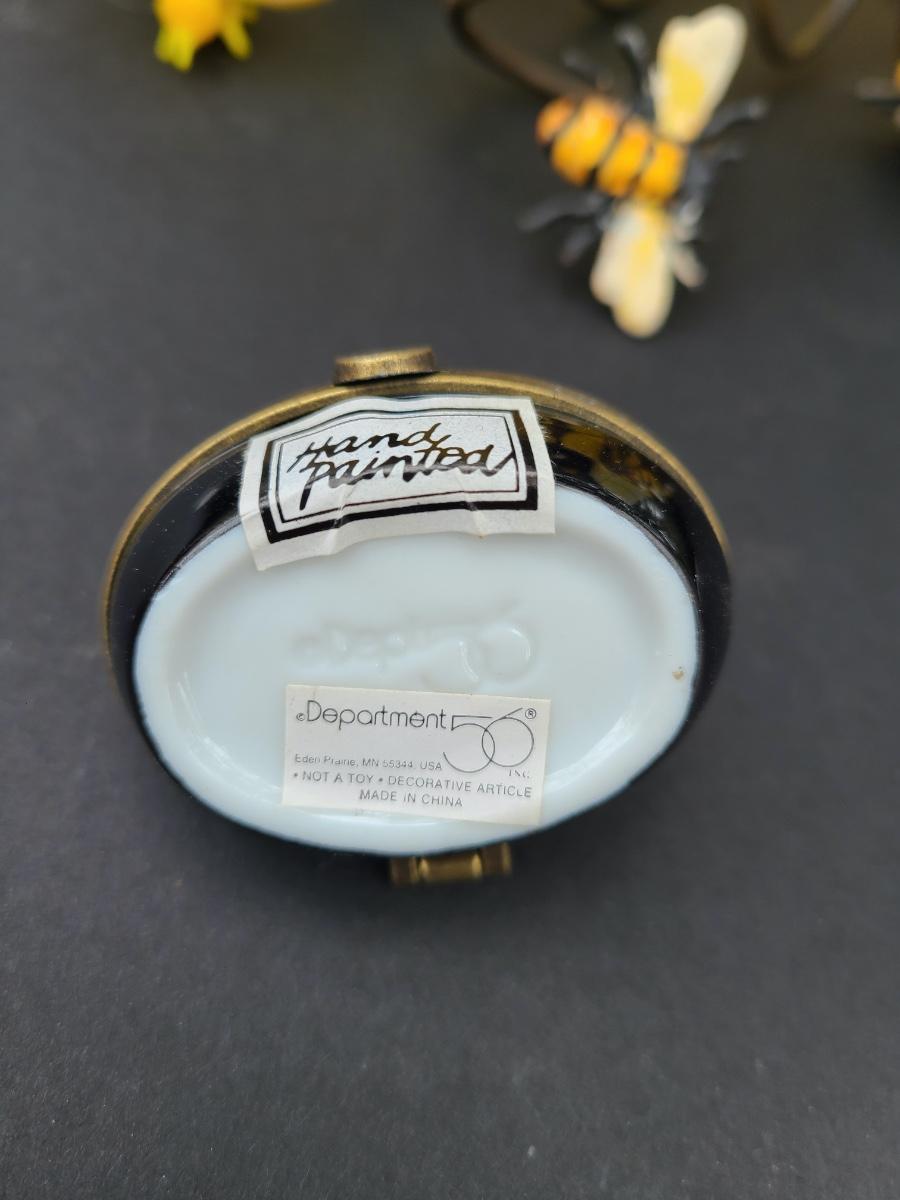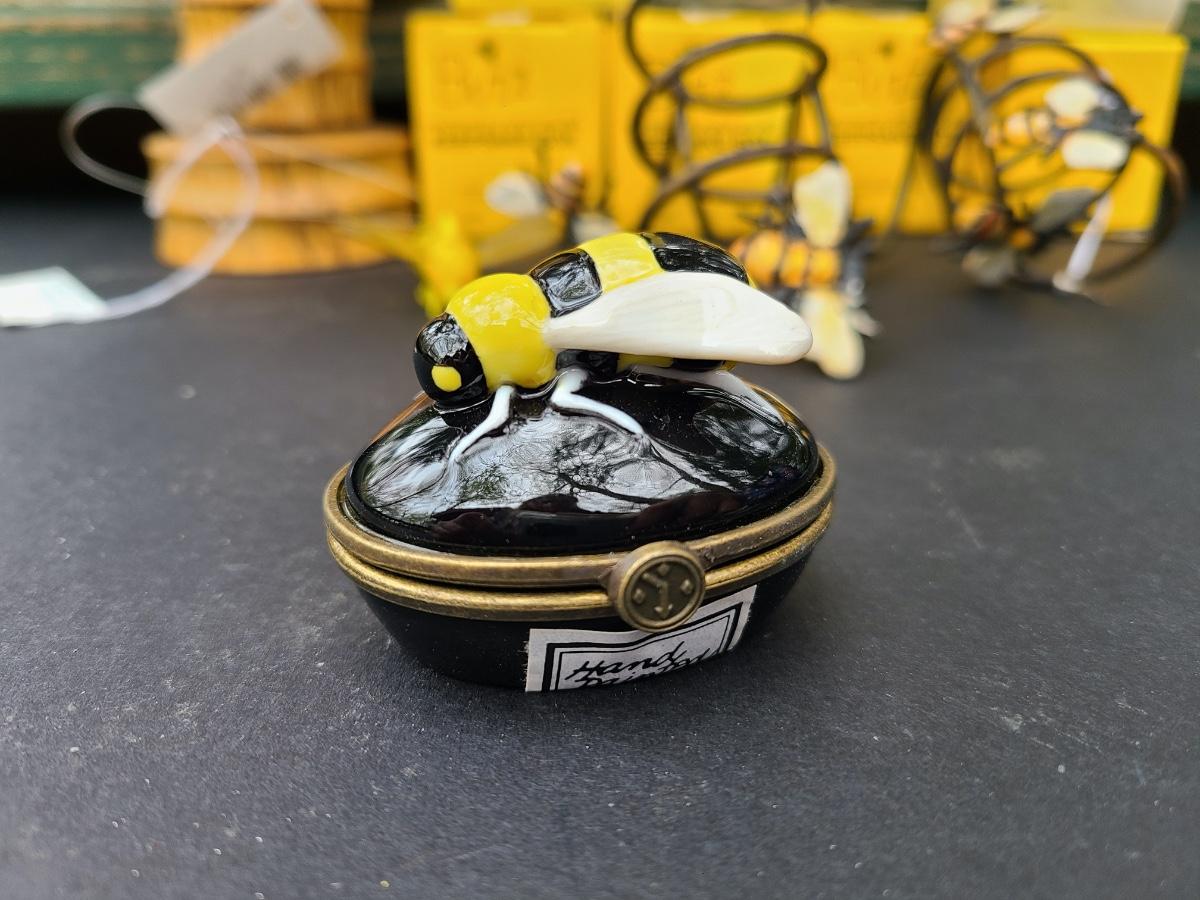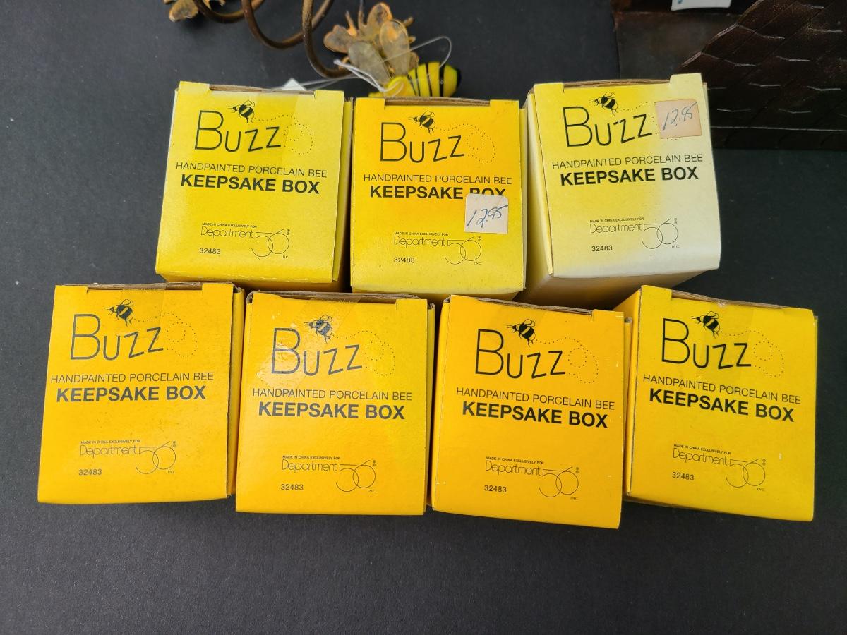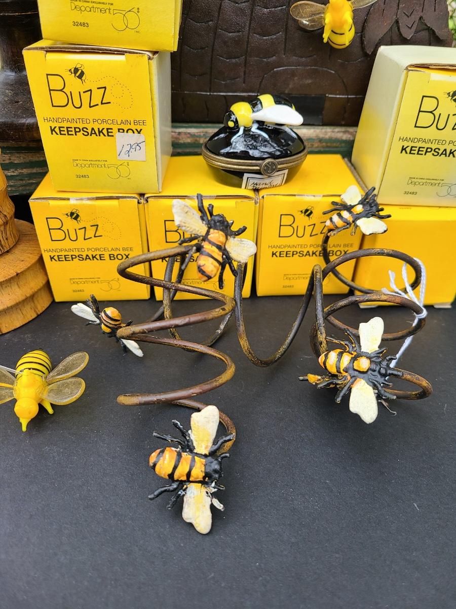LOT 106: Dept 56 Porcelain Bee Trinket Boxes, Glass Bees, Metal Beehive Napkin Holder and more