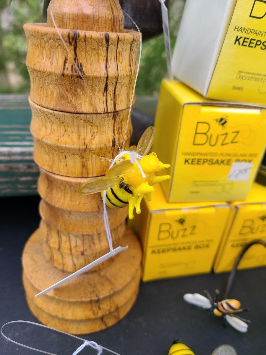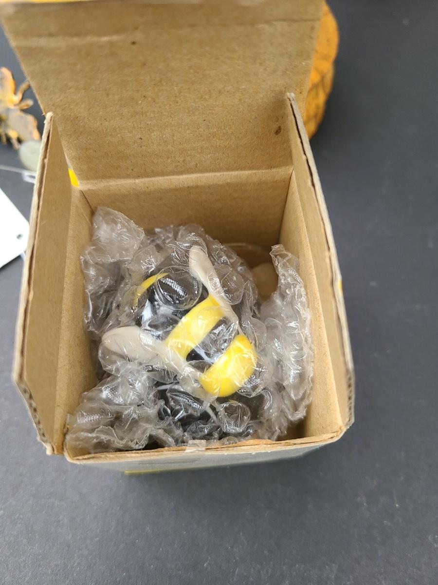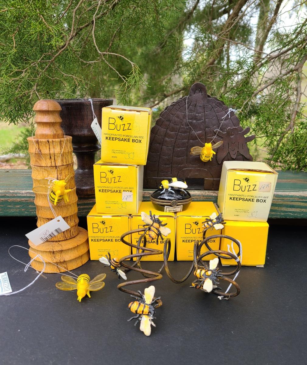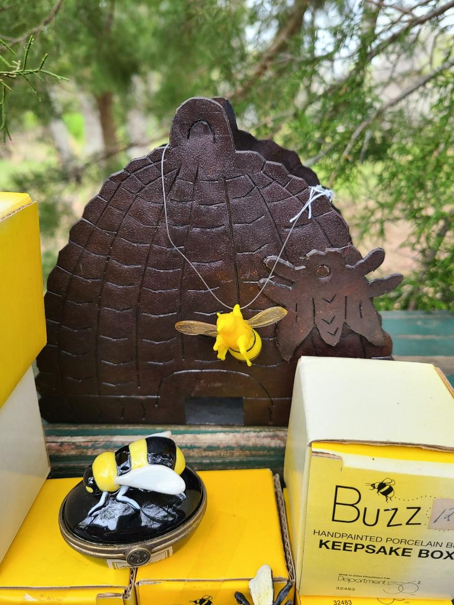 LOT 106: Dept 56 Porcelain Bee Trinket Boxes, Glass Bees, Metal Beehive Napkin Holder and more