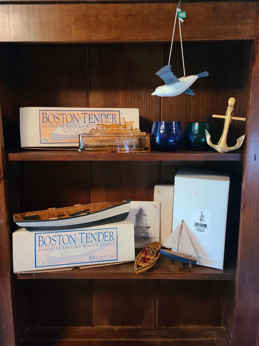 Store inventory, comes with two Boston Tenders, small wood model boat, two glass votive holders, wood carved seagull ornament, reproduction antique glass boat for jewelry or candy etc. Please see all pictures as they are the best representation of the items. The pictures show condition, measurements if taken, and what is included in the lot. Due to the large amount that we photograph and the time frame, we are not always able to take measurements. All items unless noted, are pre-owned and have been used. If you purchased furniture, you must bring help. We do not allow one person to carry large furniture out on their own. Bring help, tools and a truck for the safety of our client’s homes, and your personal safety. Any damages that result to the property including walls, and floors due to moving of the furniture will be charged to the buyer. Company policy. Thank you.