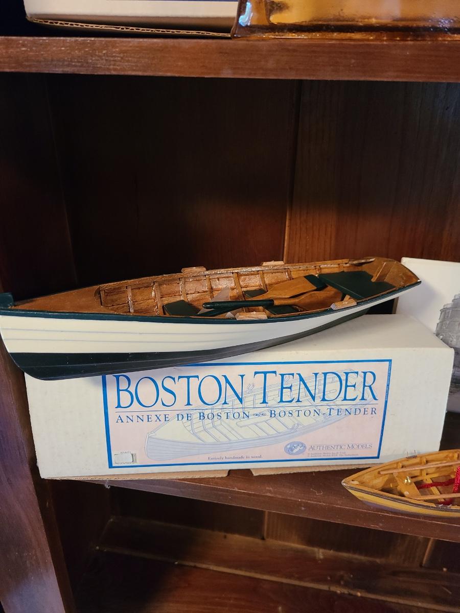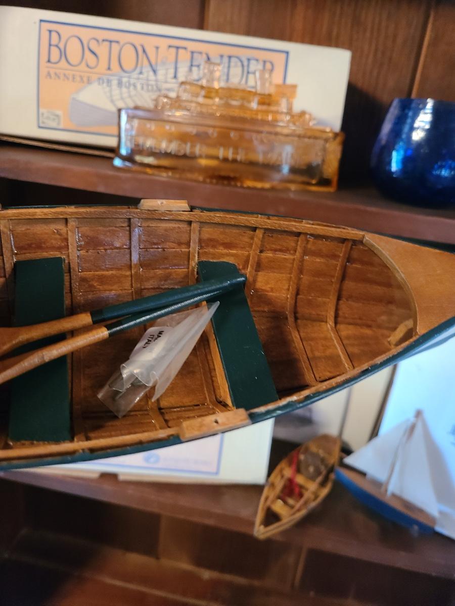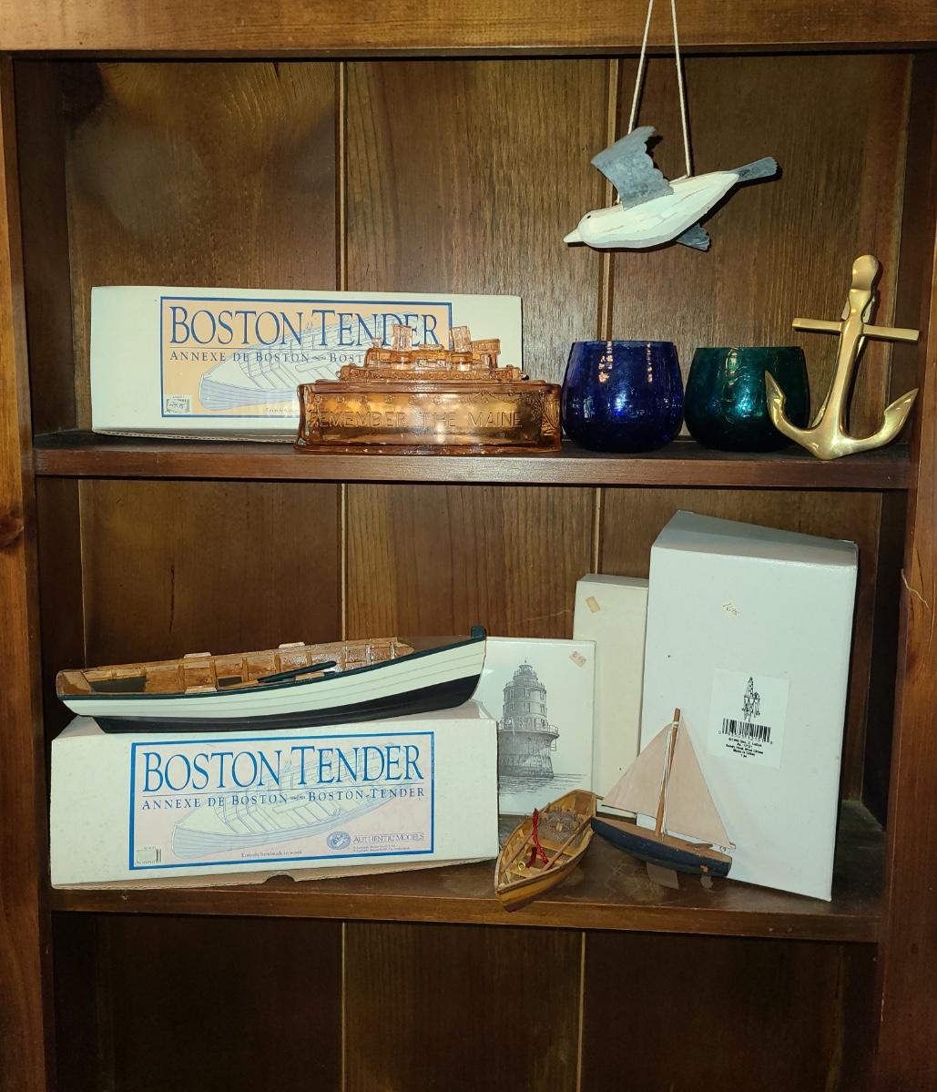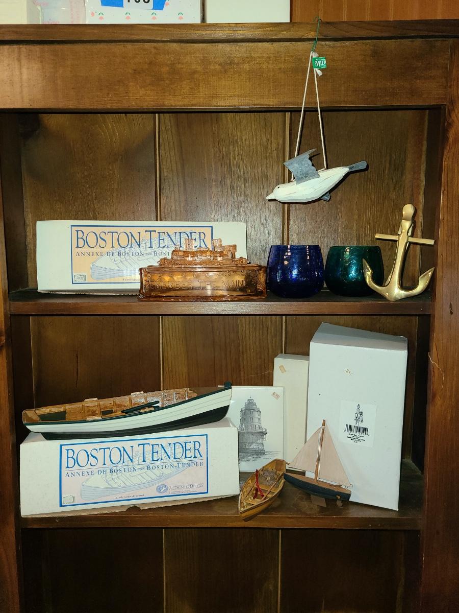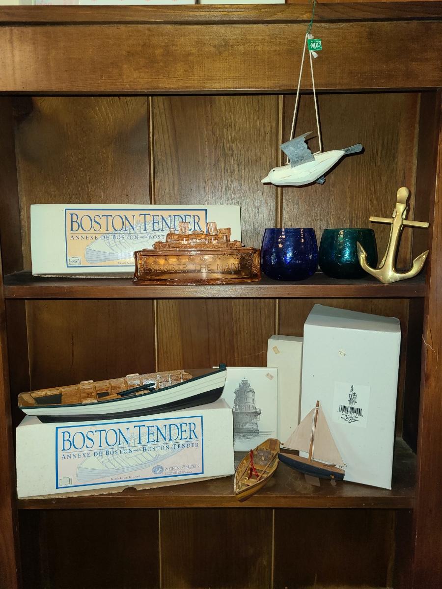 LOT 110C: Boston Tender Wood Model Boats, Brass Anchor Knocker, Pink Glass Ship Trinket Dish and More