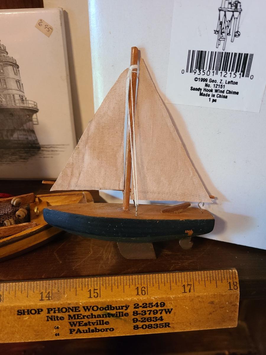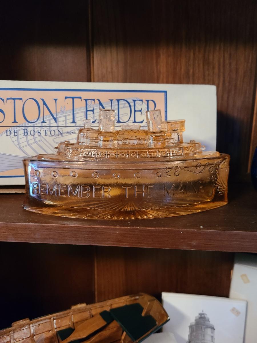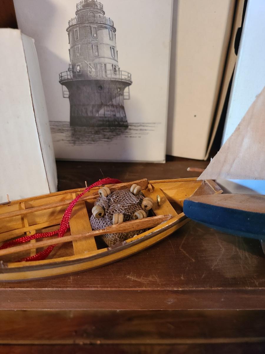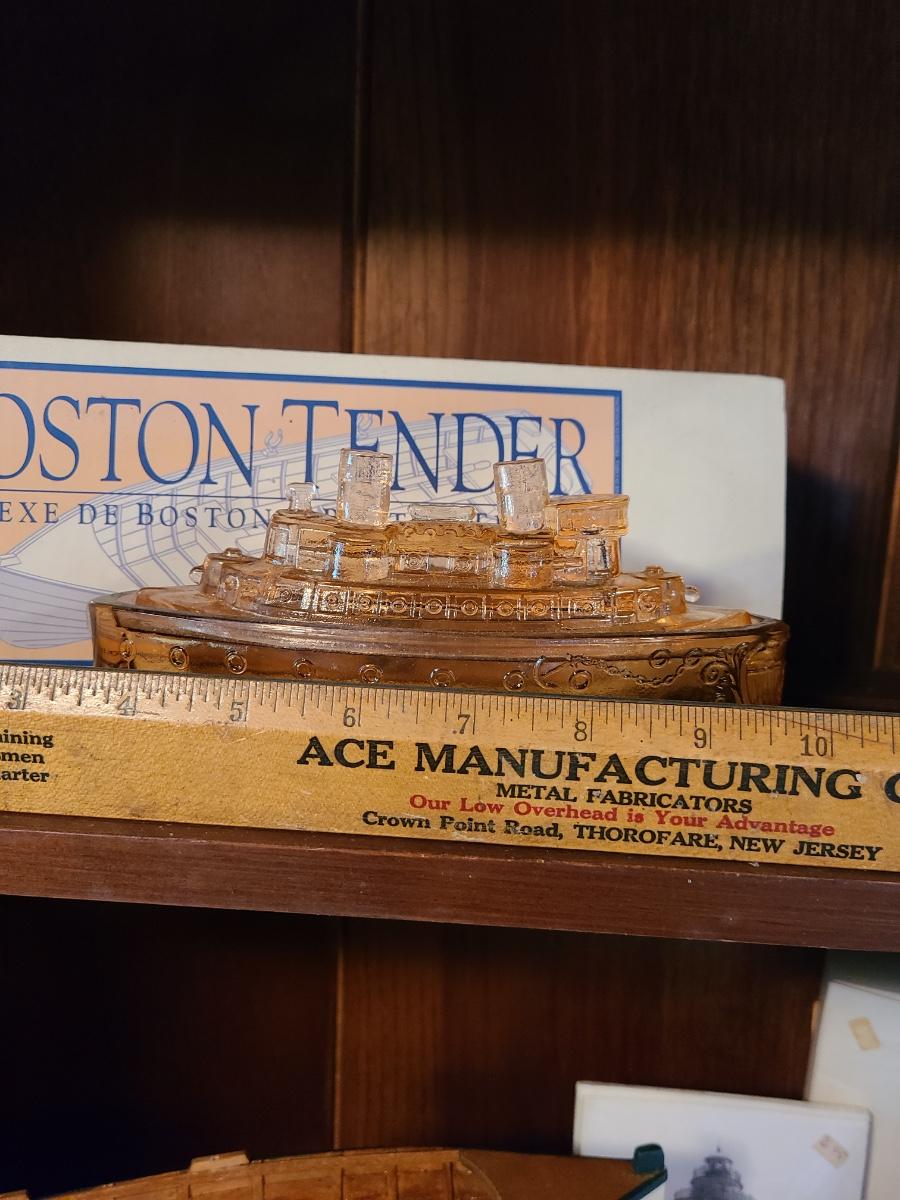 LOT 110C: Boston Tender Wood Model Boats, Brass Anchor Knocker, Pink Glass Ship Trinket Dish and More