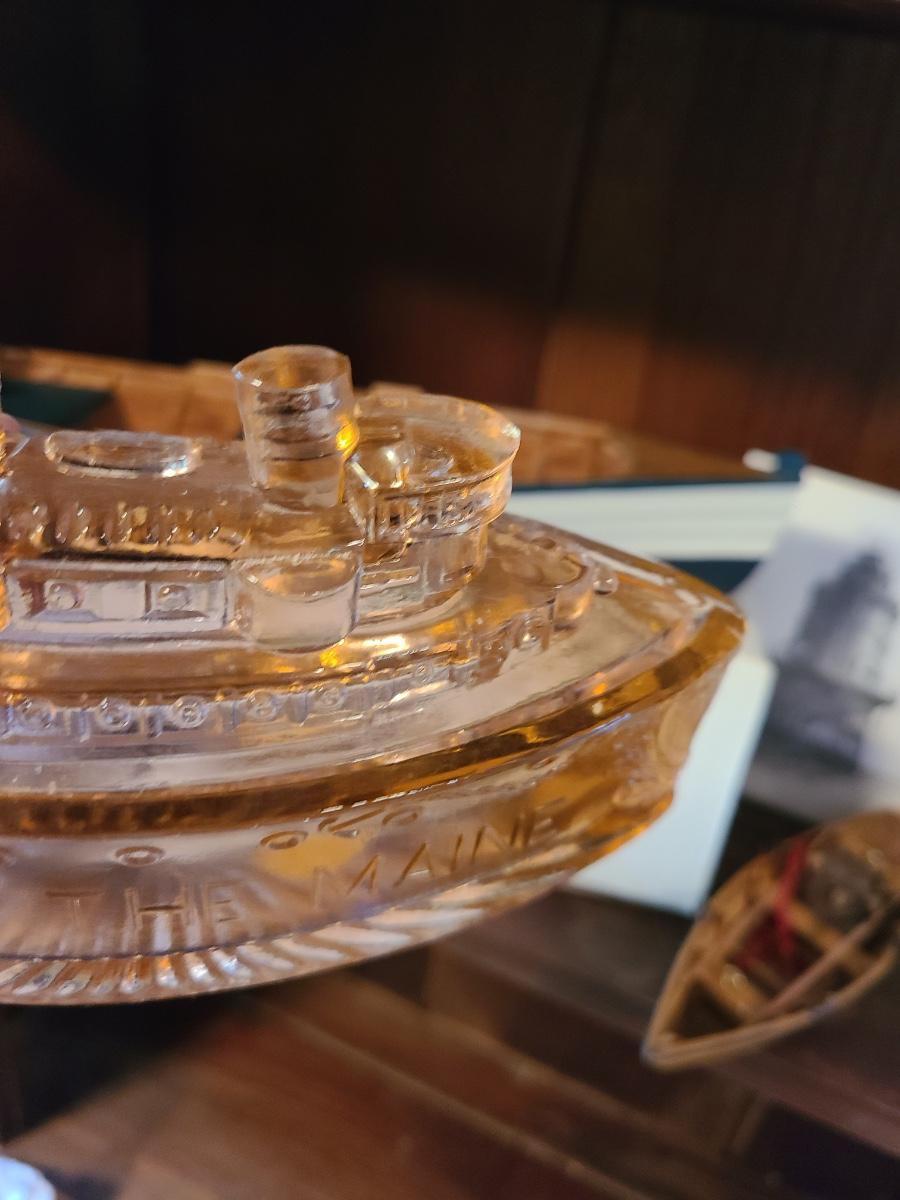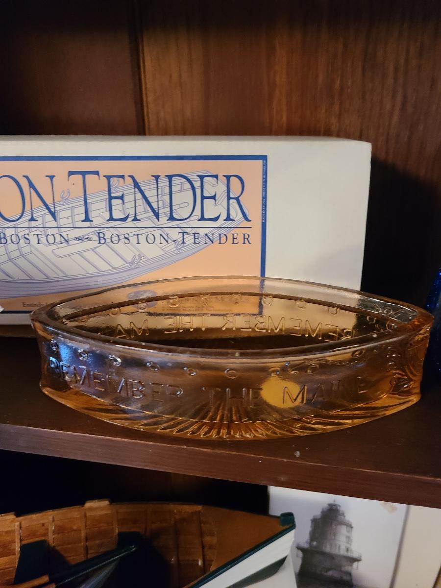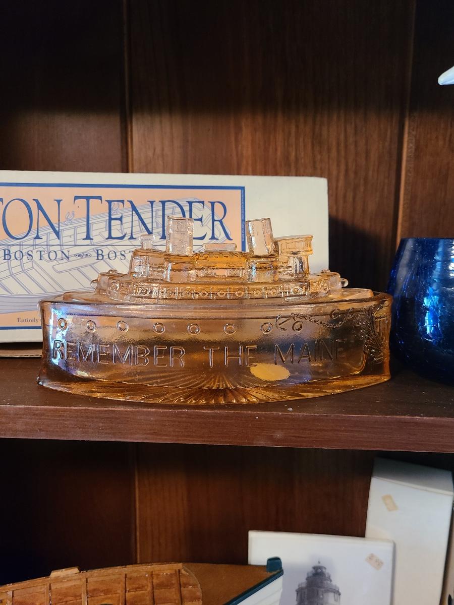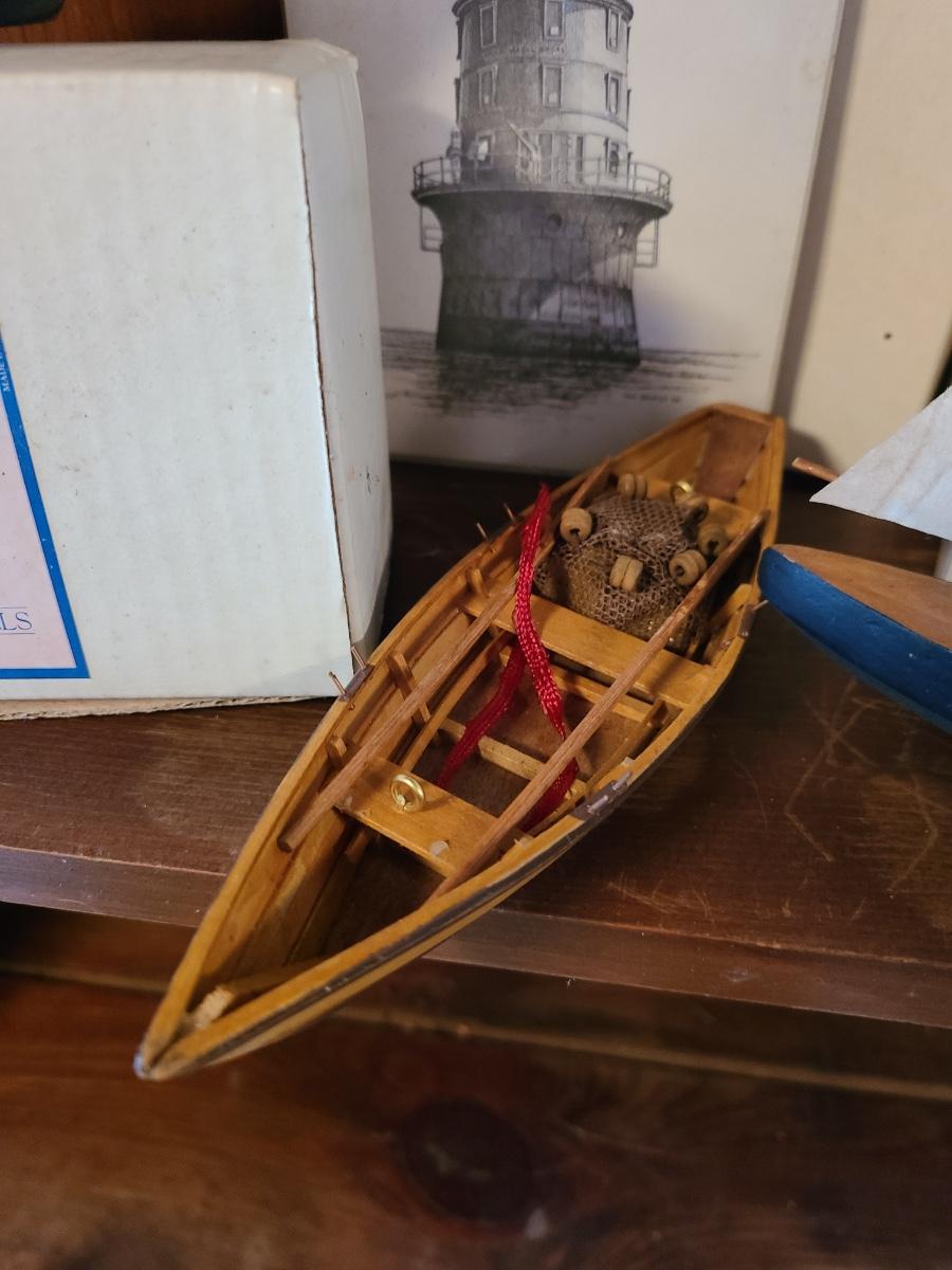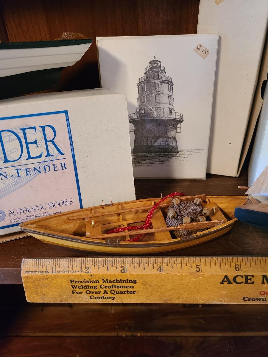 LOT 110C: Boston Tender Wood Model Boats, Brass Anchor Knocker, Pink Glass Ship Trinket Dish and More