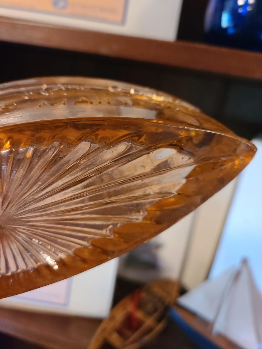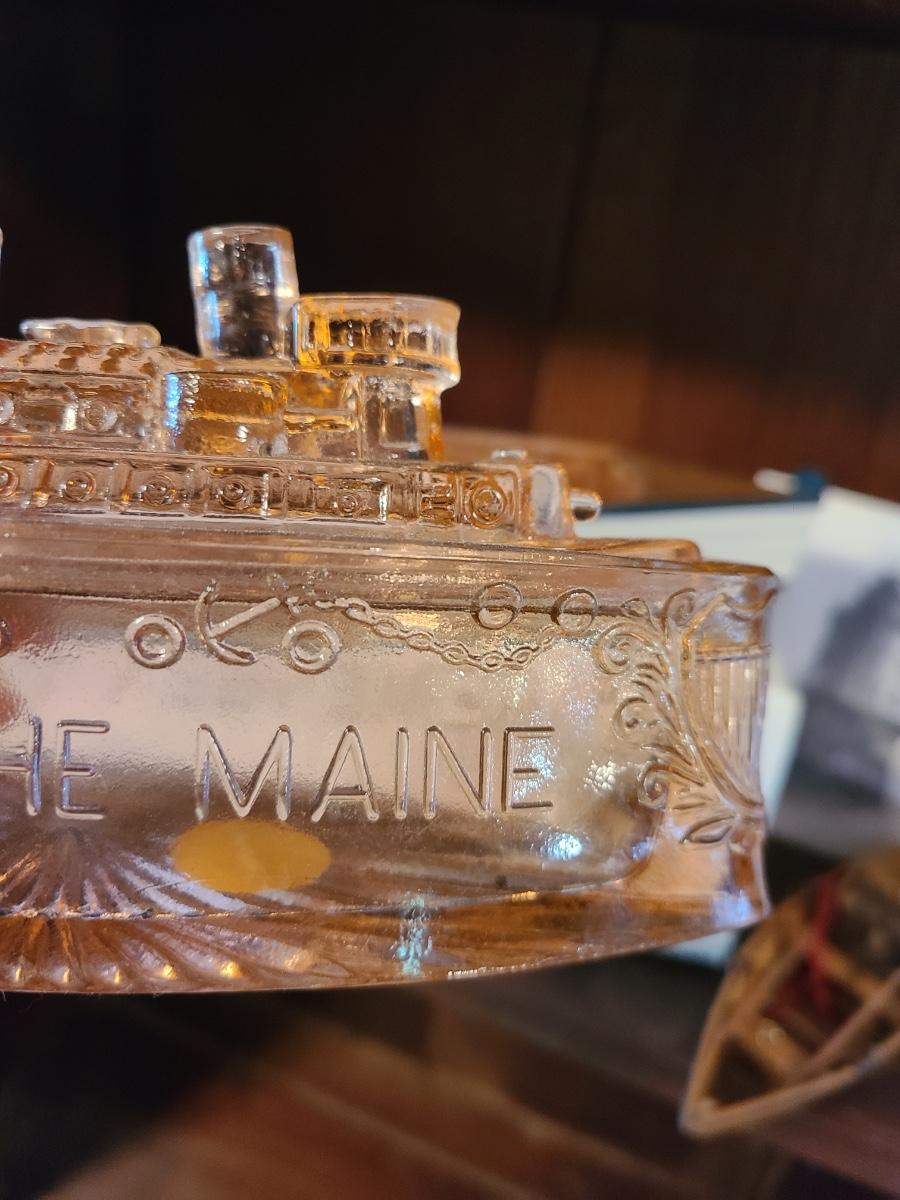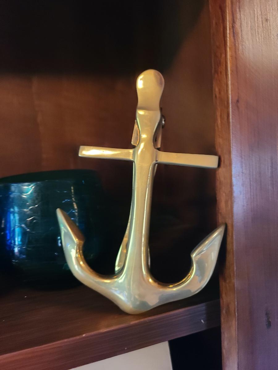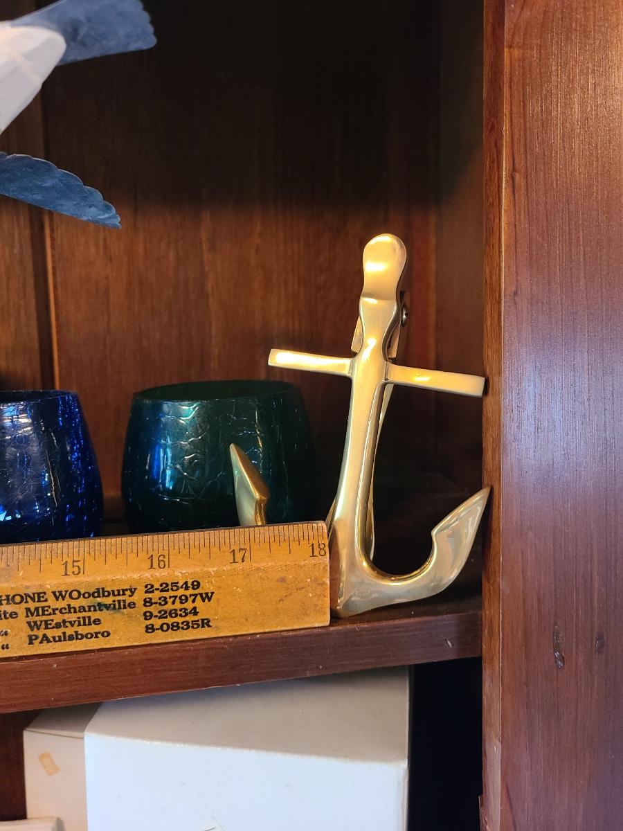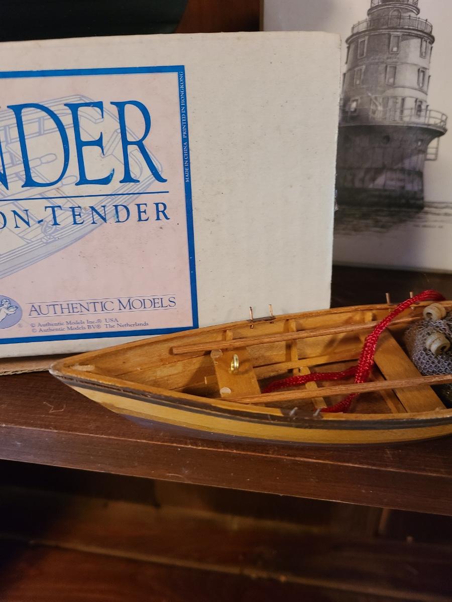 LOT 110C: Boston Tender Wood Model Boats, Brass Anchor Knocker, Pink Glass Ship Trinket Dish and More