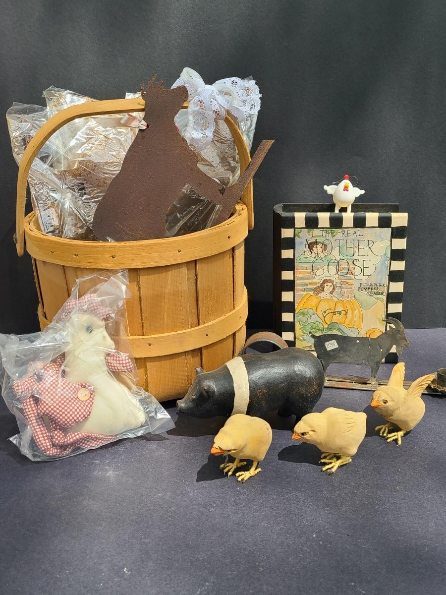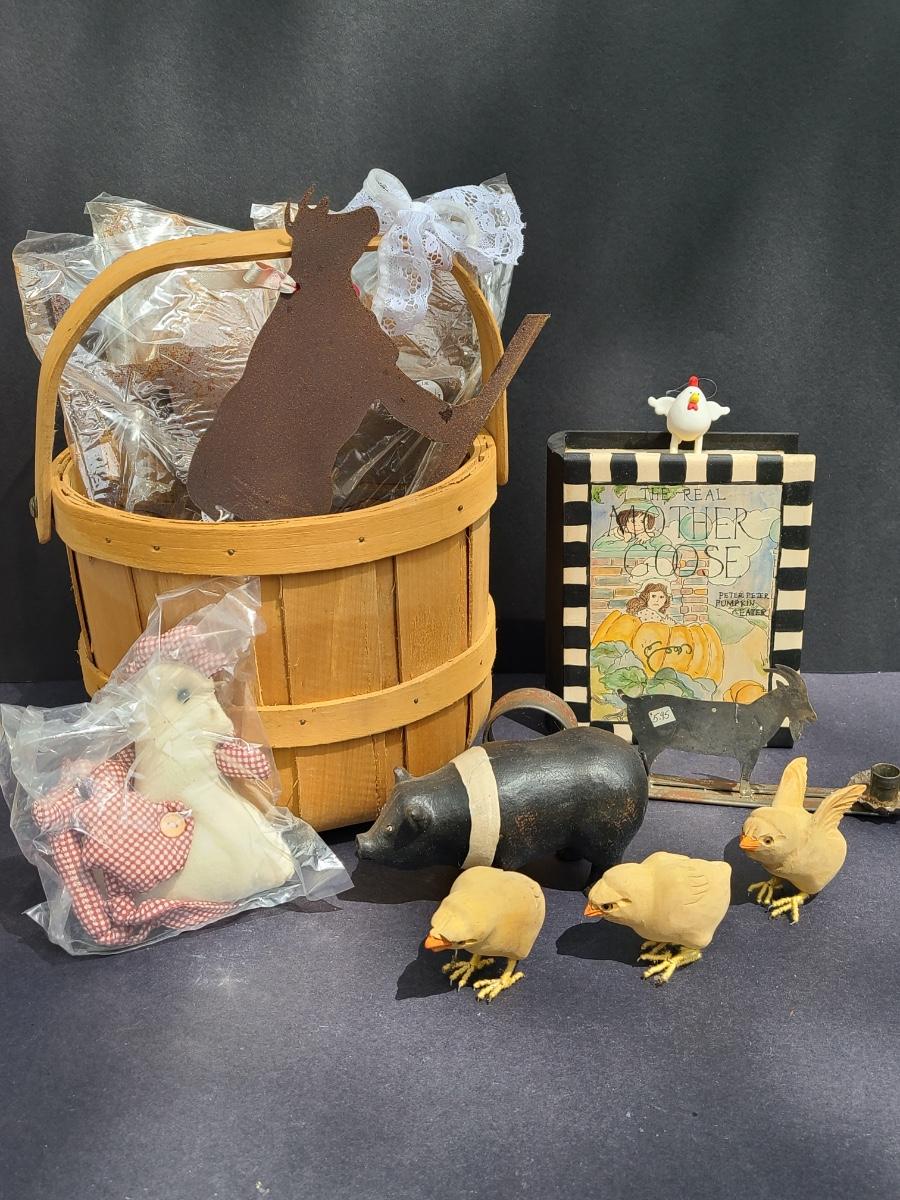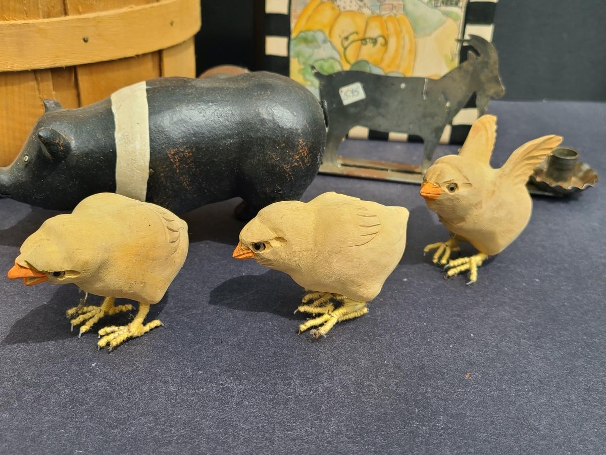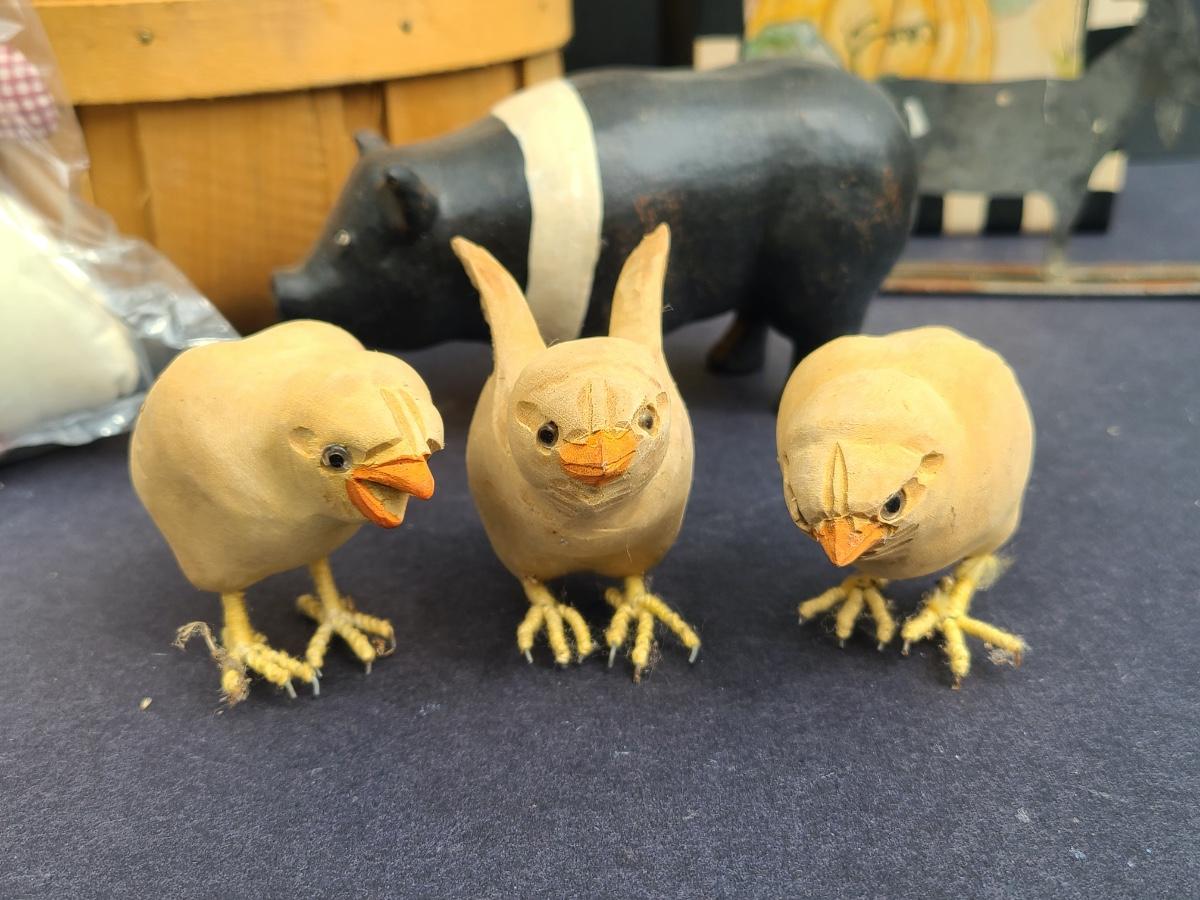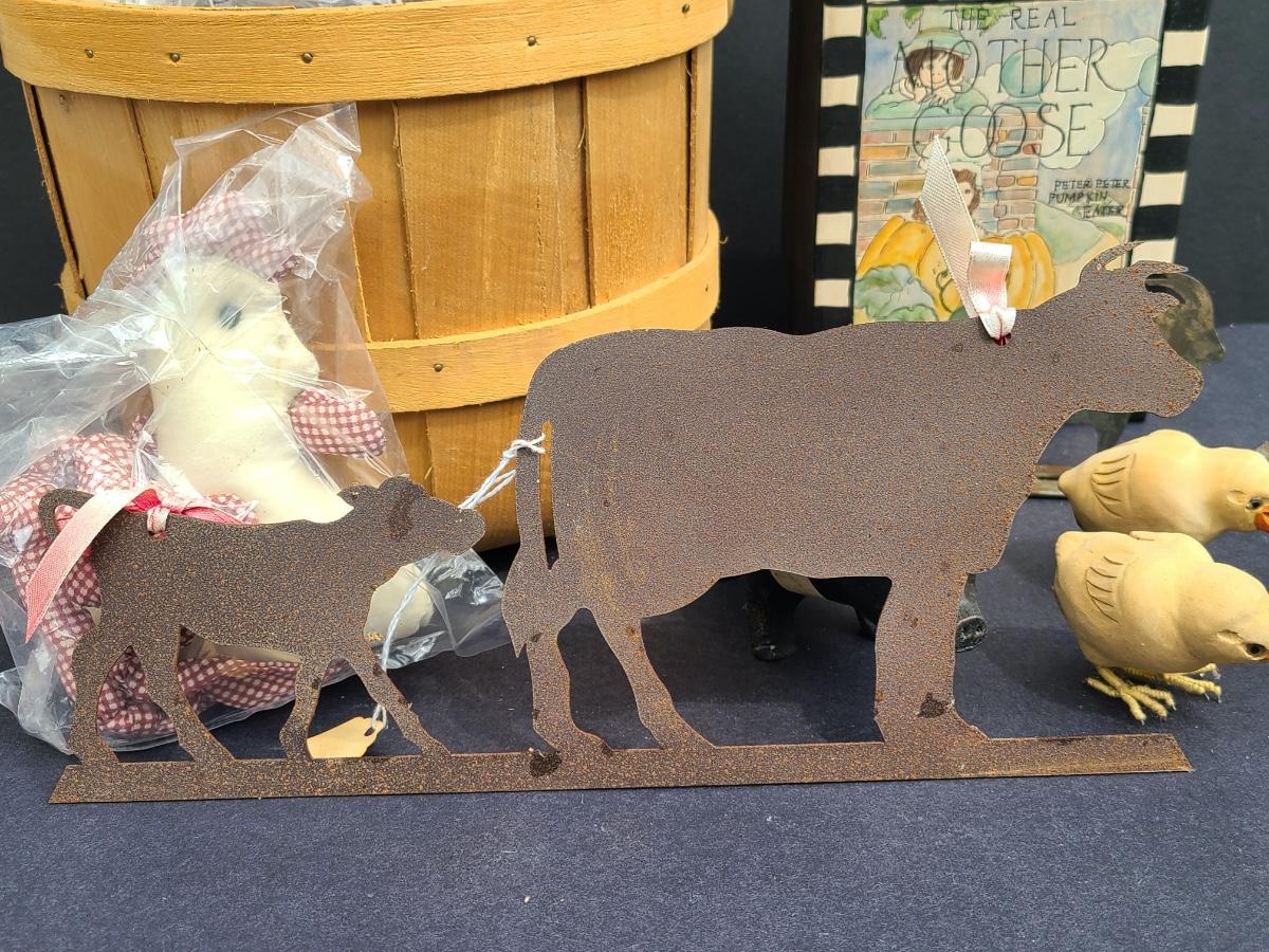 LOT 113C: Dept 56 Wood Chicks, Metal Cows Wall Signs, Painted Box, and Chicken Ornaments