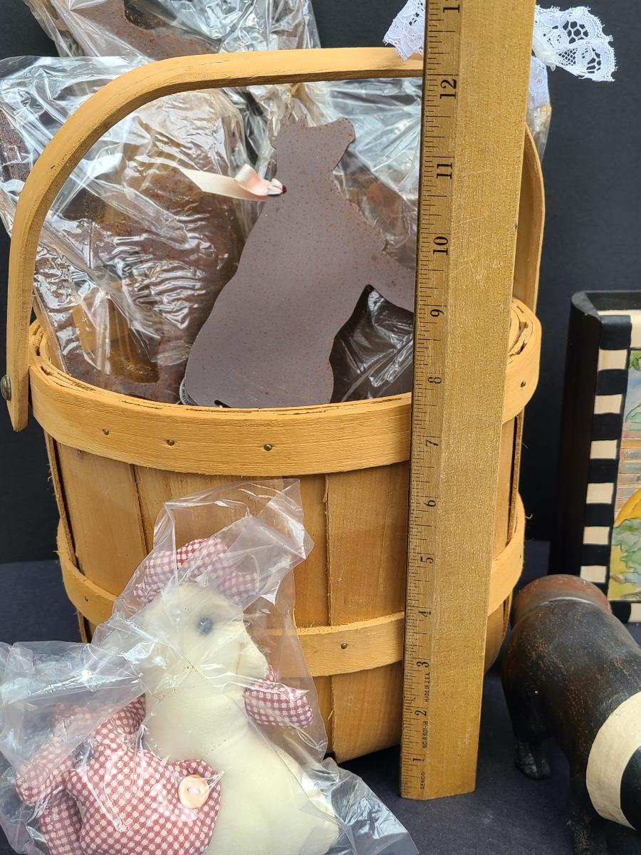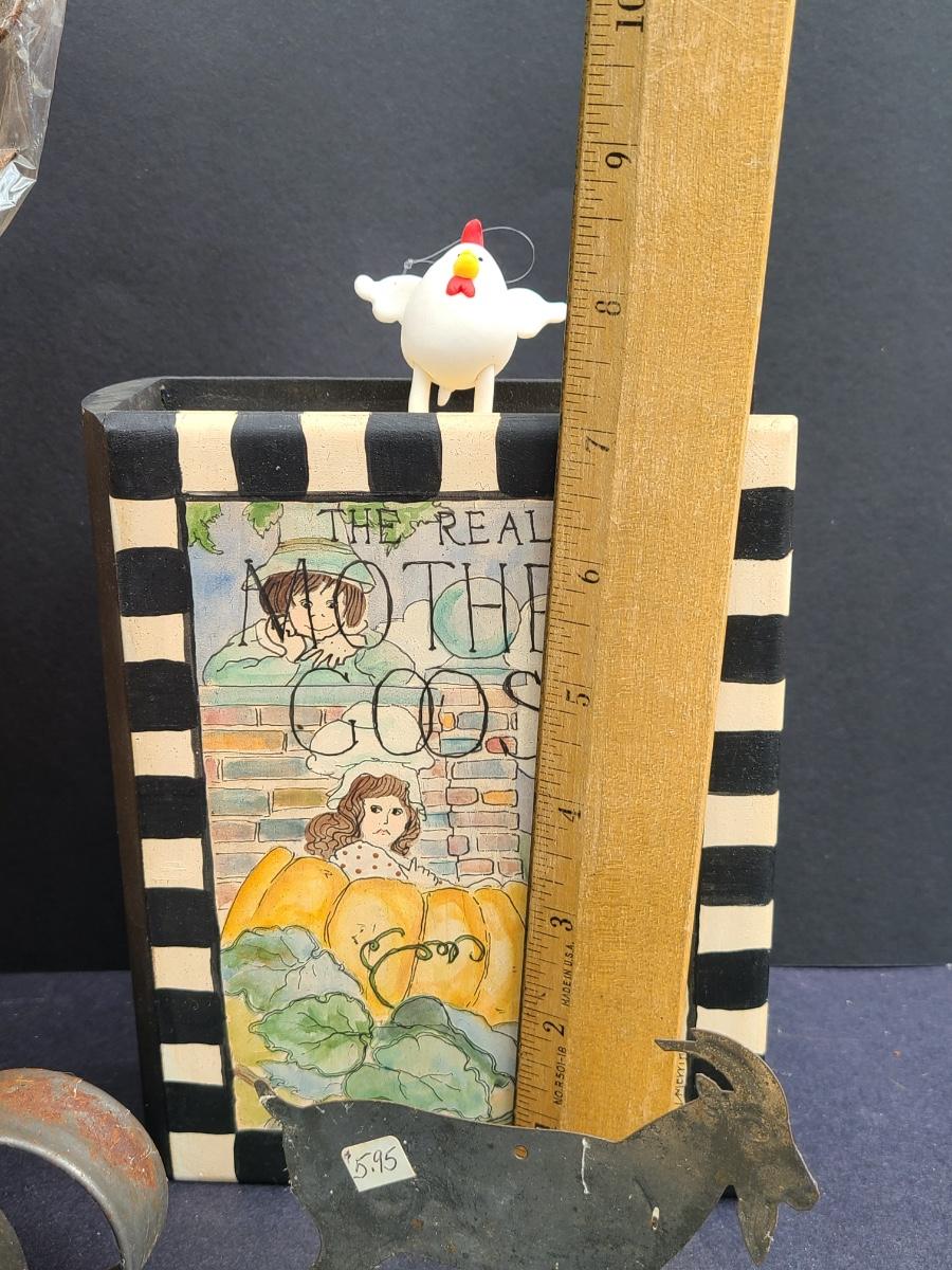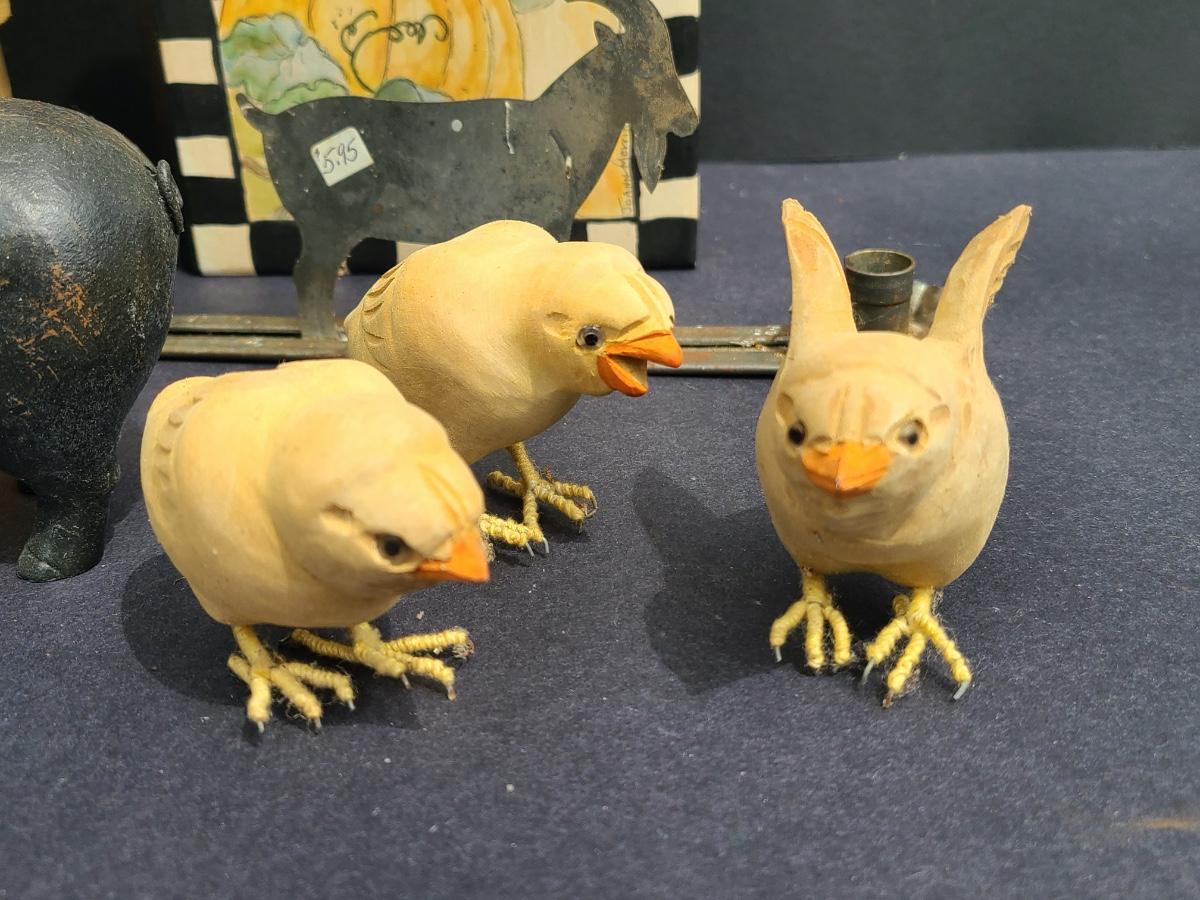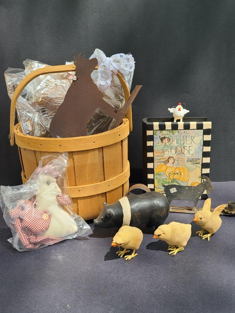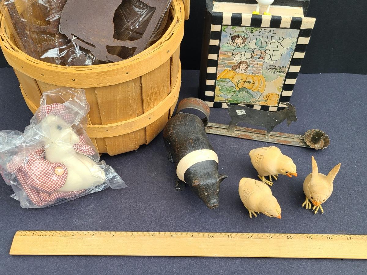LOT 113C: Dept 56 Wood Chicks, Metal Cows Wall Signs, Painted Box, and Chicken Ornaments