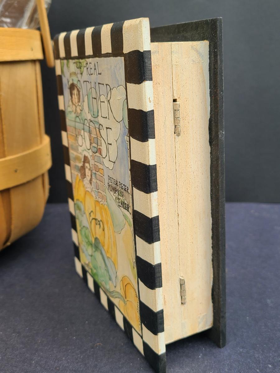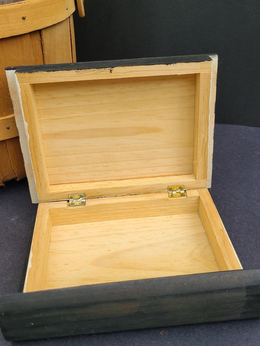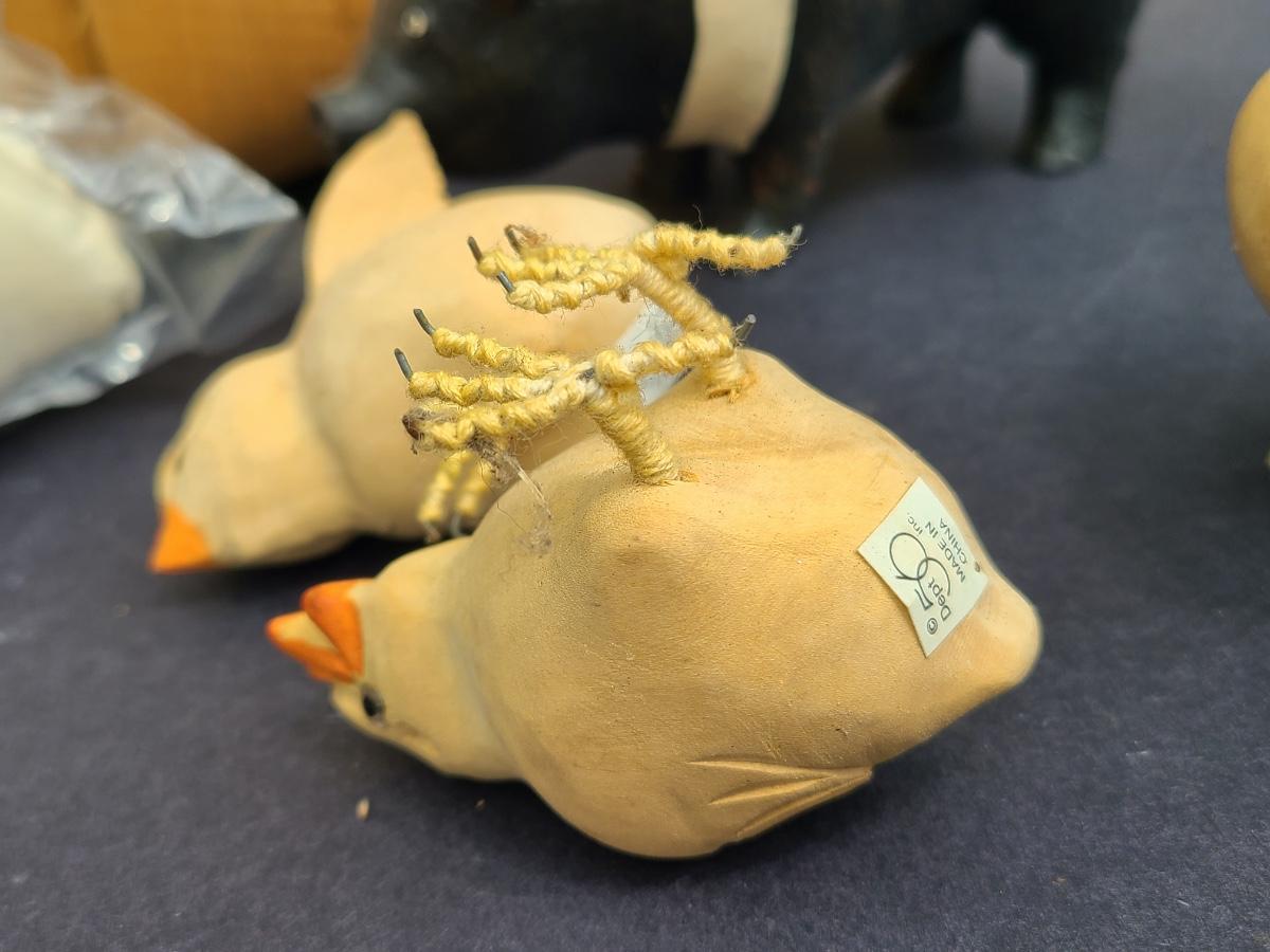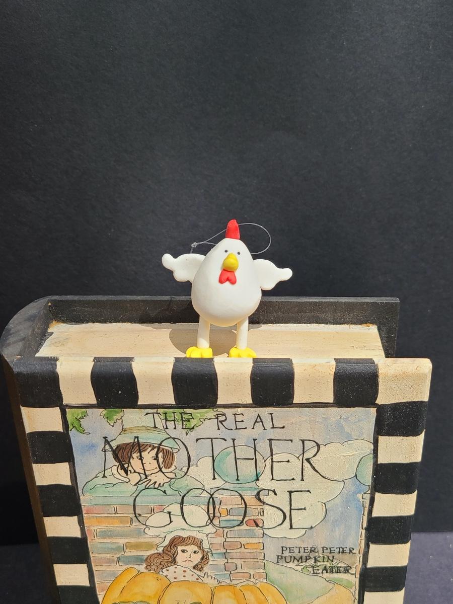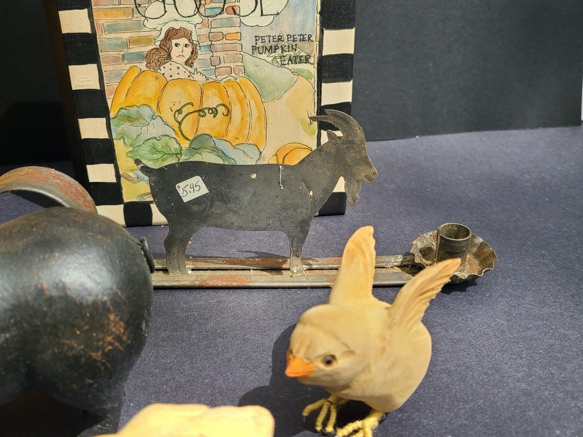 LOT 113C: Dept 56 Wood Chicks, Metal Cows Wall Signs, Painted Box, and Chicken Ornaments