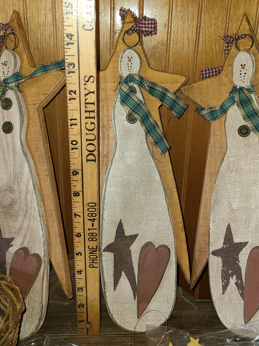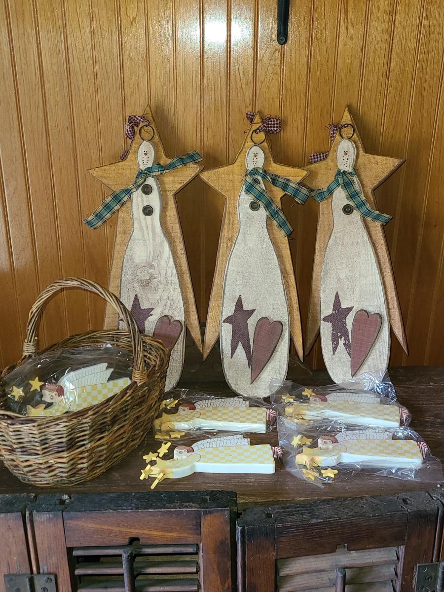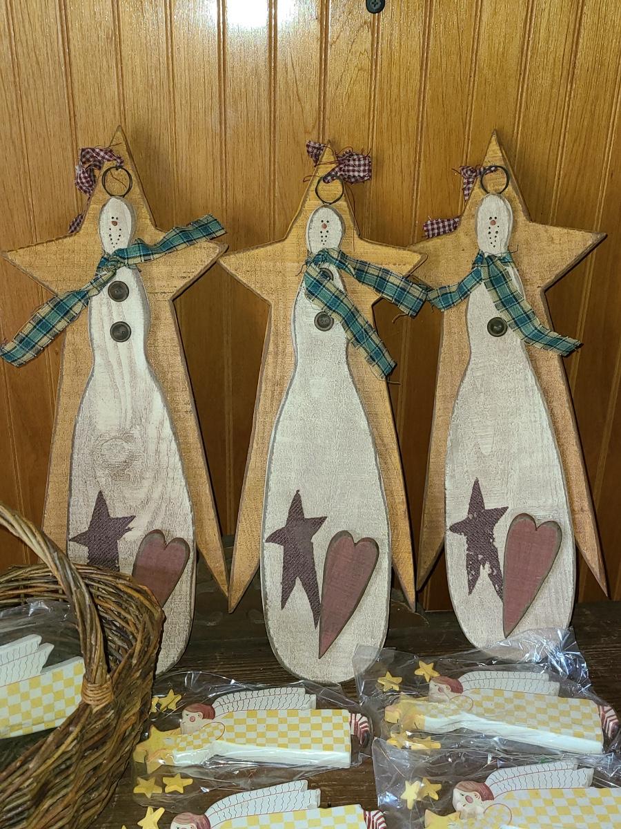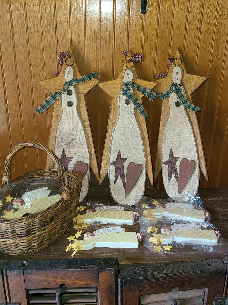 LOT 122C: New Wood Carved Snowman hanging Wall Art, and Angel Ornaments