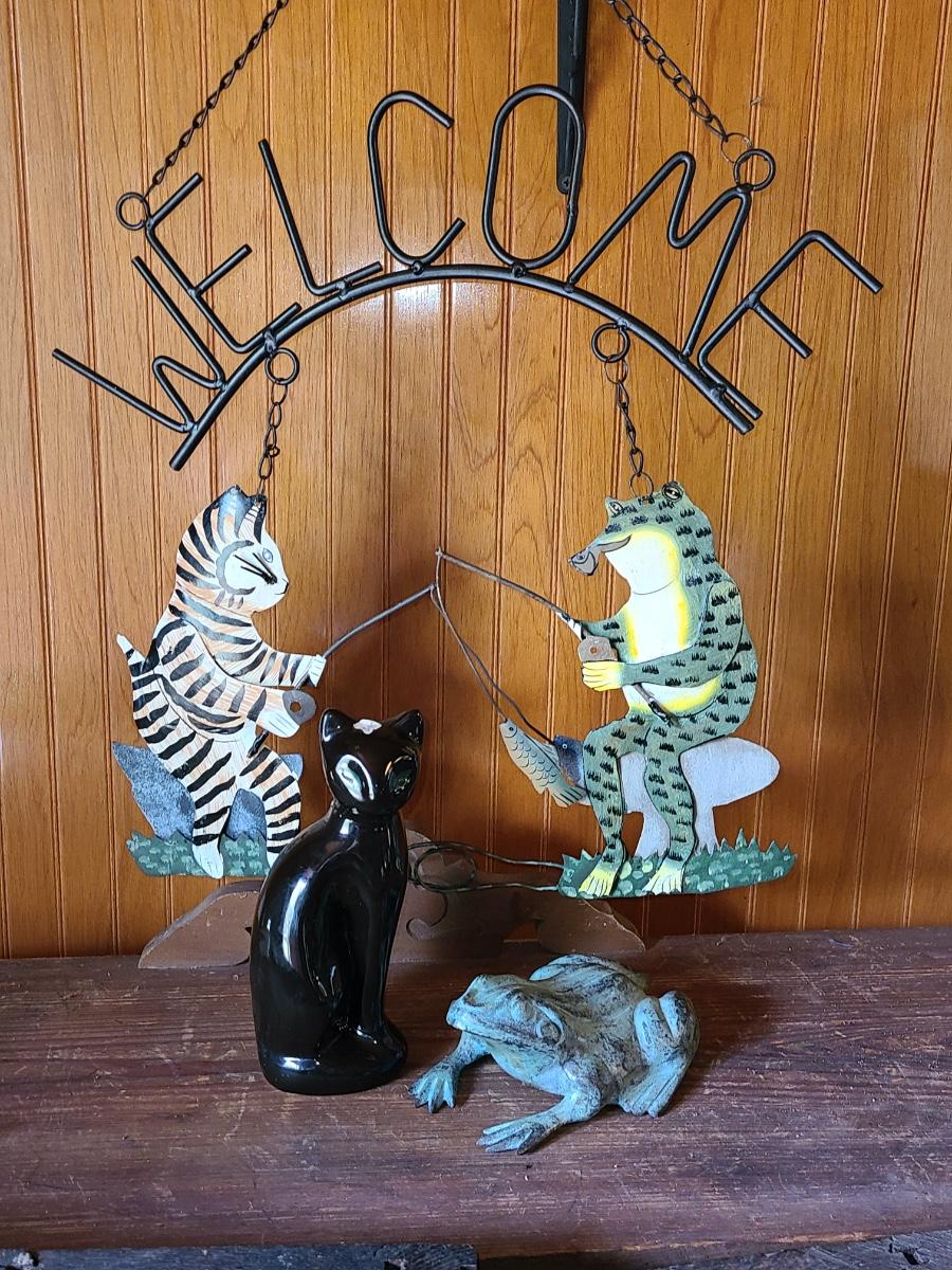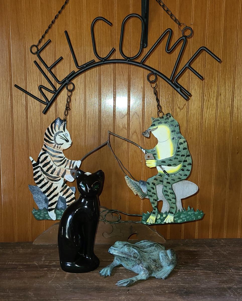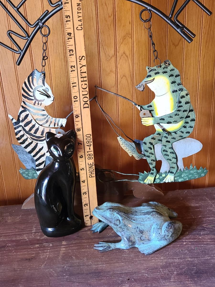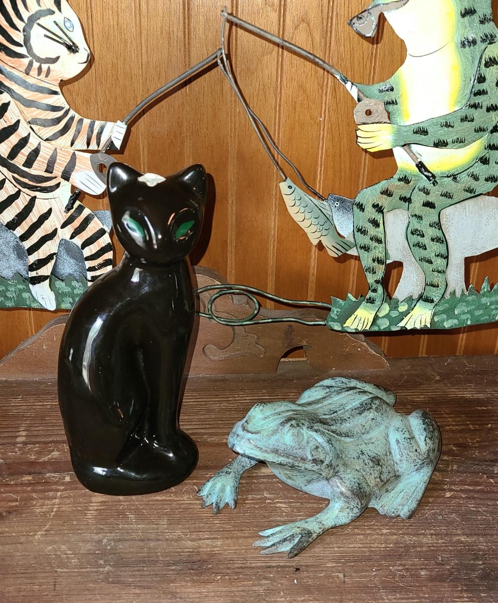 LOT 1234: Two Metal Signs (Cat/Frog Fishing)/Dept 56 Metal Frog/Ceramic Vintage Cat